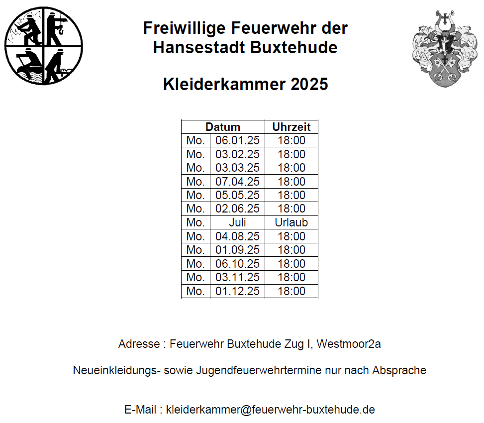 Die Kleiderkammer der Buxtehuder Feuerwehren befindet sich im Feuerwehrhaus des Zuges I im Westmoor. Sie ist zuständig für die Einkleidung aller Einsatzkräfte und Jugendfeuerwehrmitglieder mit persönlicher Schutzausrüstung. Dort werden Neueinkleidungen und der Wechsel von verschlissener Kleidung vorgenommen.
