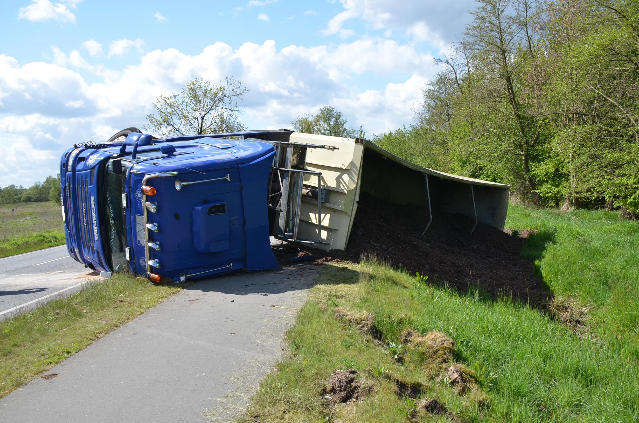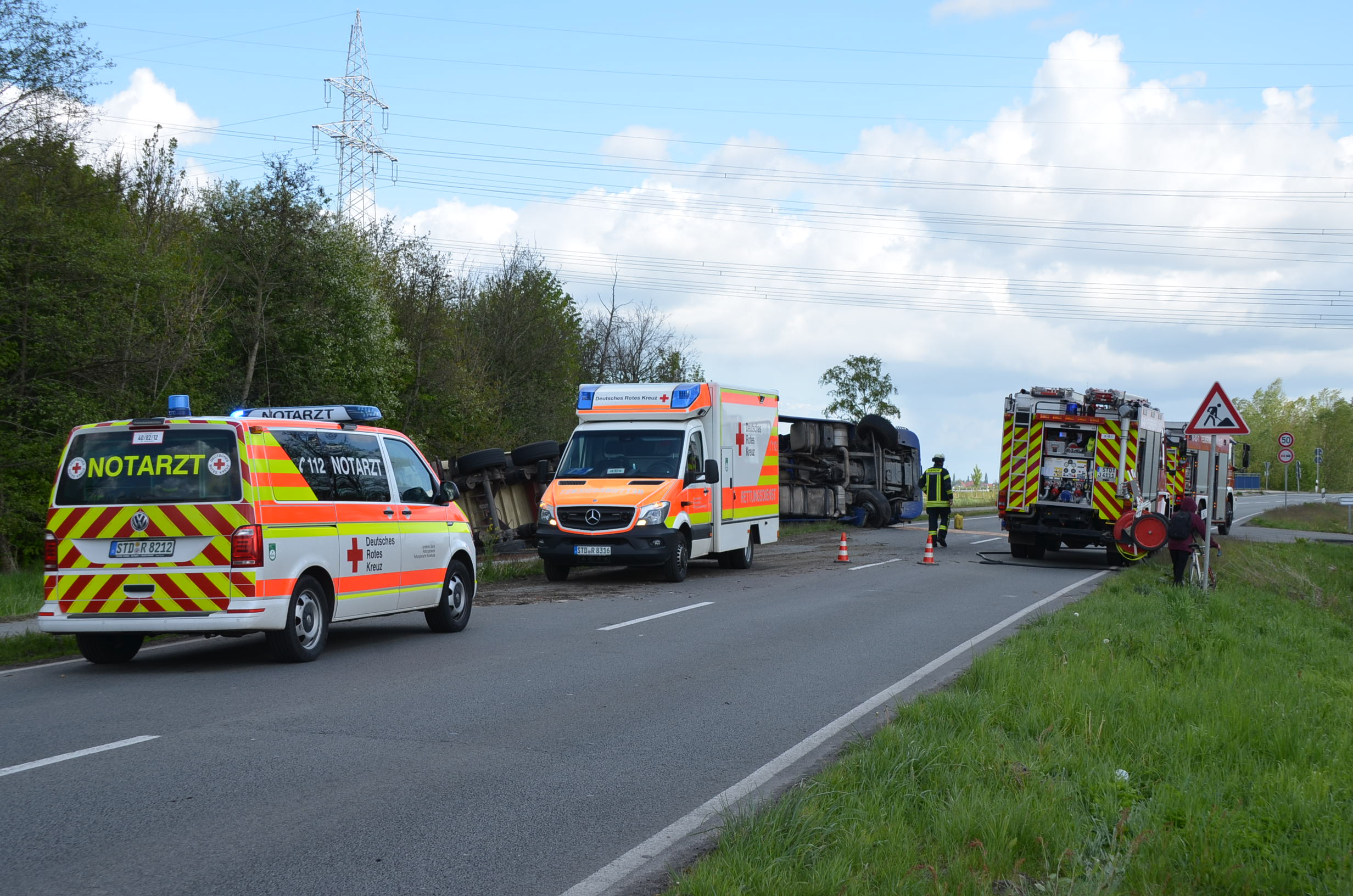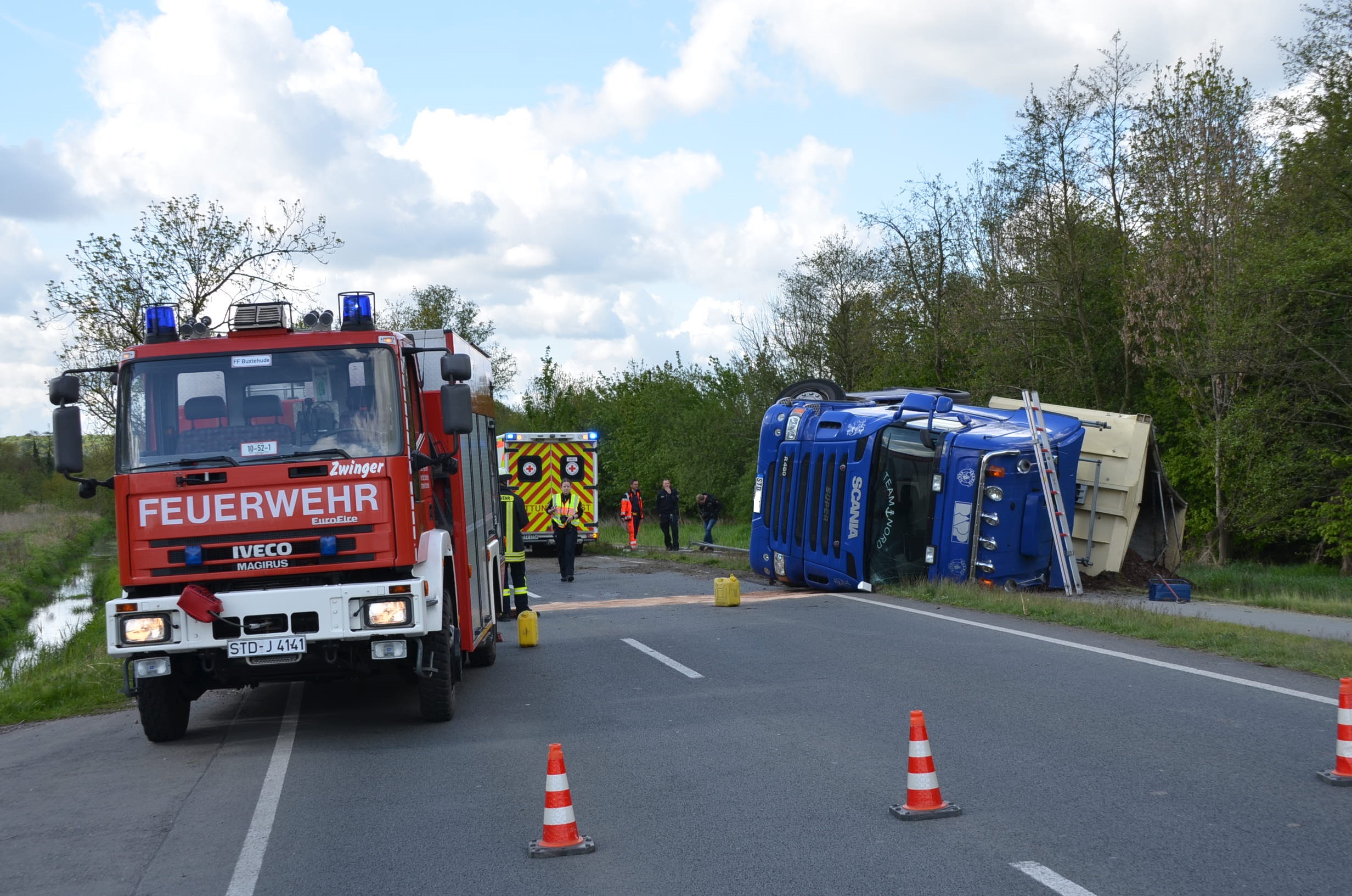 So lautete am Dienstagvormittag das Stichwort für die Alarmierung der Ortsfeuerwehren Dammhausen und Buxtehude (Zug I) zu einer technischen Hilfeleistung auf die Kreisstraße 26, in der Nähe der Autobahnauffahrt Jork. Dort war ein Kipp-Sattelzug aus Dammhausen kommend aus noch nicht geklärter Ursache auf die Gegenfahrbahn gekommen und in den dortigen Seitenstreifen gerutscht. Dabei kippte das gesamte Fahrzeug auf die Seite. Die Ladung, Pilzkompost, ergoss sich in den Seitenraum. Der Fahrer konnte sich mit leichten Verletzungen selbst aus seinem Fahrerhaus befreien. Er kam mit leichten Verletzungen ins Stader Krankenhaus.