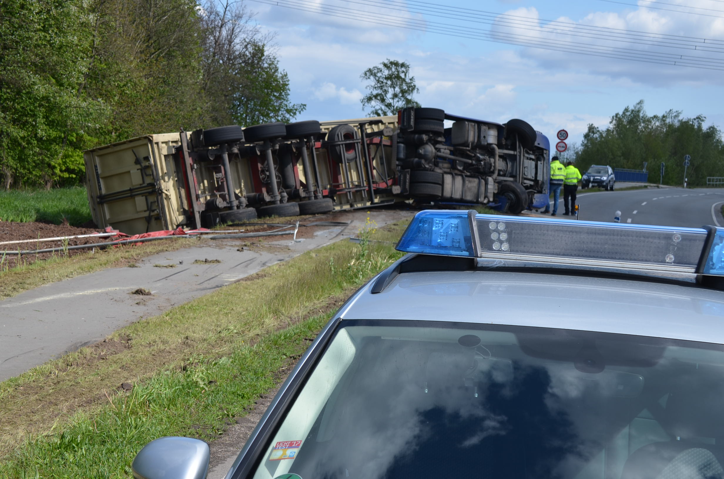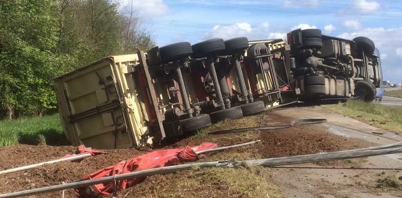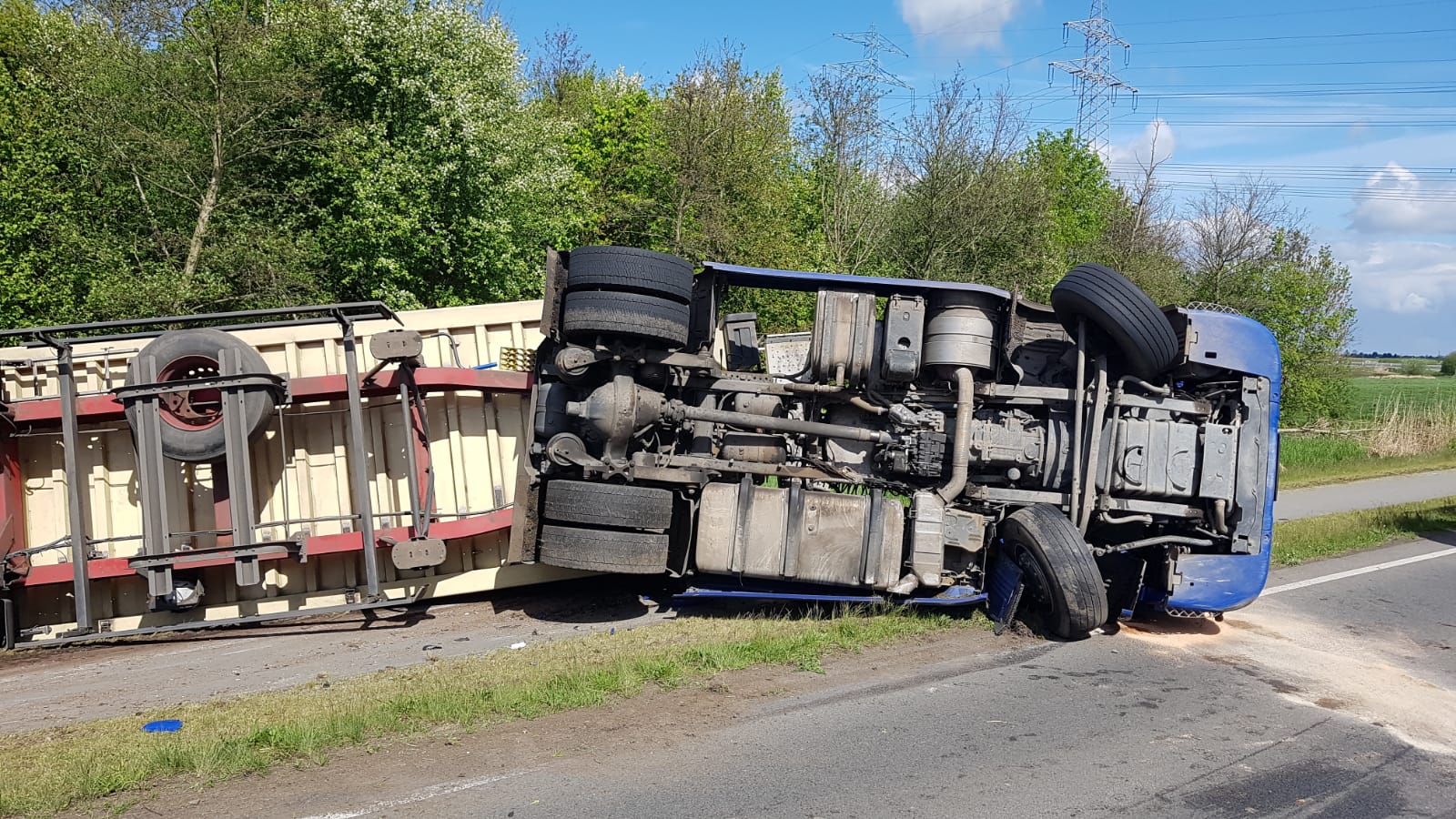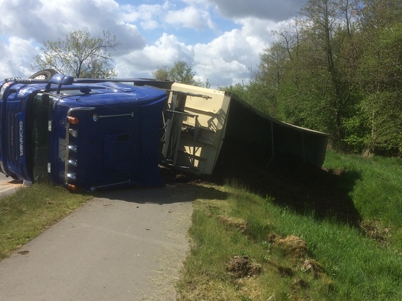 So lautete am Dienstagvormittag das Stichwort für die Alarmierung der Ortsfeuerwehren Dammhausen und Buxtehude (Zug I) zu einer technischen Hilfeleistung auf die Kreisstraße 26, in der Nähe der Autobahnauffahrt Jork. Dort war ein Kipp-Sattelzug aus Dammhausen kommend aus noch nicht geklärter Ursache auf die Gegenfahrbahn gekommen und in den dortigen Seitenstreifen gerutscht. Dabei kippte das gesamte Fahrzeug auf die Seite. Die Ladung, Pilzkompost, ergoss sich in den Seitenraum. Der Fahrer konnte sich mit leichten Verletzungen selbst aus seinem Fahrerhaus befreien. Er kam mit leichten Verletzungen ins Stader Krankenhaus.