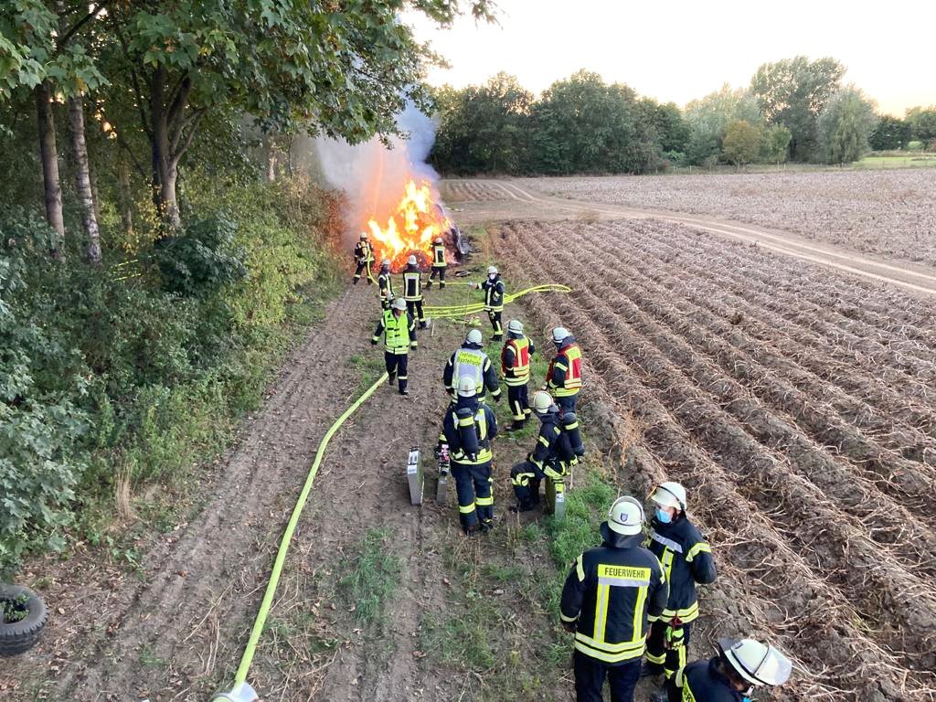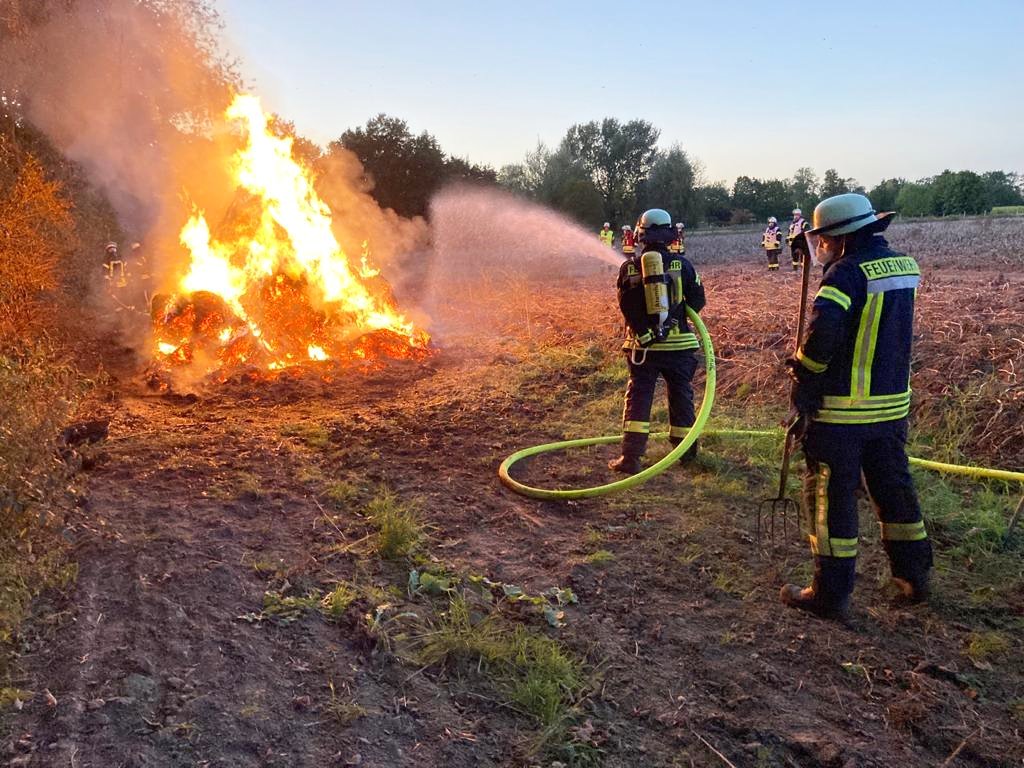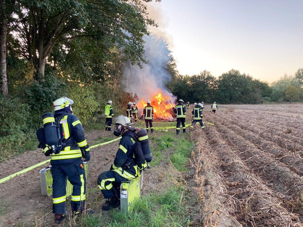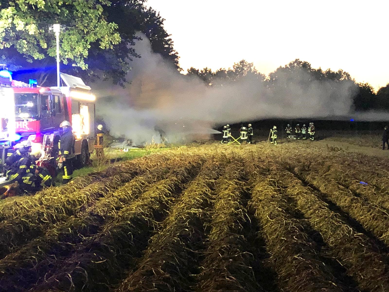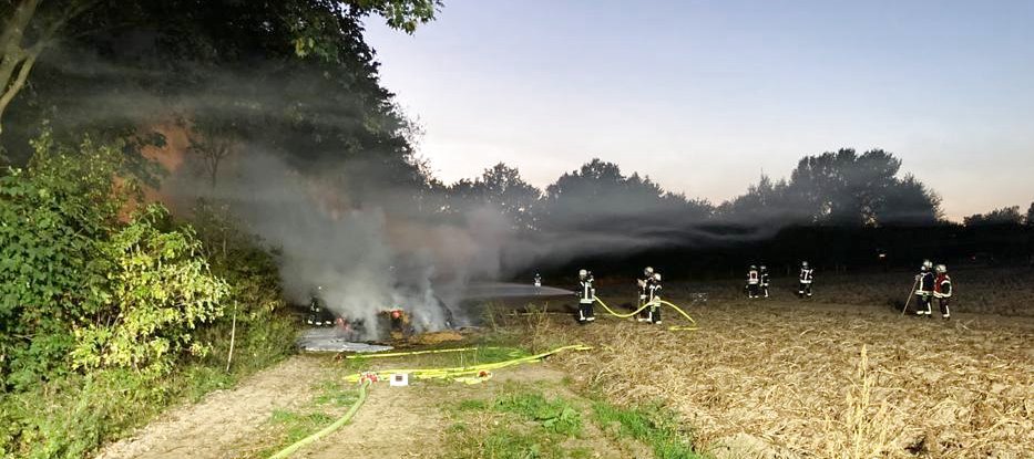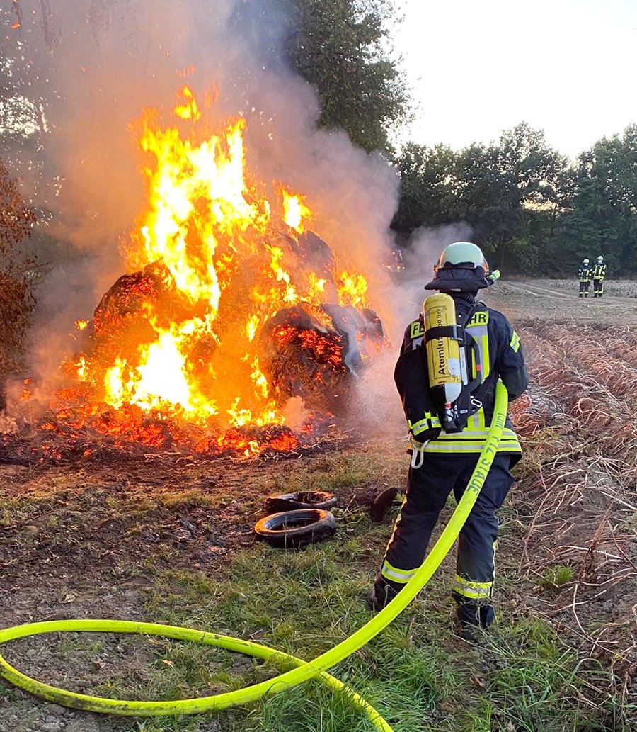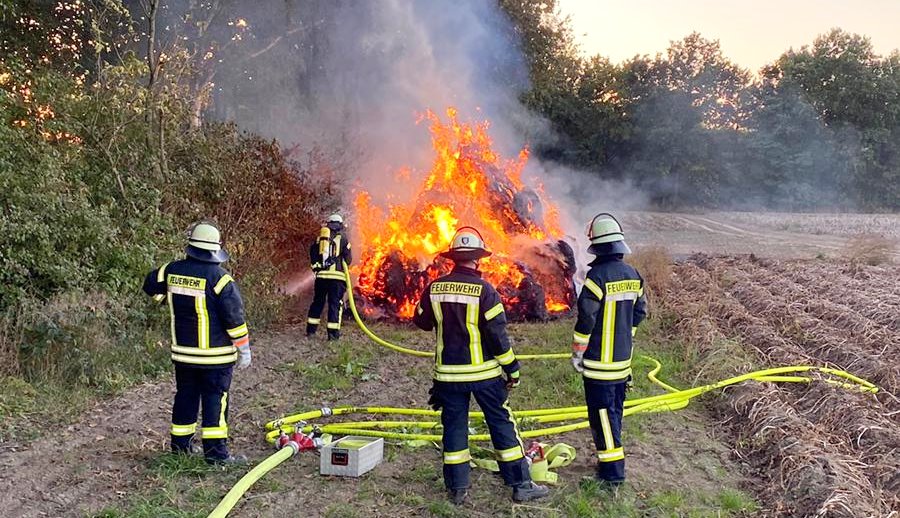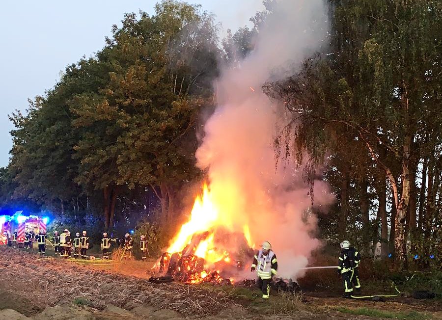 Etwa 25 Rundballen brannten am Montagabend am Feldrand in der Verlängerung des Heidewegs. Die alarmierten Ortsfeuerwehren Ottensen und Buxtehude (Zug I & II) setzten anfangs zwei C-Rohre ein, um ein Übergreifen auf Bäume und Sträucher zu verhindern. Nachdem das Feuer kontrolliert heruntergebrannt war, wurde unter Zuhilfenahme eines Treckers das Brandgut auseinandergezogen und restliche Glutnester mit Schaum, unter Einsatz der Wärmebildkamera, abgelöscht. Nach knapp zwei Stunden konnte "Feuer aus" gegeben werden. Der Ortsbrandmeister Ottensen führte zwei Stunden nach Einsatzende noch eine abschließende Kontrolle durch.