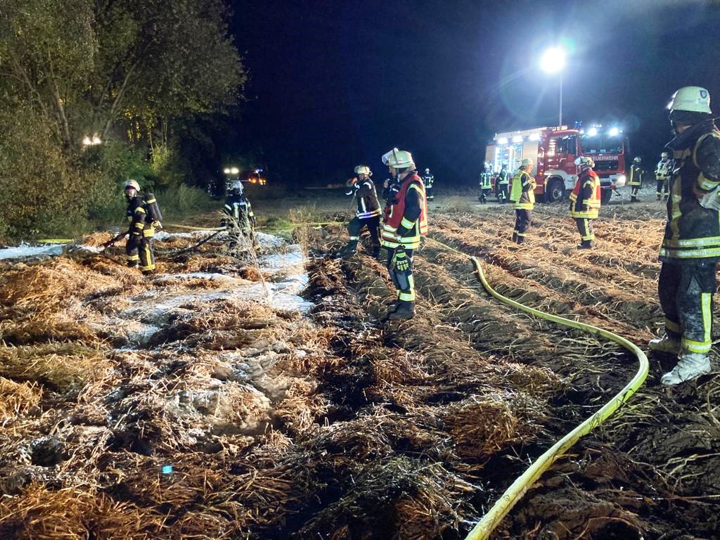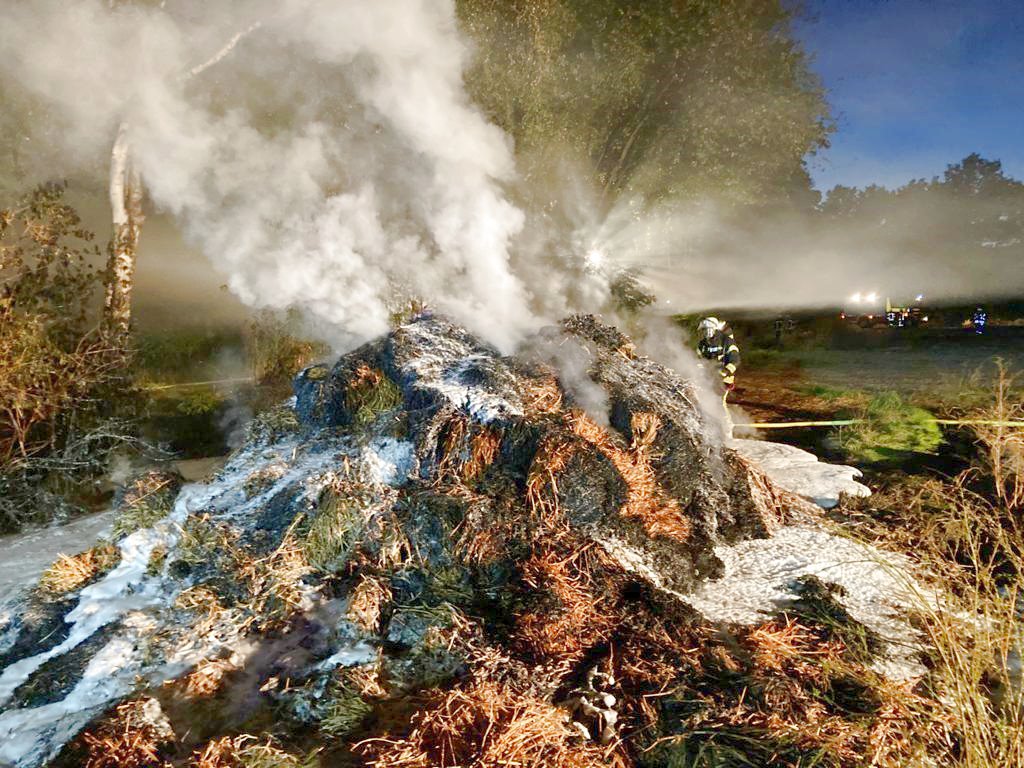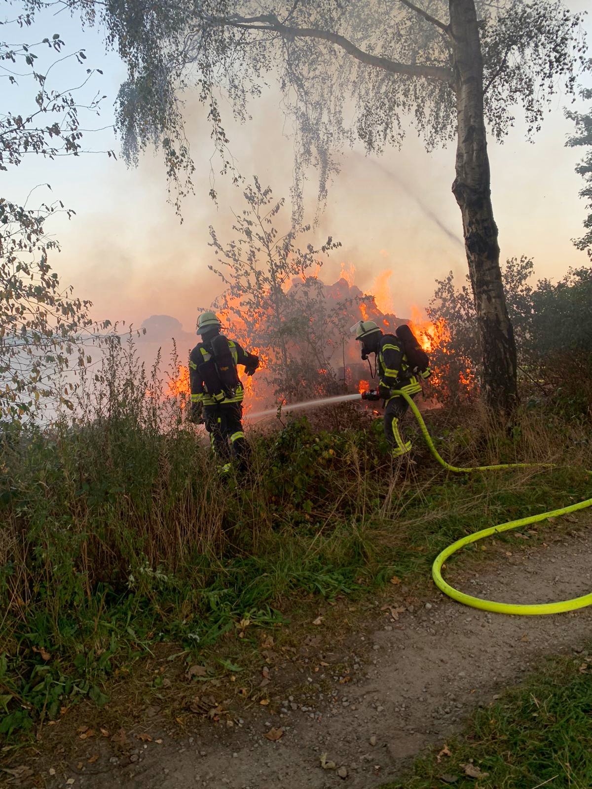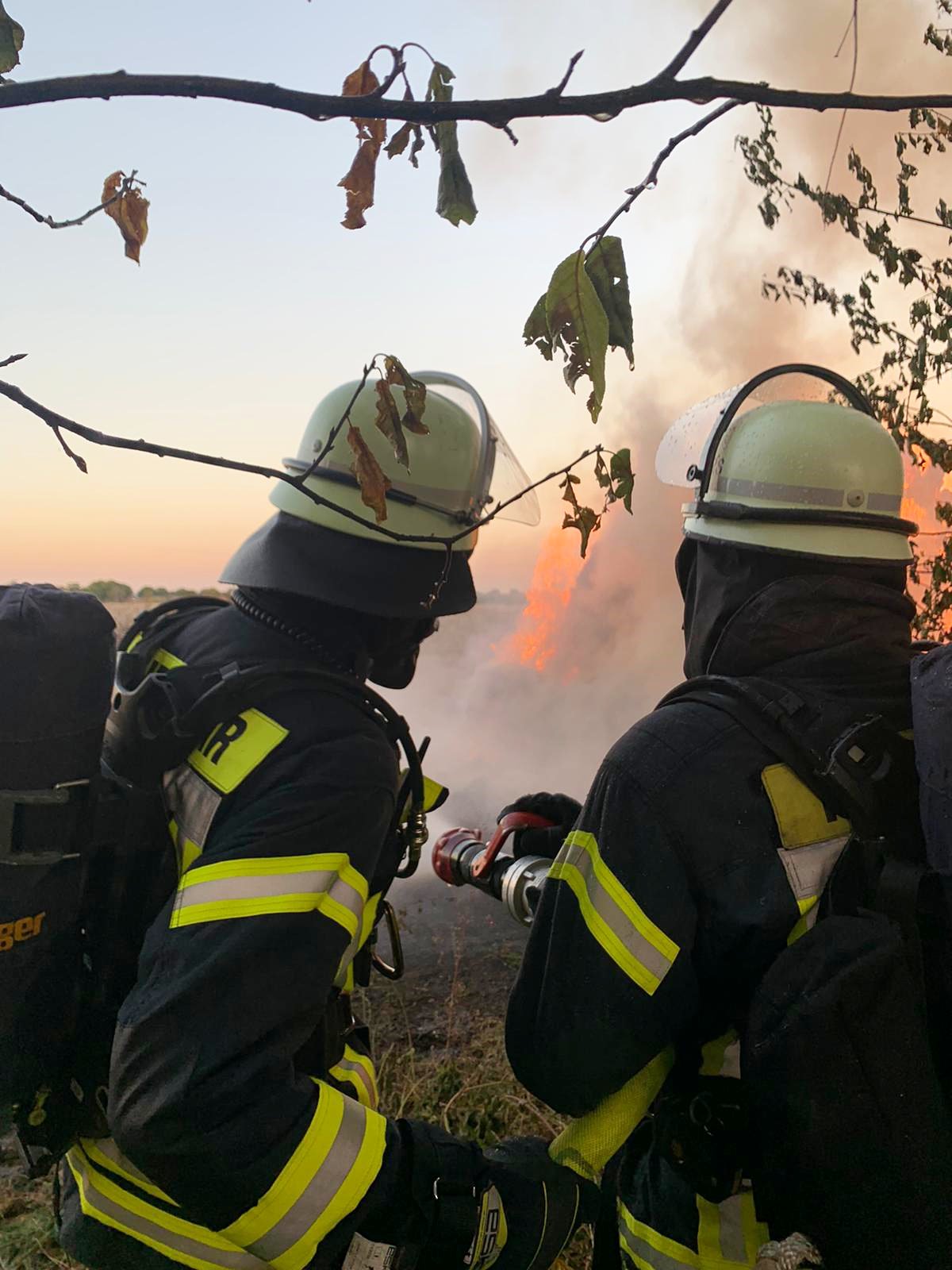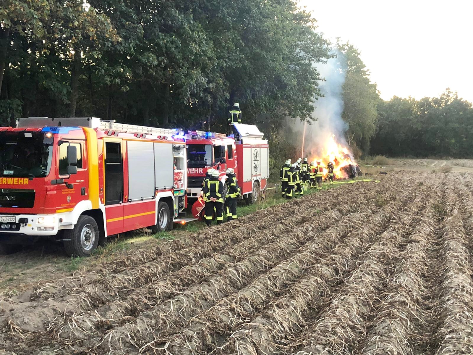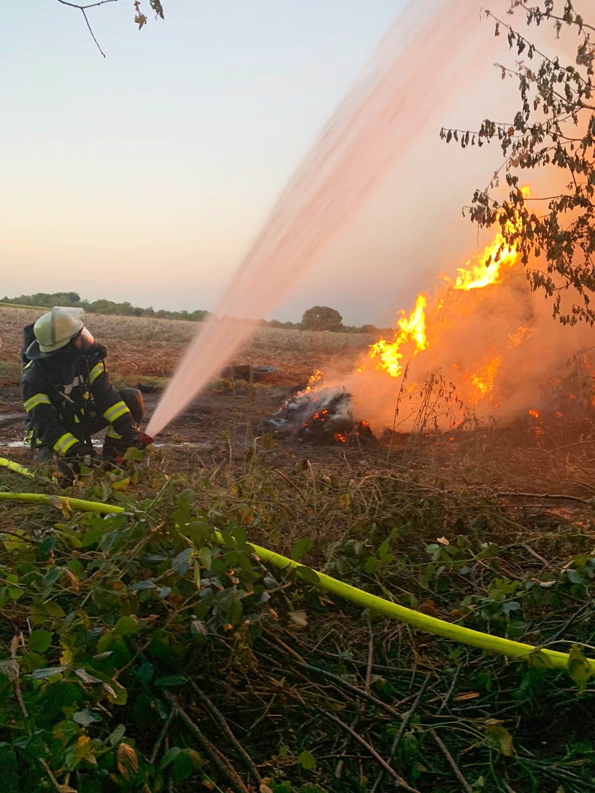 Etwa 25 Rundballen brannten am Montagabend am Feldrand in der Verlängerung des Heidewegs. Die alarmierten Ortsfeuerwehren Ottensen und Buxtehude (Zug I & II) setzten anfangs zwei C-Rohre ein, um ein Übergreifen auf Bäume und Sträucher zu verhindern. Nachdem das Feuer kontrolliert heruntergebrannt war, wurde unter Zuhilfenahme eines Treckers das Brandgut auseinandergezogen und restliche Glutnester mit Schaum, unter Einsatz der Wärmebildkamera, abgelöscht. Nach knapp zwei Stunden konnte "Feuer aus" gegeben werden. Der Ortsbrandmeister Ottensen führte zwei Stunden nach Einsatzende noch eine abschließende Kontrolle durch.