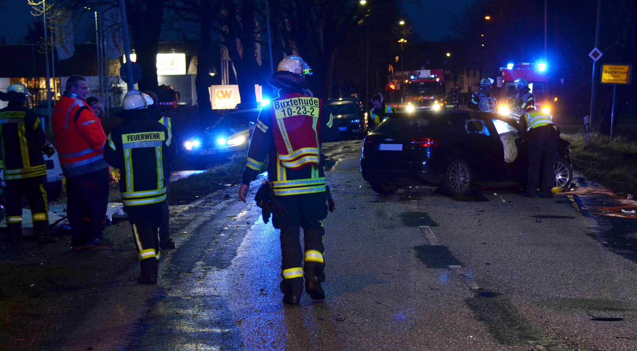 Die Renaultfahrerin wurde in ihrem Autowrack eingeklemmt und musste in einer aufwendigen Rettungsaktion von den angerückten Feuerwehrleuten beider Züge der Feuerwehr Buxtehude mit schwerem Geräte befreit werden. Sie wurde nach der Erstversorgung durch den Notarzt vom Rettungsdienst mit lebensgefährlichen Verletzungen in eine Hamburger Klinik eingeliefert.