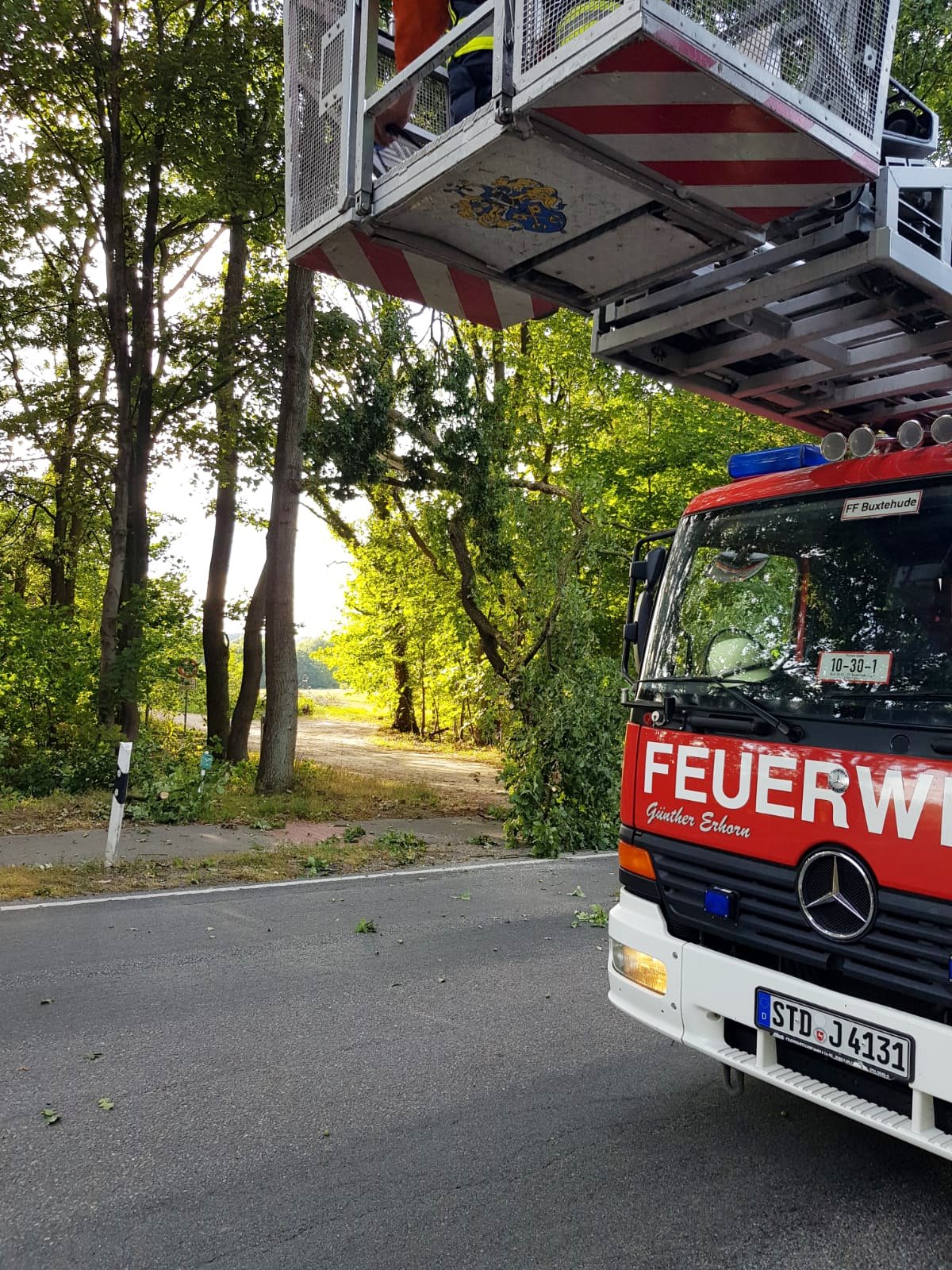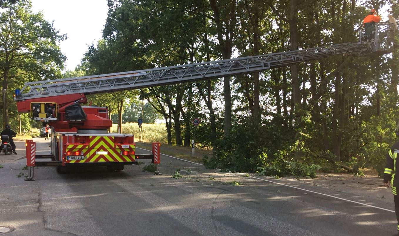 Der Zug II und die Drehleiter vom Zug I der Ortsfeuerwehr Buxtehude wurden am Sonntagabend zur Moisburger Landstraße alarmiert. In Höhe der Kreuzung zum Eilendorfer Weg war eine Baumkrone gebrochen und drohte komplett auf die Fahrbahn zu stürzen.
