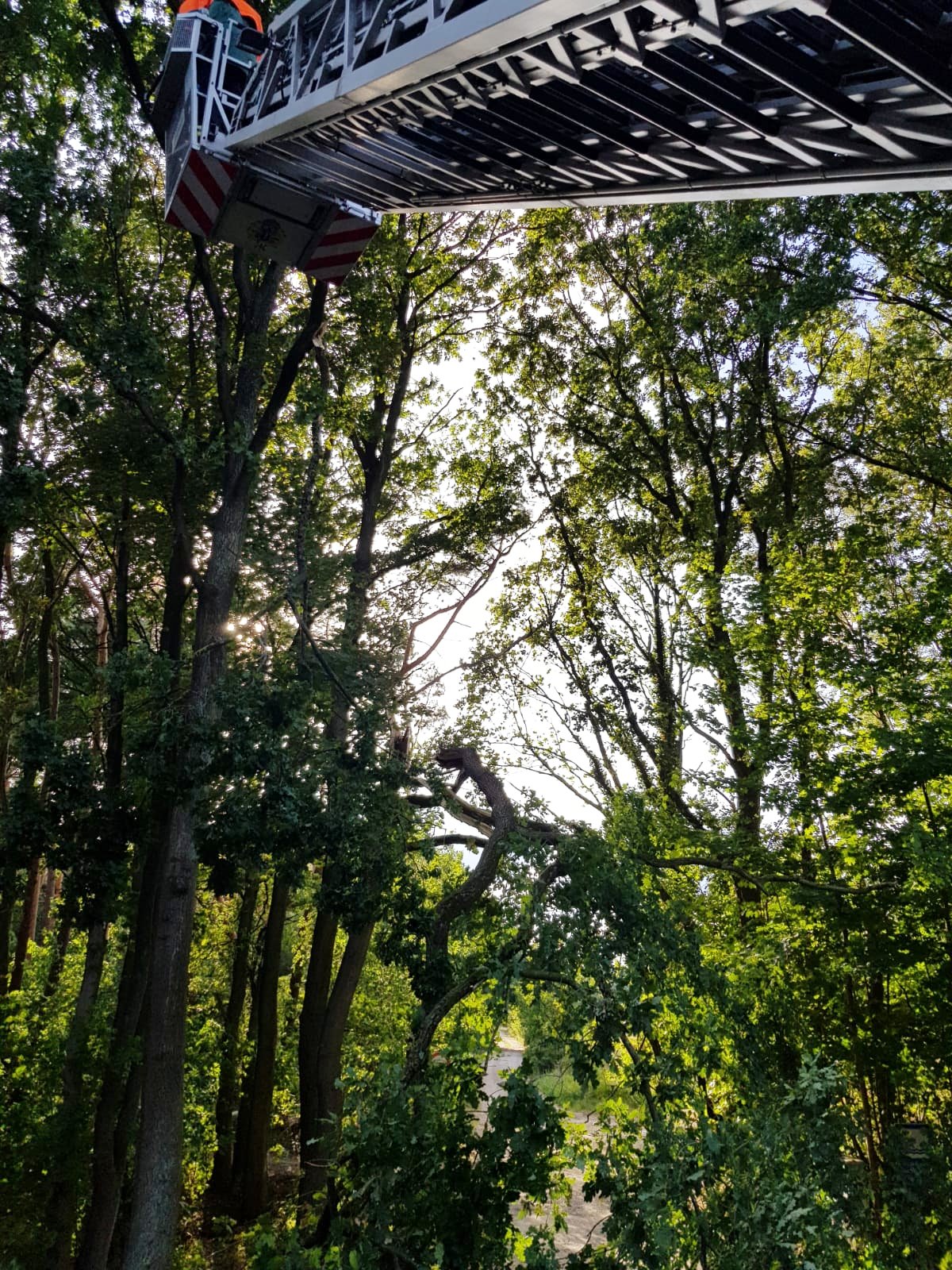 Aus dem Korb der Drehleiter wurden die beschädigten Äste entfernt, am Boden zersägt und beiseite gelegt.