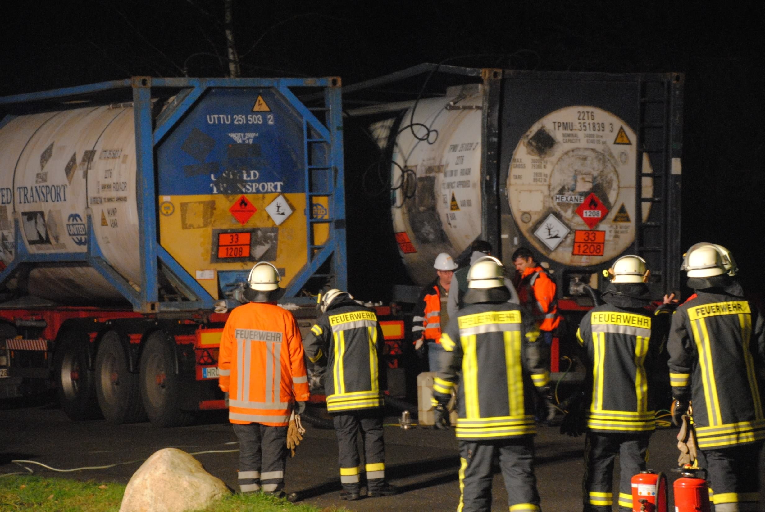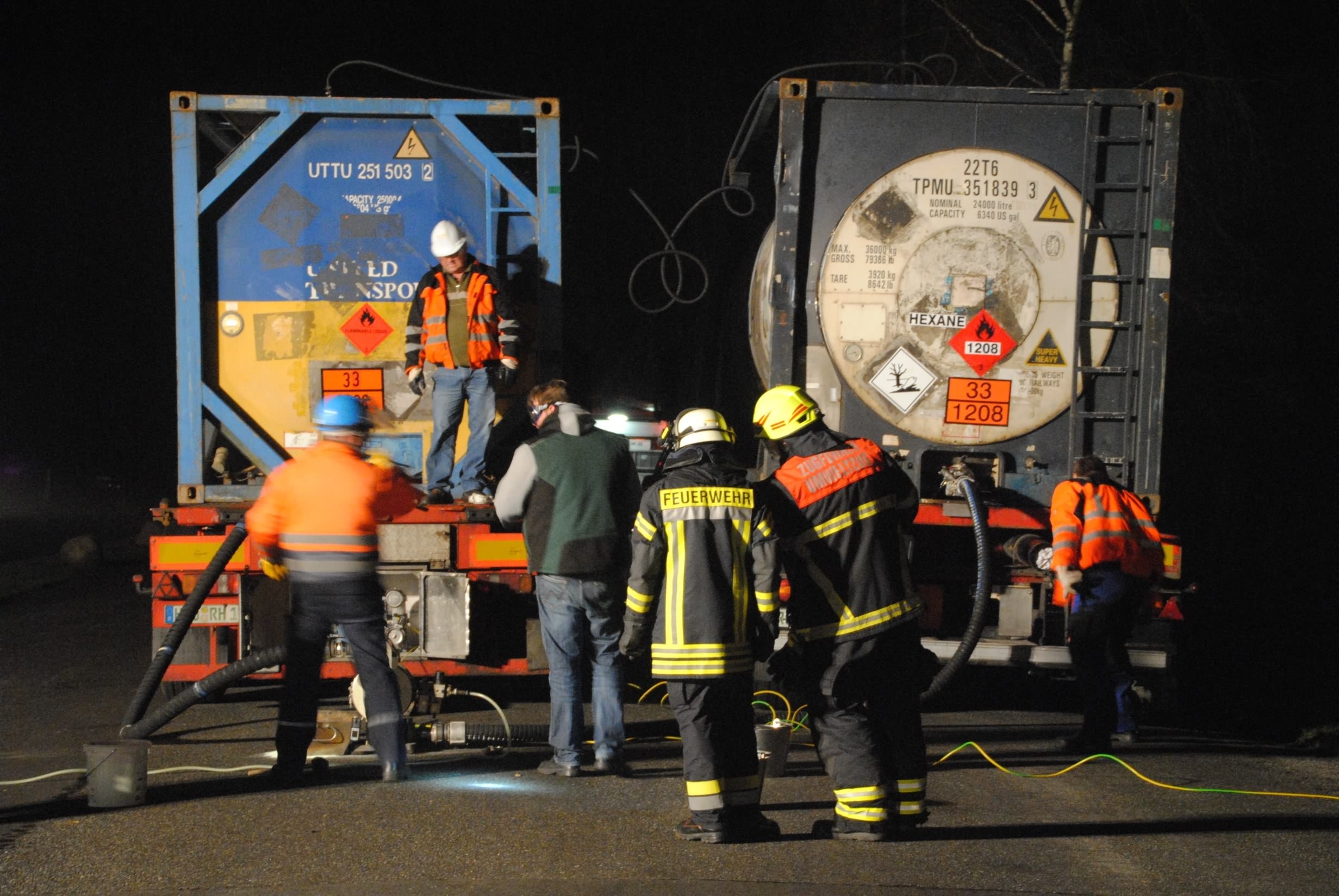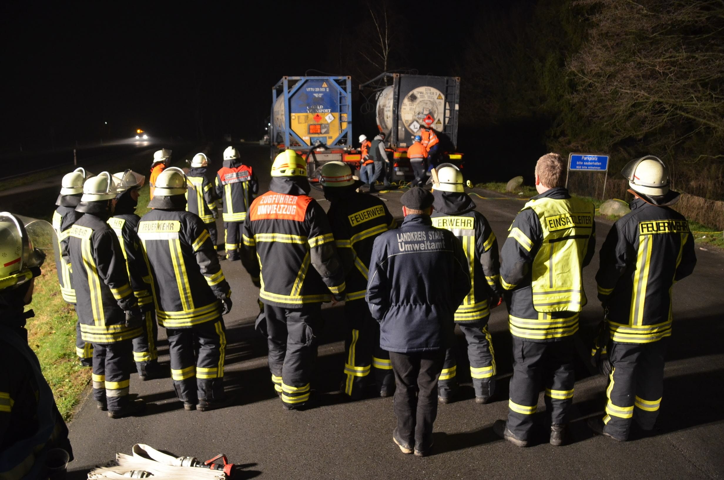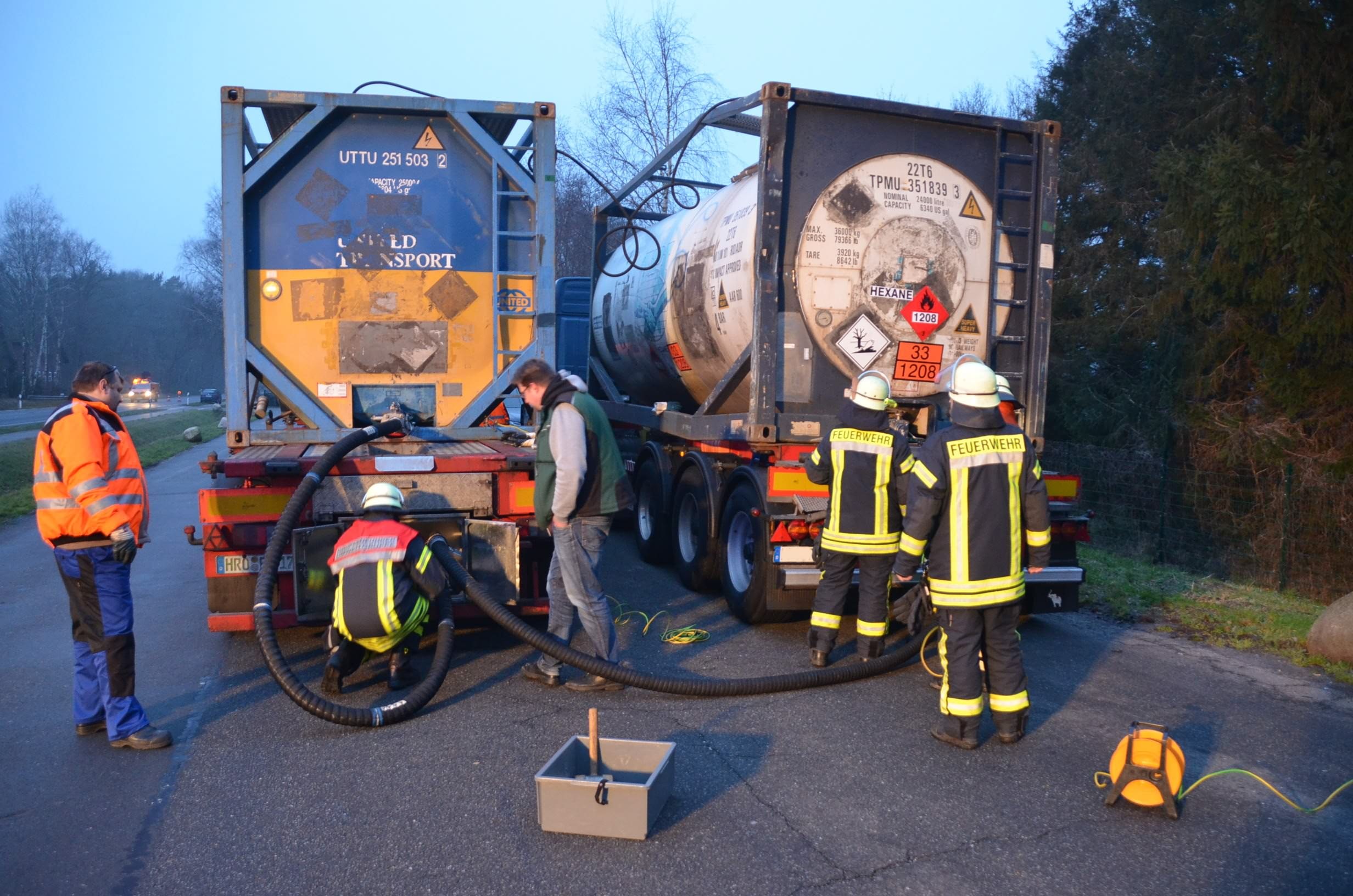 Nachdem der am Dienstagmittag in Hedendorf verunfallte Gefahrguttransporter zur nächstgelegenen Parkmöglichkeit auf einem Parkplatz an der B73 bei Nottensdorf verbracht worden war und ein Ersatzfahrzeug für die Ladung bereitgestellt werden konnte, begann am späten Nachmittag das Umpumpen des Gefahrstoffs Hexane in den Tankcontainer des Ersatzfahrzeuges. Hierzu wurden diverse Feuerwehren aus dem Umkreis alarmiert, darunter die Feuerwehren Horneburg, Nottensdorf, Hedendorf, Neukloster, Buxtehude (Zug I) und die Umweltgruppe Lk Stade Süd aus Neukloster, sowie Kreisbrandmeister, Umweltamt und -berater. Aufgabe der Feuerwehren war die Sicherstellung des Brandschutzes. Um im Bedarfsfall, Hexane ist hochentzündlich, schnell Eingreifen zu können, wurde vom Buxtehuder Hilfeleistungslöschfahrzeug und Großtanklöschfahrzeug ein zweiteiliger Löschangriff mit Wasser und Schaummittel aufgebaut, sowie ein Atemschutztrupp bereit gestellt. Die weiteren Fahrzeuge gingen auf dem gegenüberliegenden Parkplatz in Bereitstellung. Aufgabe der Umweltgruppe war ein mögliches Auffangen bei unerwartetem Austritt des Mediums und die Erdung der beiden Container gegen statische Aufladung und damit möglichem Funkenüberschlag. Die Feuerwehr Horneburg sorgte für die Ausleuchtung der Einsatzstelle.