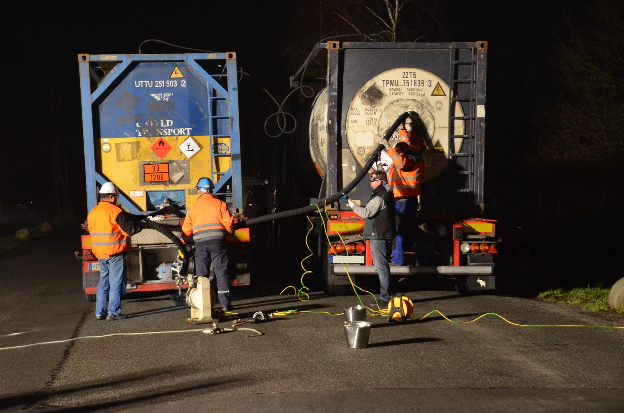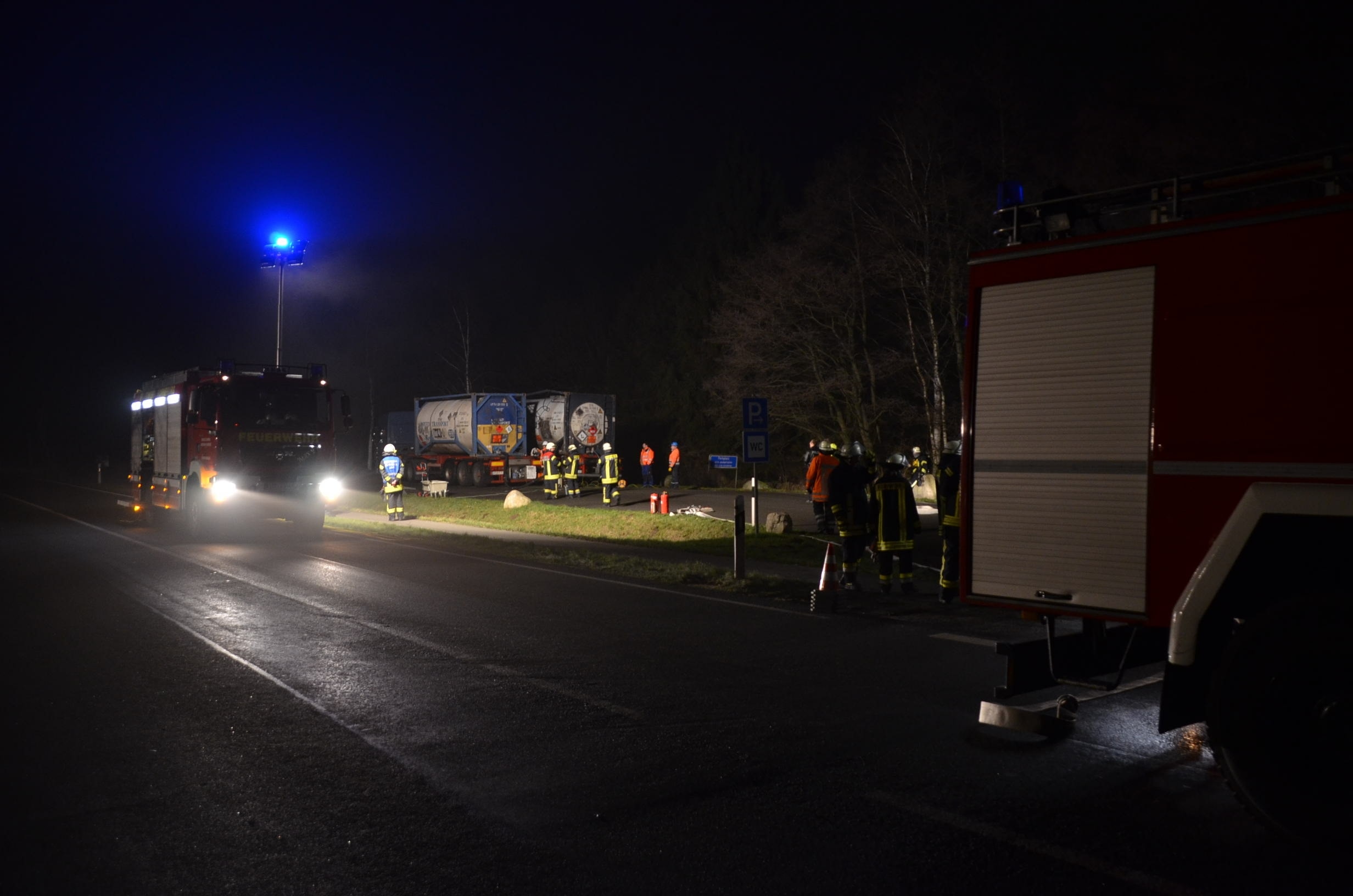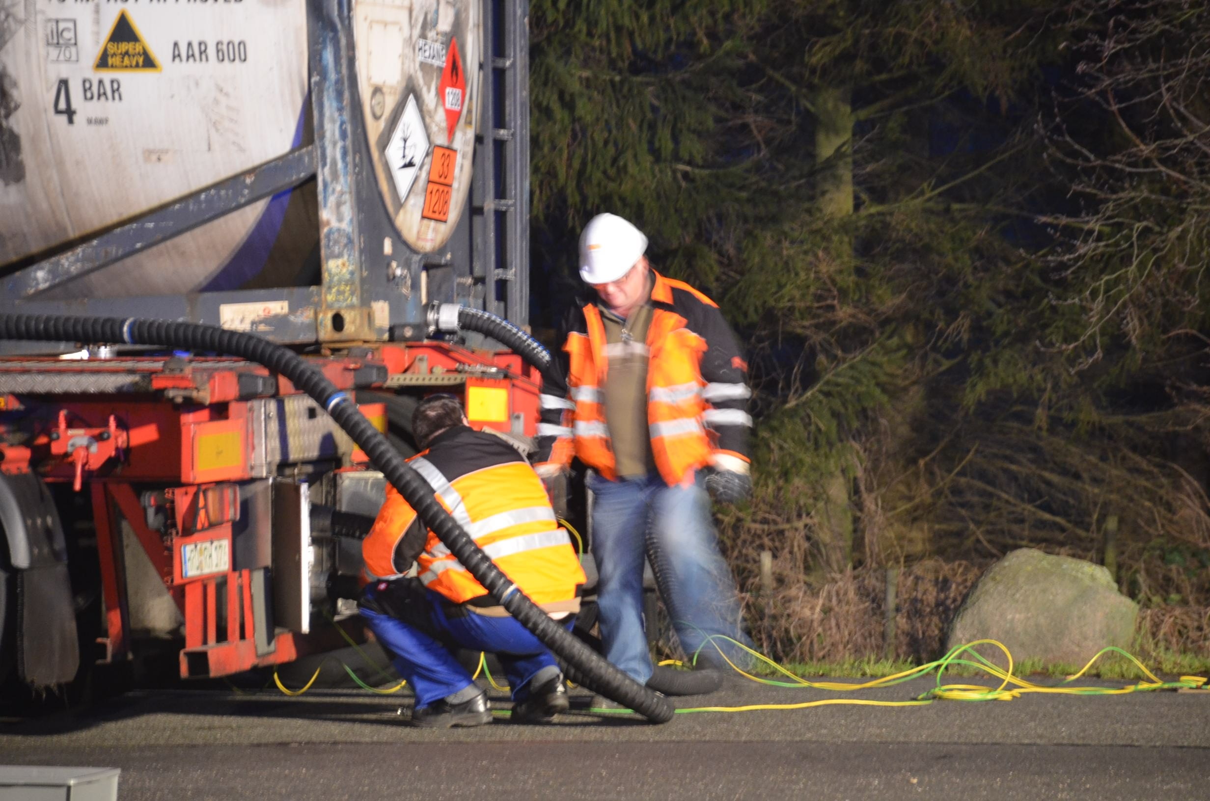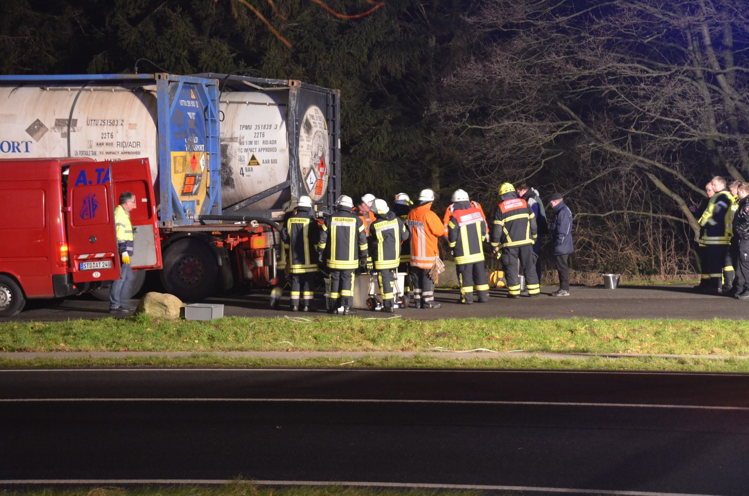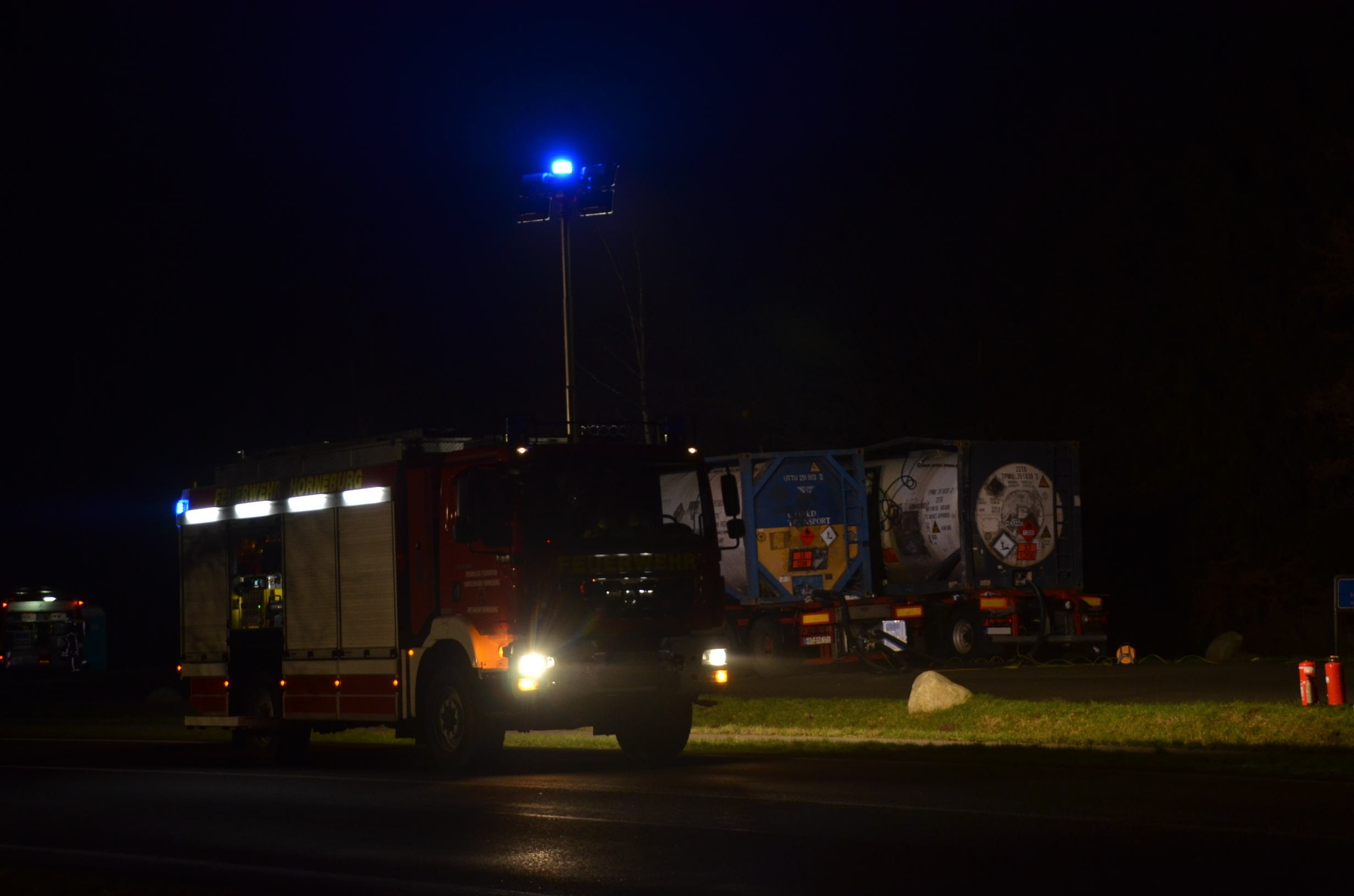 Nachdem der am Dienstagmittag in Hedendorf verunfallte Gefahrguttransporter zur nächstgelegenen Parkmöglichkeit auf einem Parkplatz an der B73 bei Nottensdorf verbracht worden war und ein Ersatzfahrzeug für die Ladung bereitgestellt werden konnte, begann am späten Nachmittag das Umpumpen des Gefahrstoffs Hexane in den Tankcontainer des Ersatzfahrzeuges. Hierzu wurden diverse Feuerwehren aus dem Umkreis alarmiert, darunter die Feuerwehren Horneburg, Nottensdorf, Hedendorf, Neukloster, Buxtehude (Zug I) und die Umweltgruppe Lk Stade Süd aus Neukloster, sowie Kreisbrandmeister, Umweltamt und -berater. Aufgabe der Feuerwehren war die Sicherstellung des Brandschutzes. Um im Bedarfsfall, Hexane ist hochentzündlich, schnell Eingreifen zu können, wurde vom Buxtehuder Hilfeleistungslöschfahrzeug und Großtanklöschfahrzeug ein zweiteiliger Löschangriff mit Wasser und Schaummittel aufgebaut, sowie ein Atemschutztrupp bereit gestellt. Die weiteren Fahrzeuge gingen auf dem gegenüberliegenden Parkplatz in Bereitstellung. Aufgabe der Umweltgruppe war ein mögliches Auffangen bei unerwartetem Austritt des Mediums und die Erdung der beiden Container gegen statische Aufladung und damit möglichem Funkenüberschlag. Die Feuerwehr Horneburg sorgte für die Ausleuchtung der Einsatzstelle.