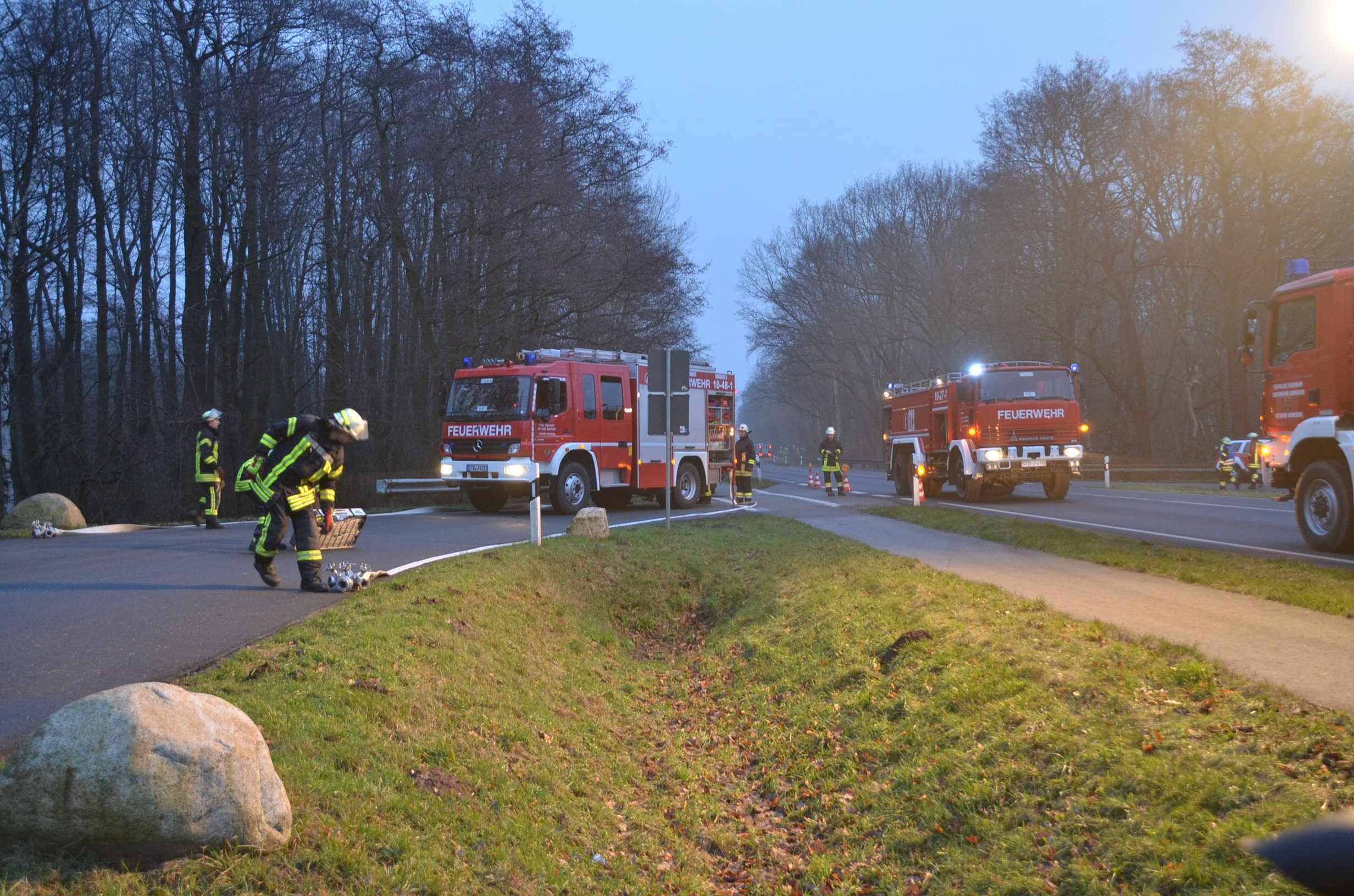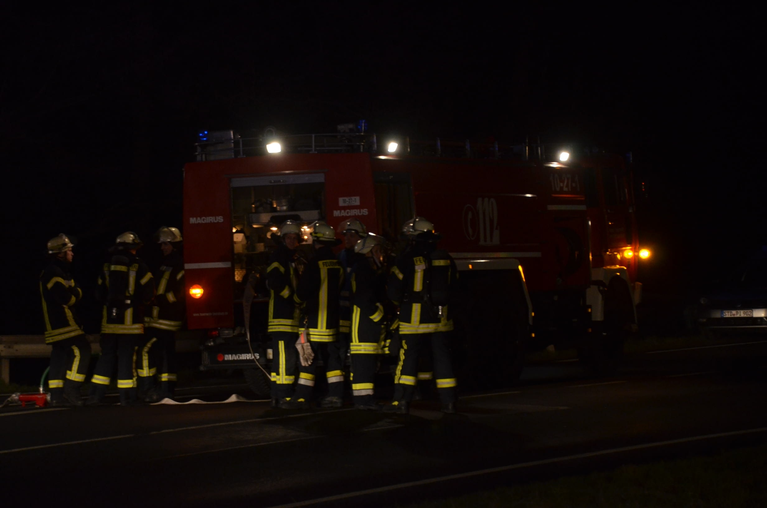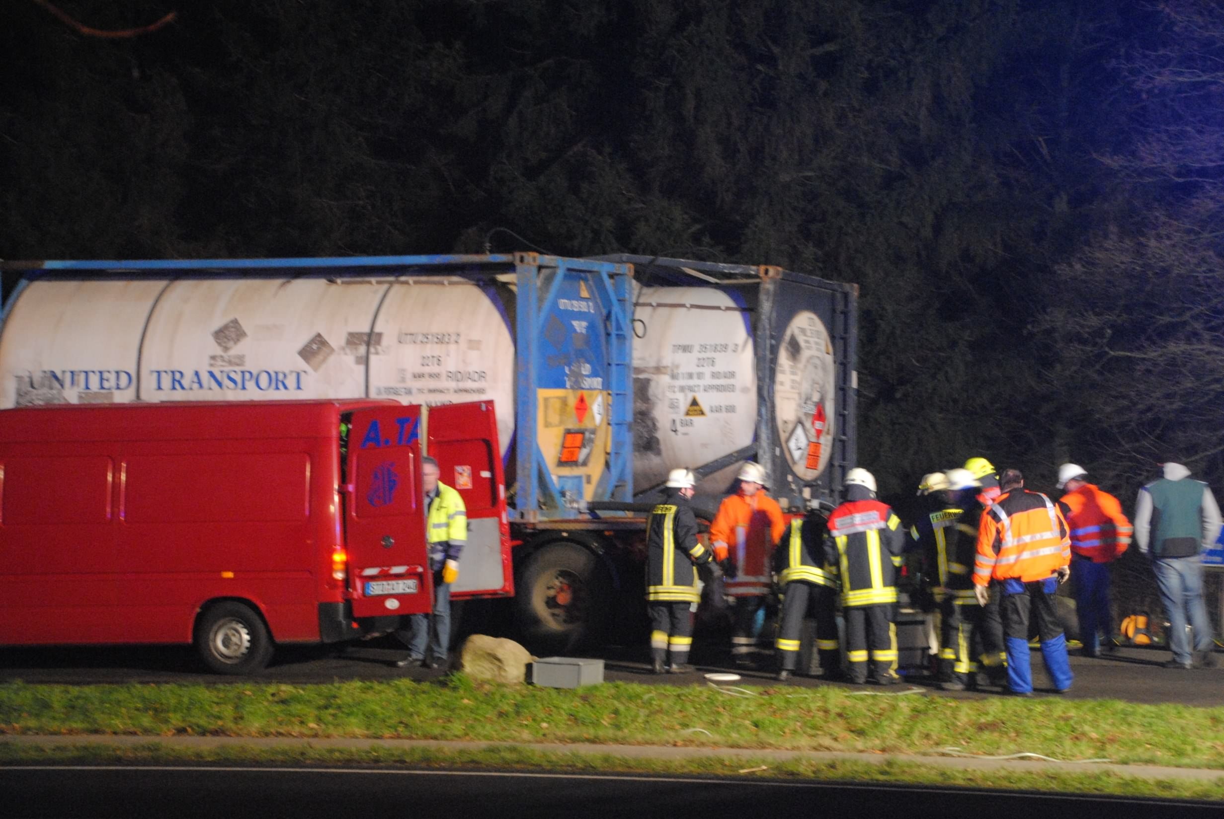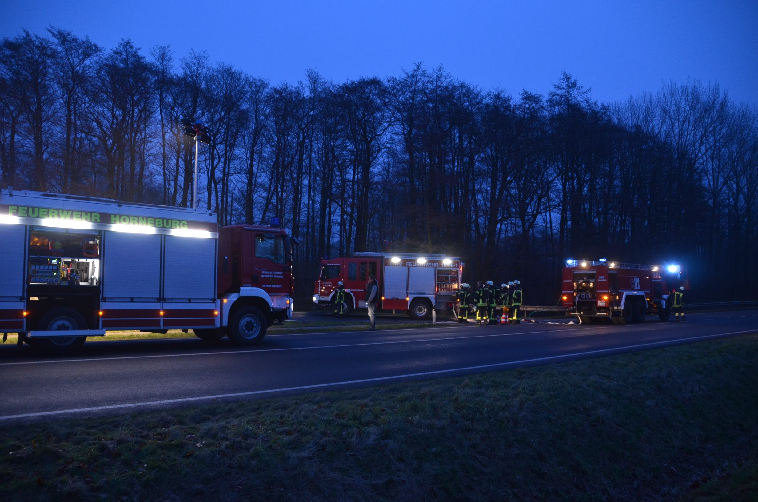 Nachdem der am Dienstagmittag in Hedendorf verunfallte Gefahrguttransporter zur nächstgelegenen Parkmöglichkeit auf einem Parkplatz an der B73 bei Nottensdorf verbracht worden war und ein Ersatzfahrzeug für die Ladung bereitgestellt werden konnte, begann am späten Nachmittag das Umpumpen des Gefahrstoffs Hexane in den Tankcontainer des Ersatzfahrzeuges. Hierzu wurden diverse Feuerwehren aus dem Umkreis alarmiert, darunter die Feuerwehren Horneburg, Nottensdorf, Hedendorf, Neukloster, Buxtehude (Zug I) und die Umweltgruppe Lk Stade Süd aus Neukloster, sowie Kreisbrandmeister, Umweltamt und -berater. Aufgabe der Feuerwehren war die Sicherstellung des Brandschutzes. Um im Bedarfsfall, Hexane ist hochentzündlich, schnell Eingreifen zu können, wurde vom Buxtehuder Hilfeleistungslöschfahrzeug und Großtanklöschfahrzeug ein zweiteiliger Löschangriff mit Wasser und Schaummittel aufgebaut, sowie ein Atemschutztrupp bereit gestellt. Die weiteren Fahrzeuge gingen auf dem gegenüberliegenden Parkplatz in Bereitstellung. Aufgabe der Umweltgruppe war ein mögliches Auffangen bei unerwartetem Austritt des Mediums und die Erdung der beiden Container gegen statische Aufladung und damit möglichem Funkenüberschlag. Die Feuerwehr Horneburg sorgte für die Ausleuchtung der Einsatzstelle.