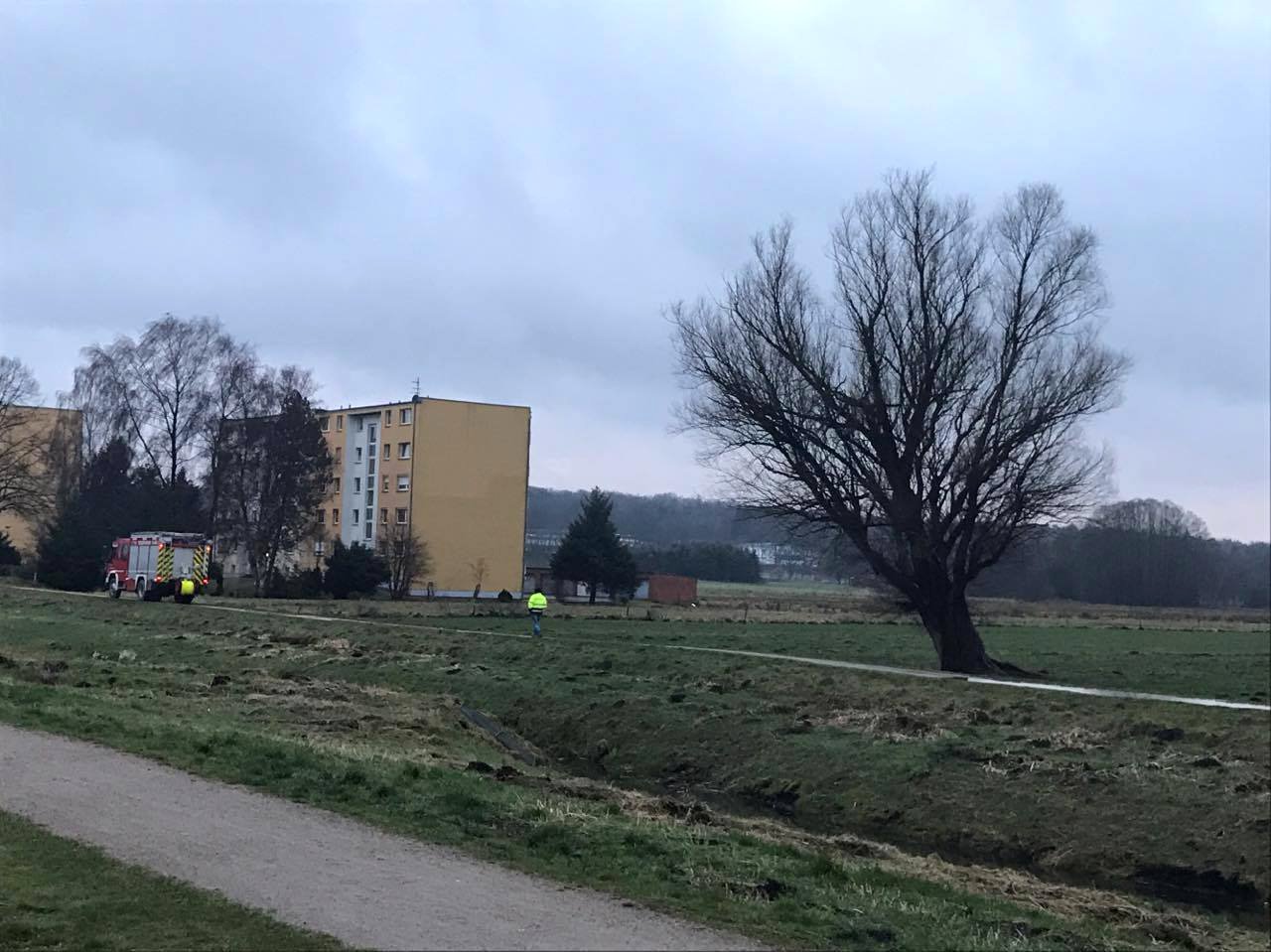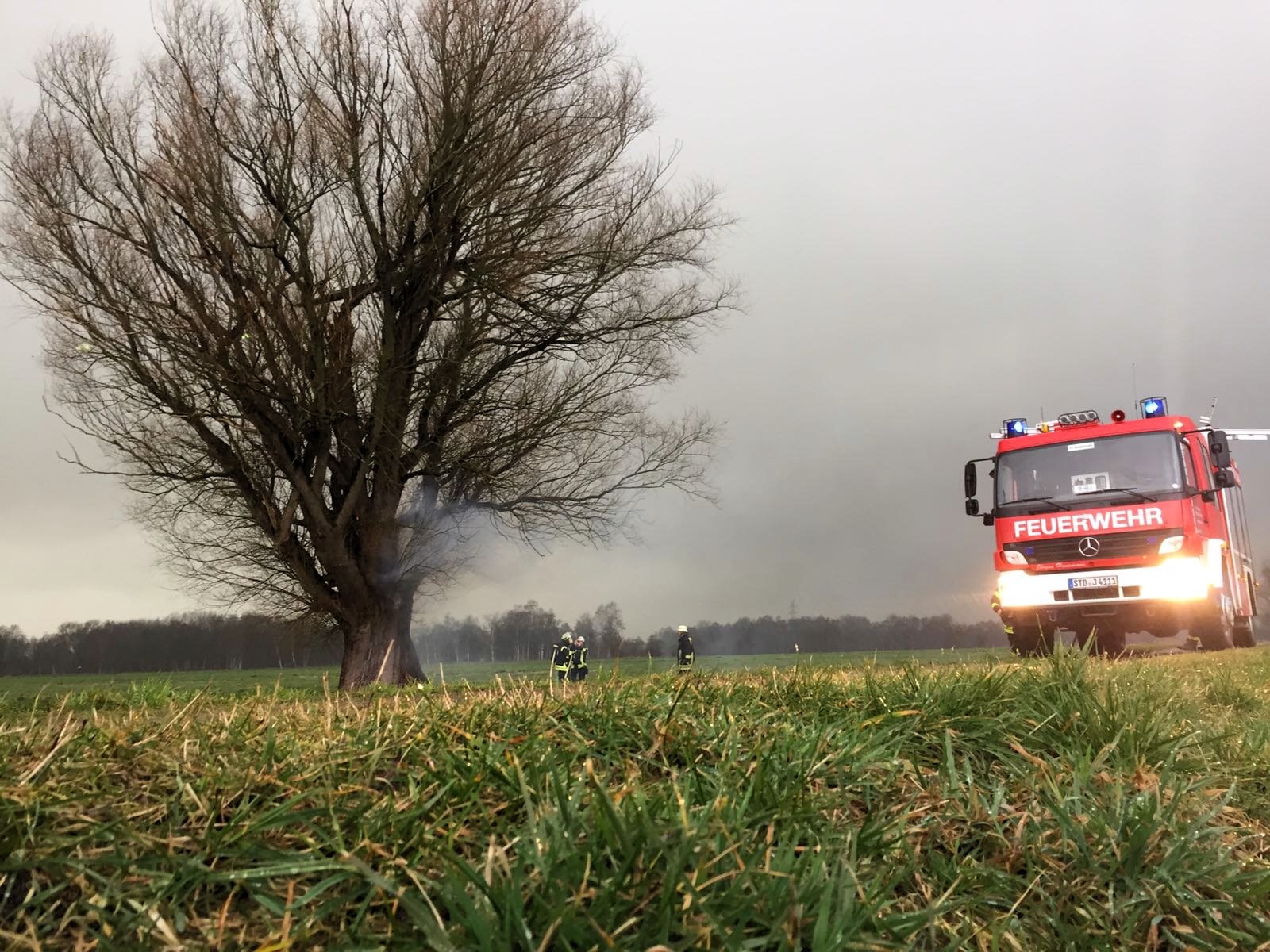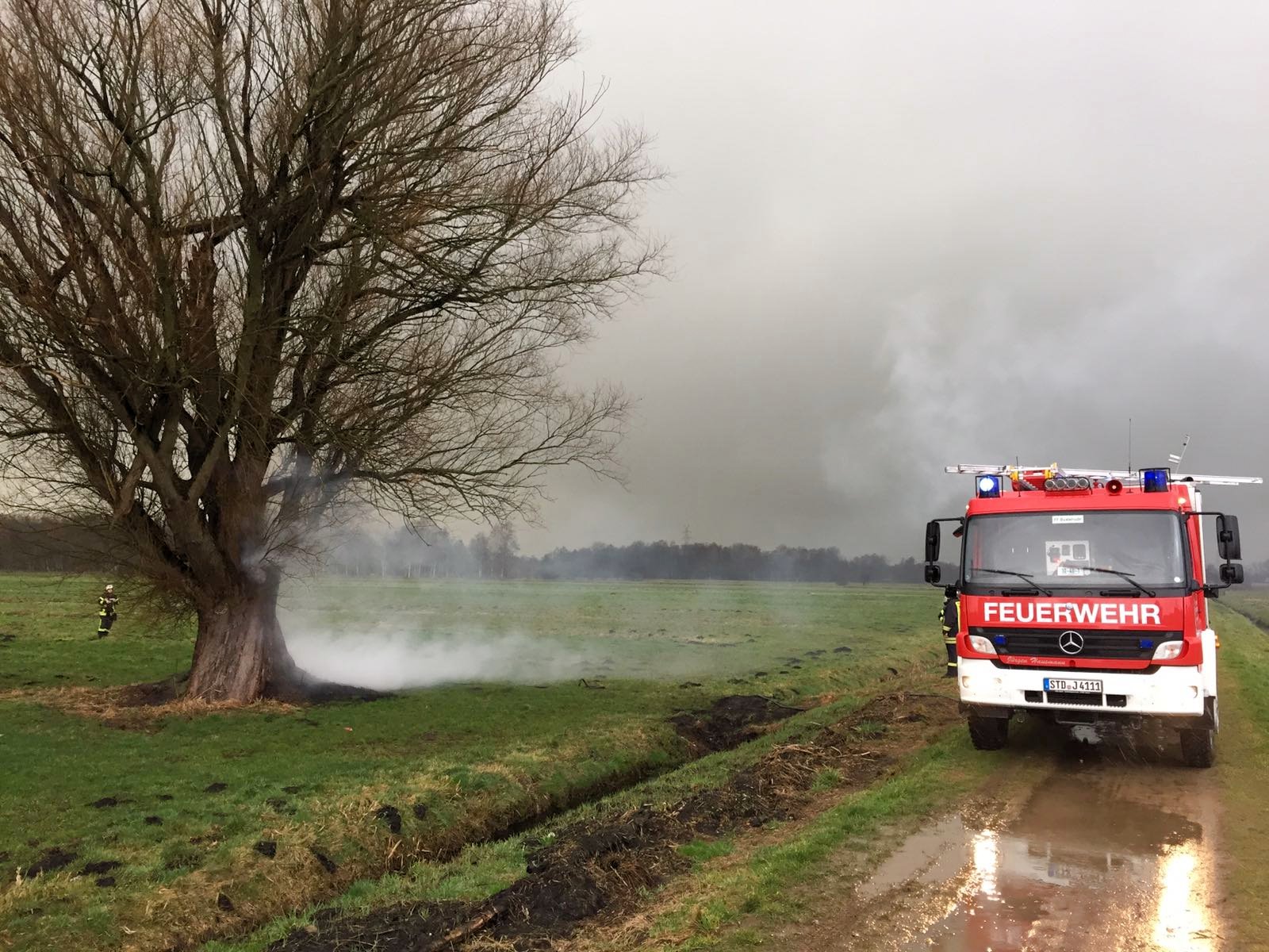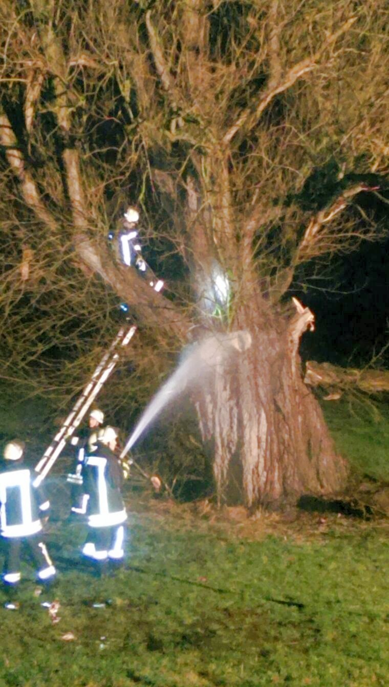Die alarmierten Einsatzkräfte vom Zug I der Ortsfeuerwehr Buxtehude sorgten mit dem Schnellangriffsschlauch vom Hilfeleistungslöschfahrzeug für ein erstes Ablöschen der großen Glutnester im dem etwa 1,40m dicken Stamm und rückten anschließend vorerst wieder ab. Da der Baum nicht mehr zu retten war und eine Gefahr für den angrenzenden Wanderweg darstellte, wurde gleich nach den ersten Löschmaßnahmen mit einer teilweisen Fällung der großen Äste begonnen.