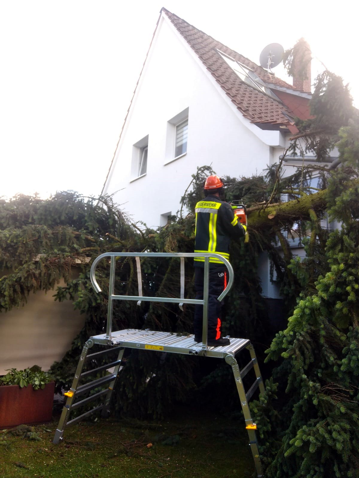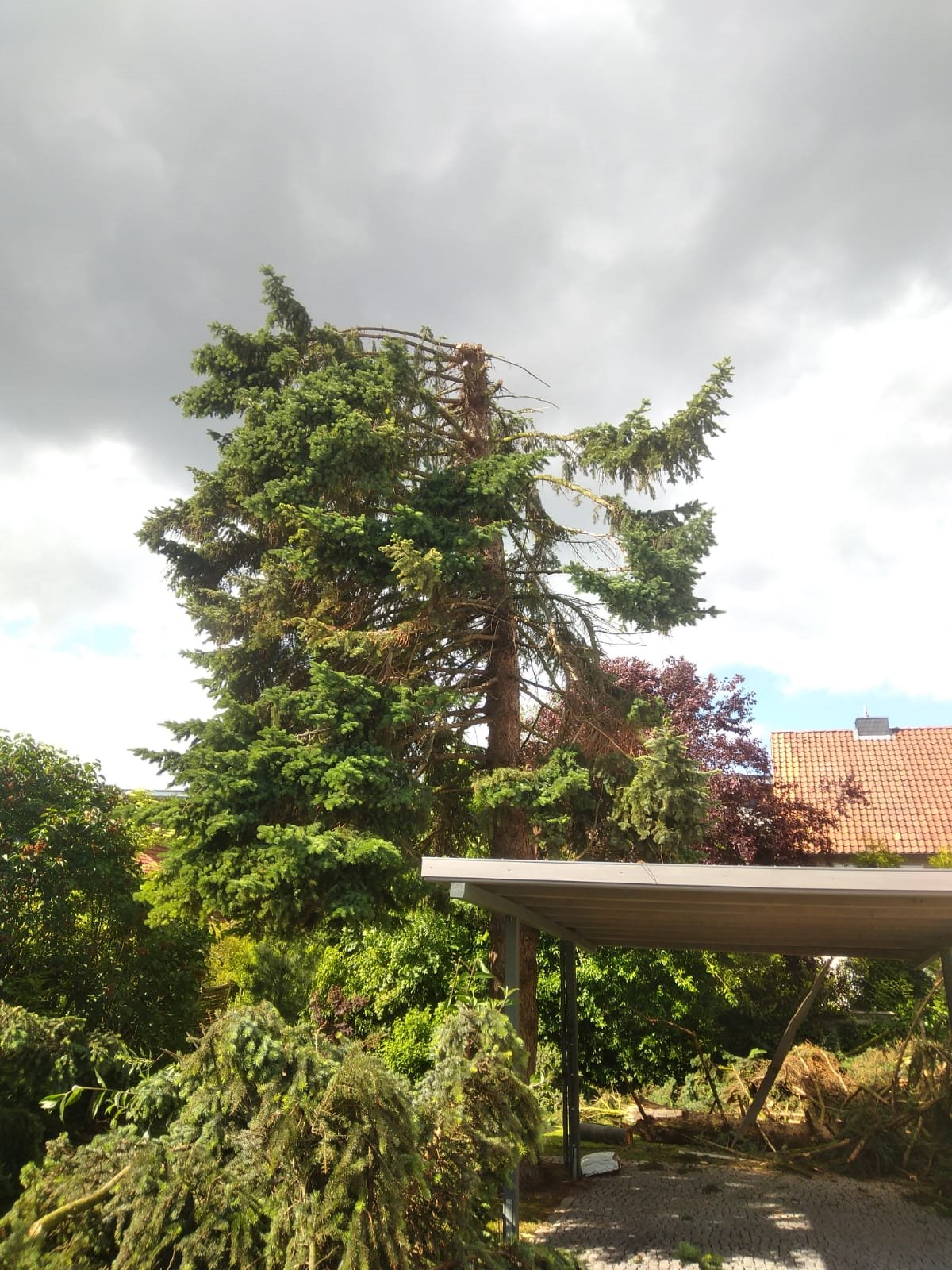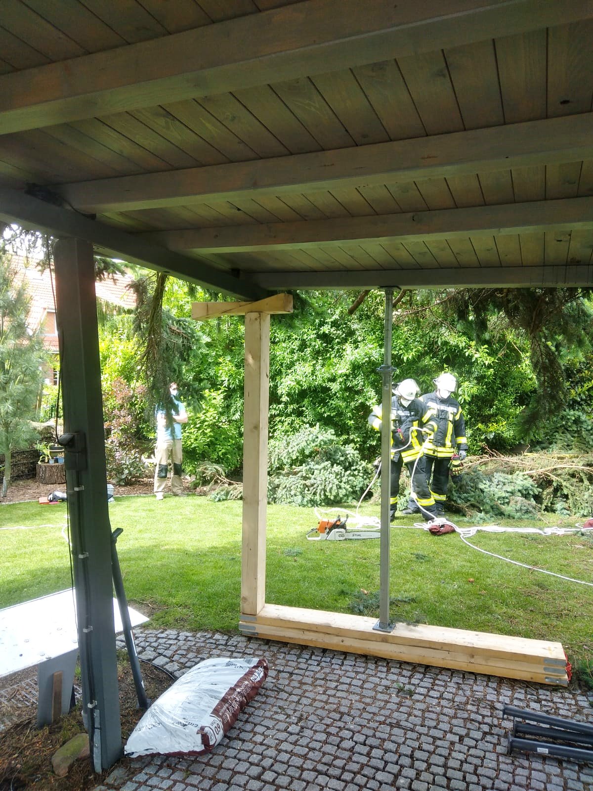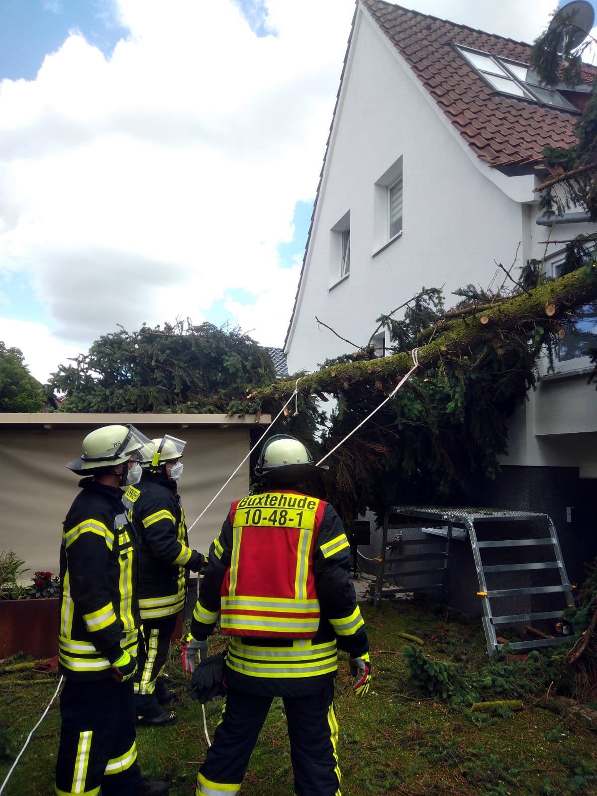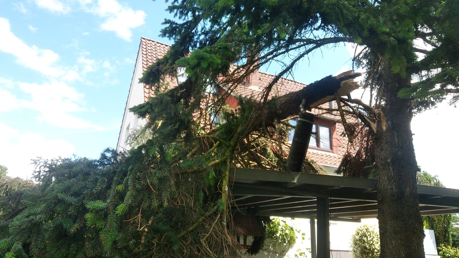 Zu einer technischen Hilfeleistung musste der Zug I der Ortsfeuerwehr Buxtehude am Samstagnachmittag in die Poststr ausrücken. Ein großer etwa 40cm dicker Ast war aus einer Tanne gebrochen und auf den Carport und die Dachkante eines Einfamilienhaus gestürzt. Der Baum blieb auf dem Carport liegen, welches so stark beschädigt wurde, dass es einzustürzen drohte. Das Dach des Hauses wurde durch beschädigte Dachpfannen ebenfalls in Mitleidenschaft gezogen. Eine danebenliegende Grillhütte, in dem die Bewohner gerade saßen, wurde zwar auch getroffen, aber nicht beschädigt.