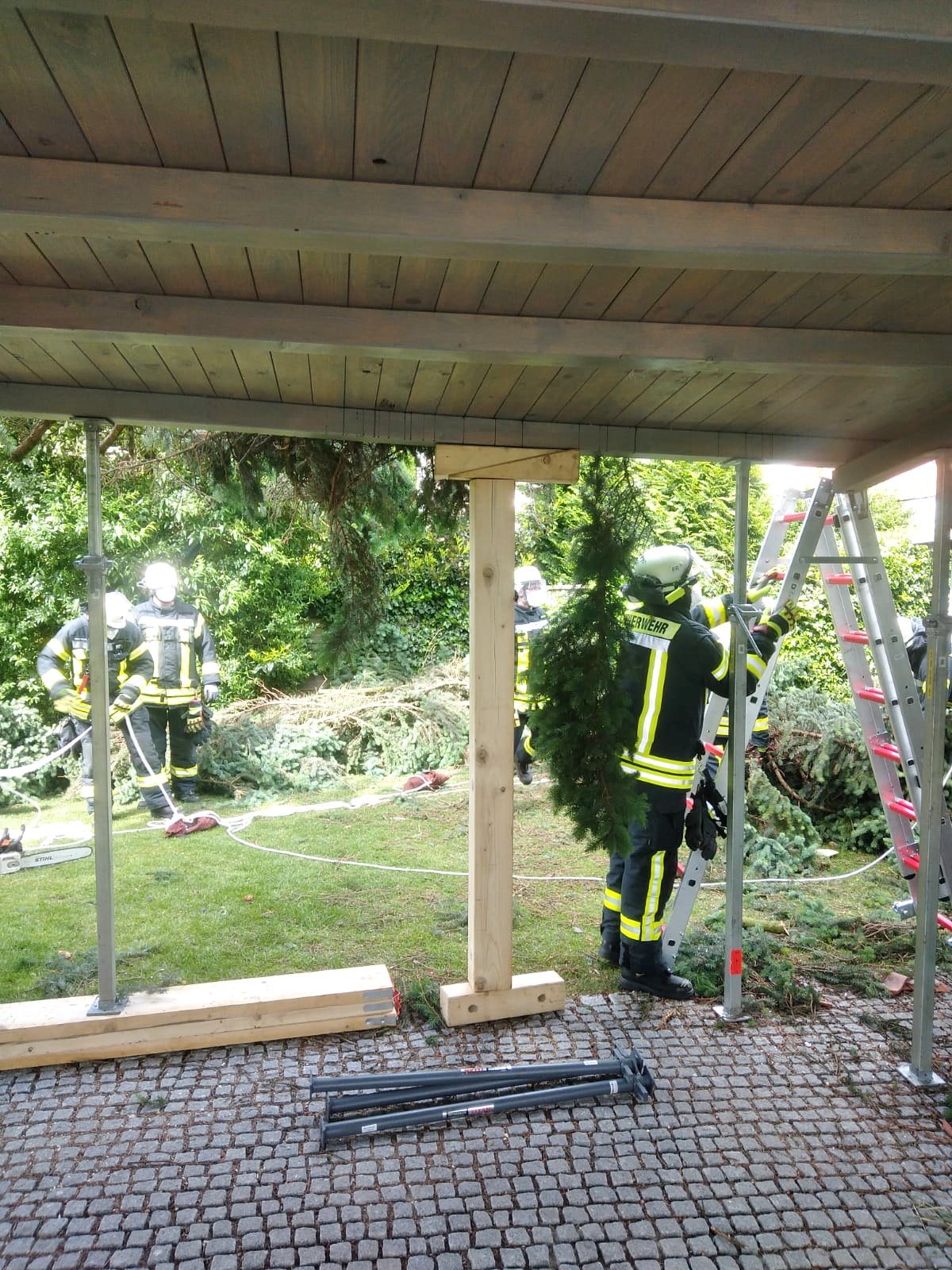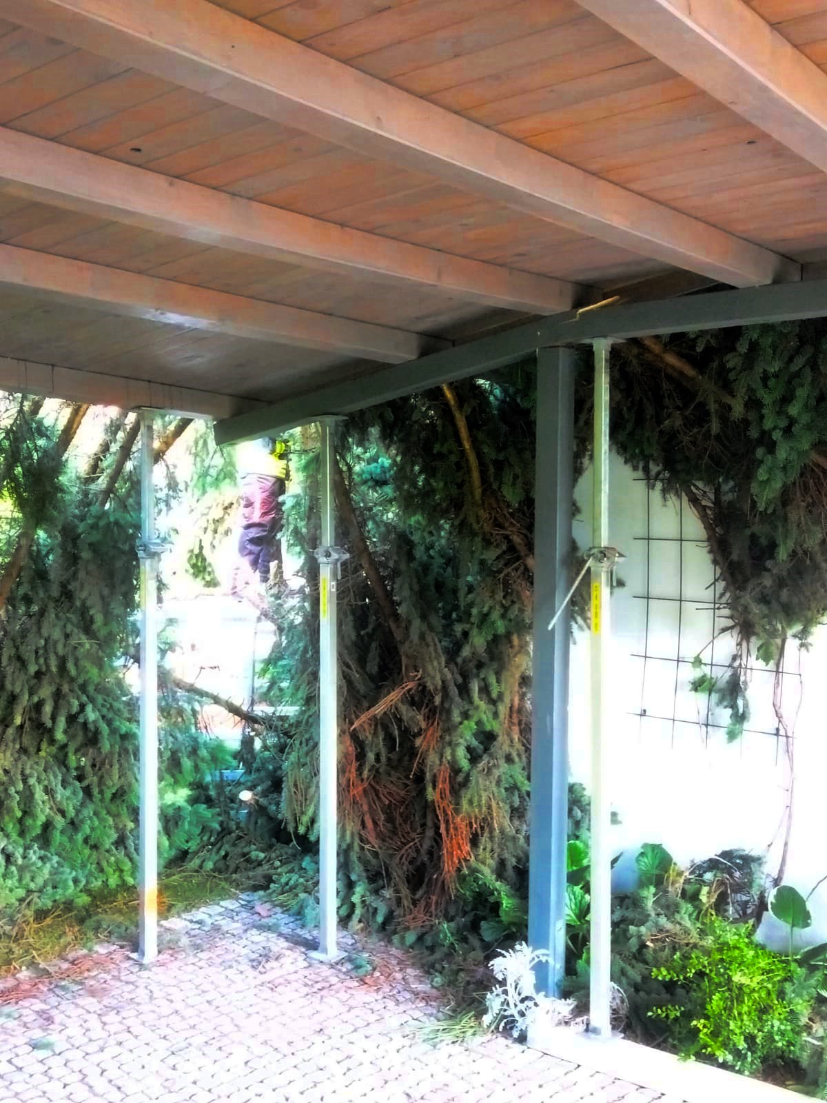 Die Einsatzkräfte stützten zunächst den Carport mit den Baustützen vom Rüstwagen ab. Dann wurde der Ast Stück für Stück zerkleinert, um ihn mit Leinen vom Carport ziehen zu können.