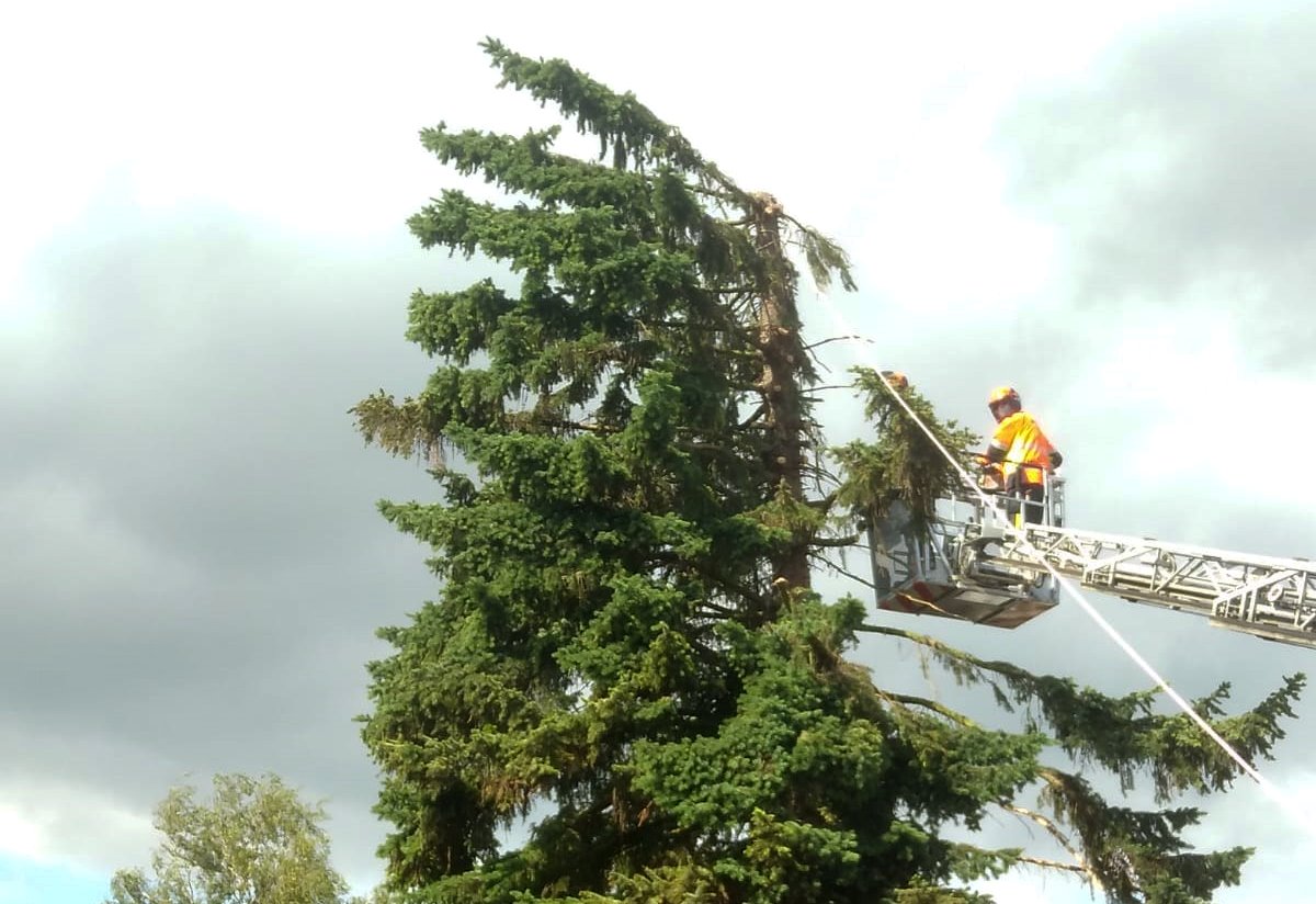 Um die Anfälligkeit gegenüber starken Windböen zu verringern, musste der Stamm mit Hilfe der Drehleiter weit gekürzt werden. Der restliche Baum war durch den fehlenden Ast ziemlich instabil.