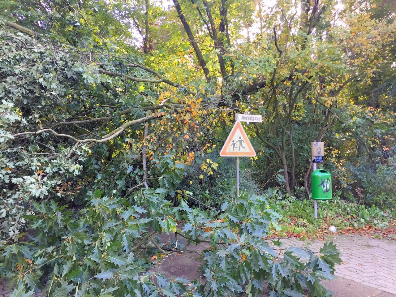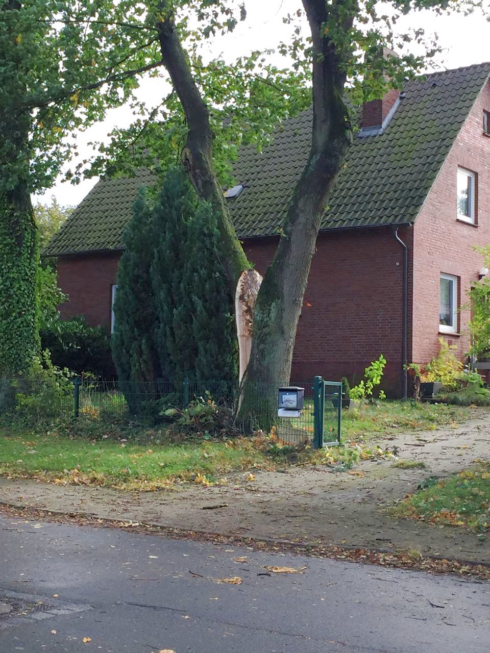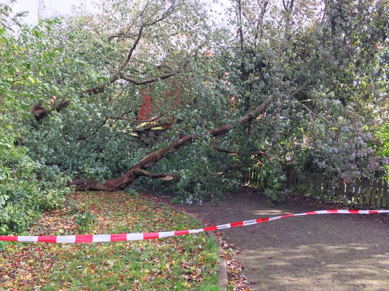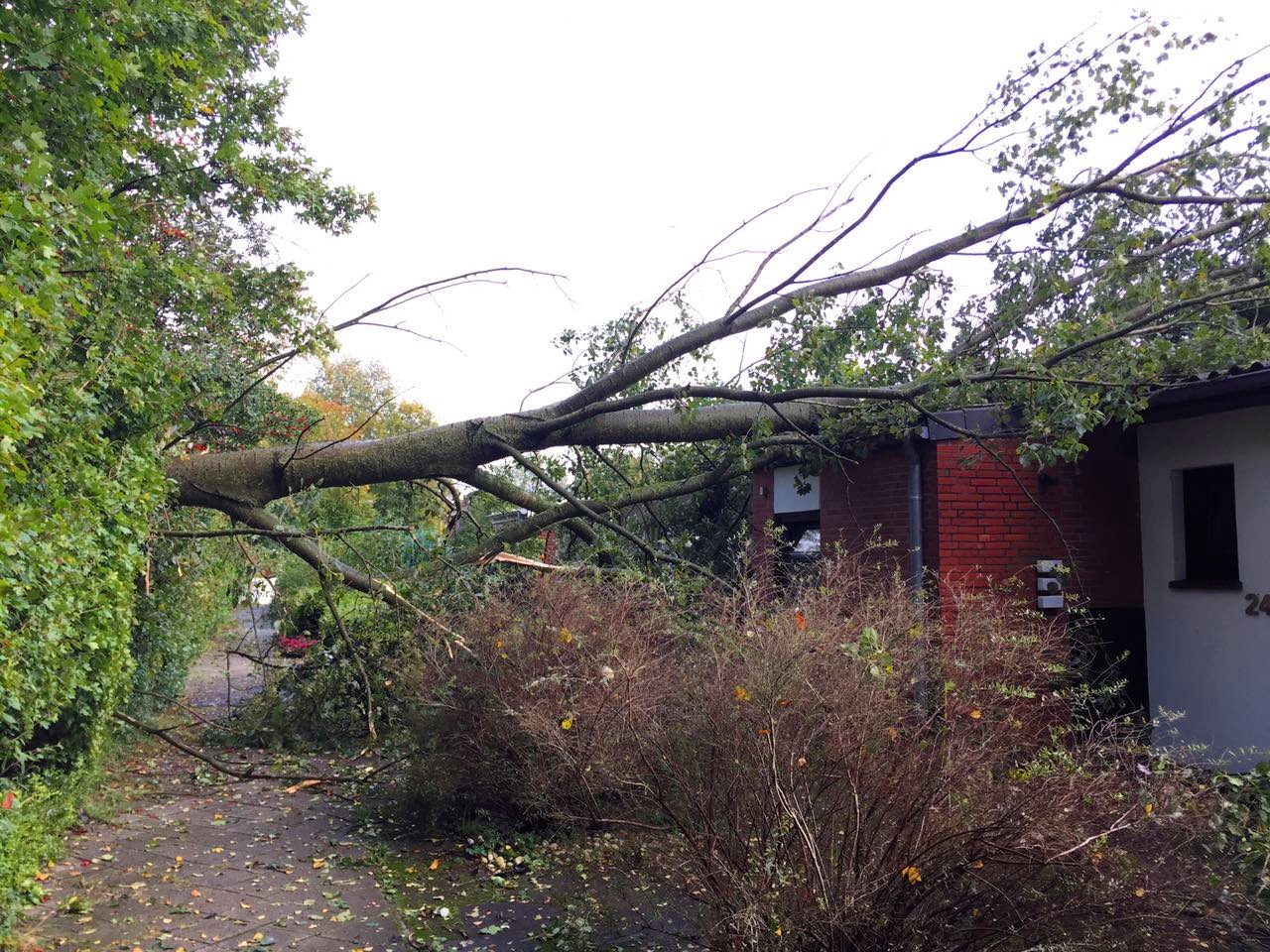 In der Grothe-Marie-Straße hatte sich ein umgestürzter Baum gegen ein Haus gelehnt. Eine Fachfirma wird hier die Arbeiten übernehmen müssen.