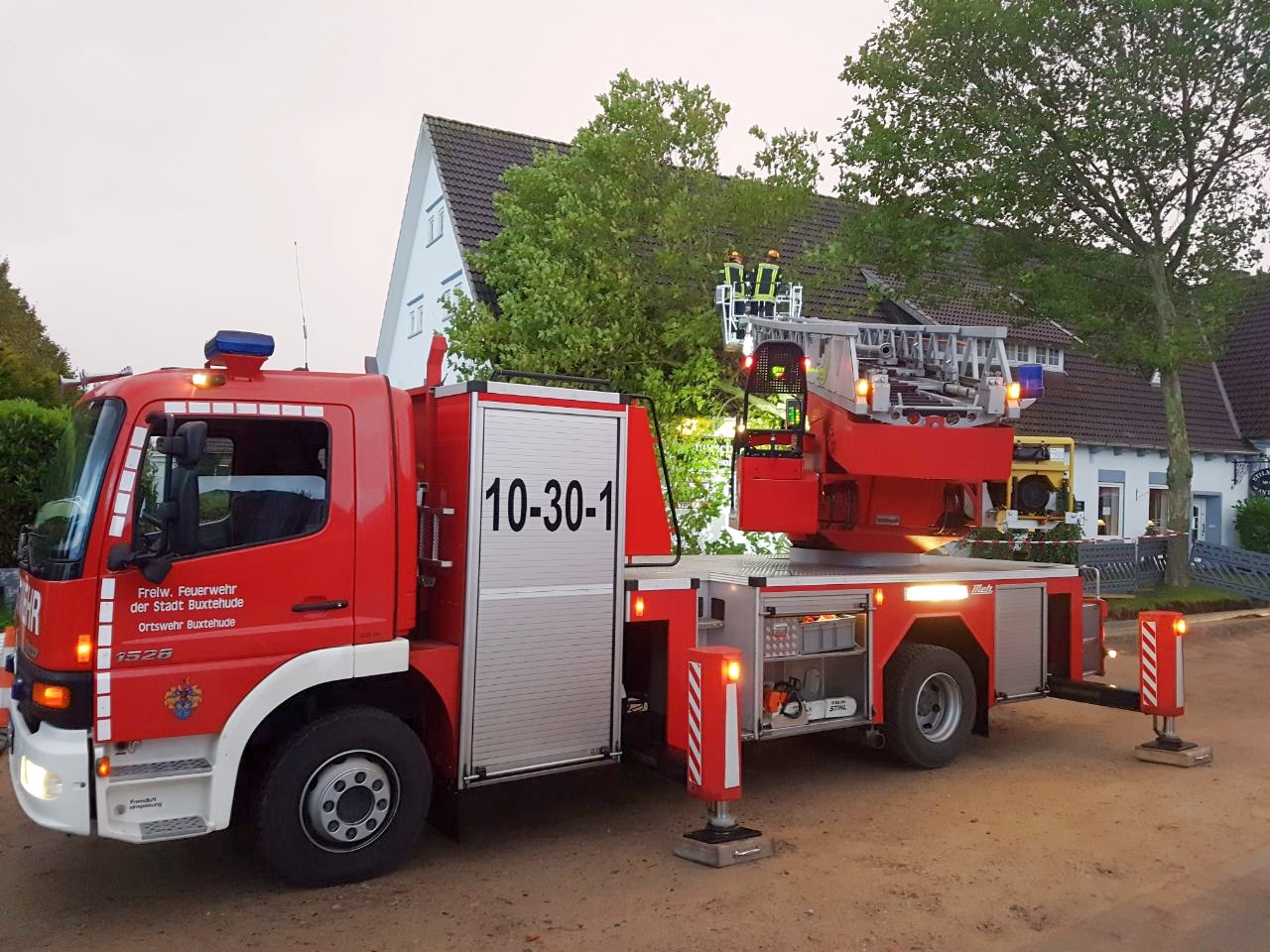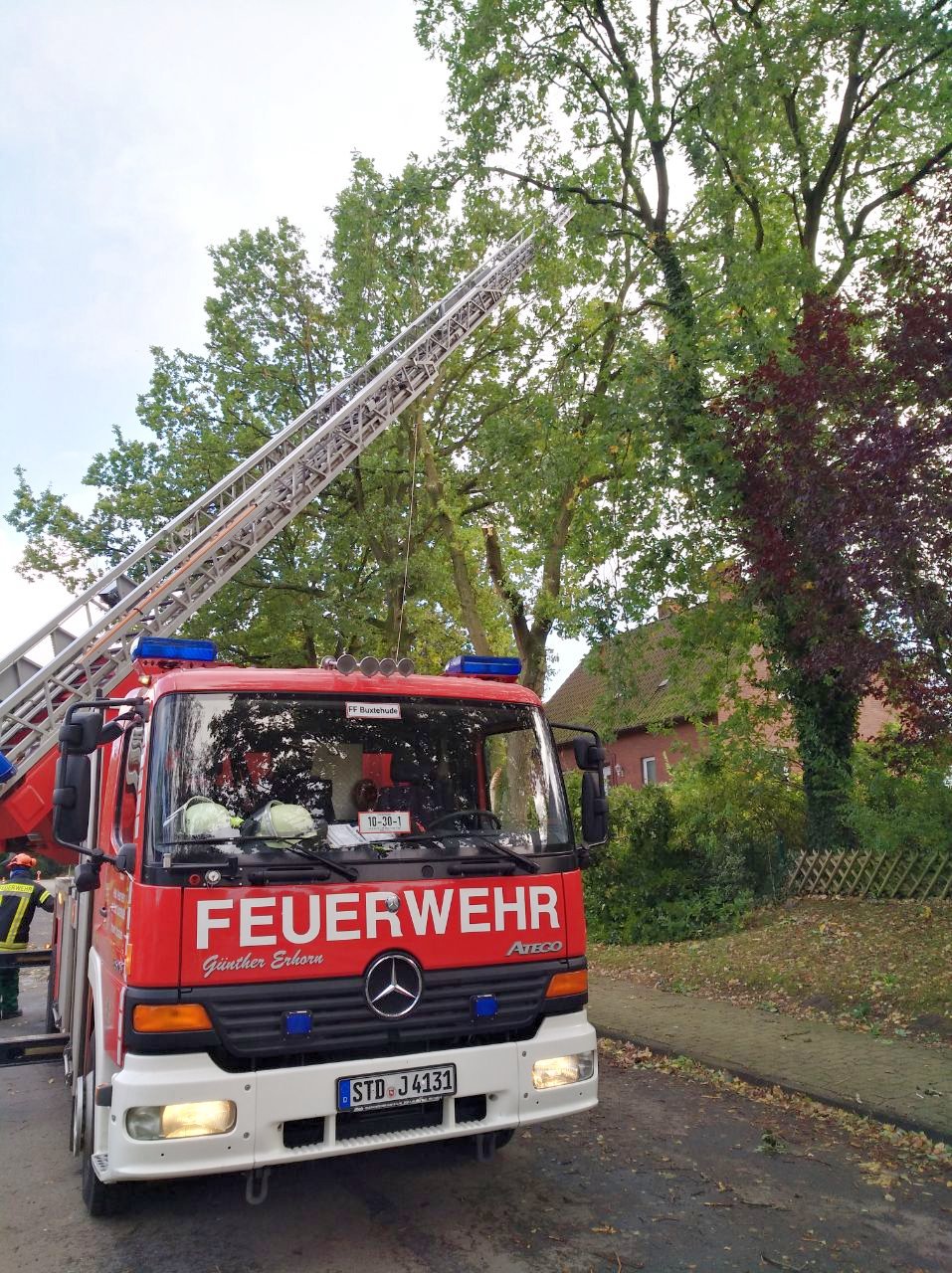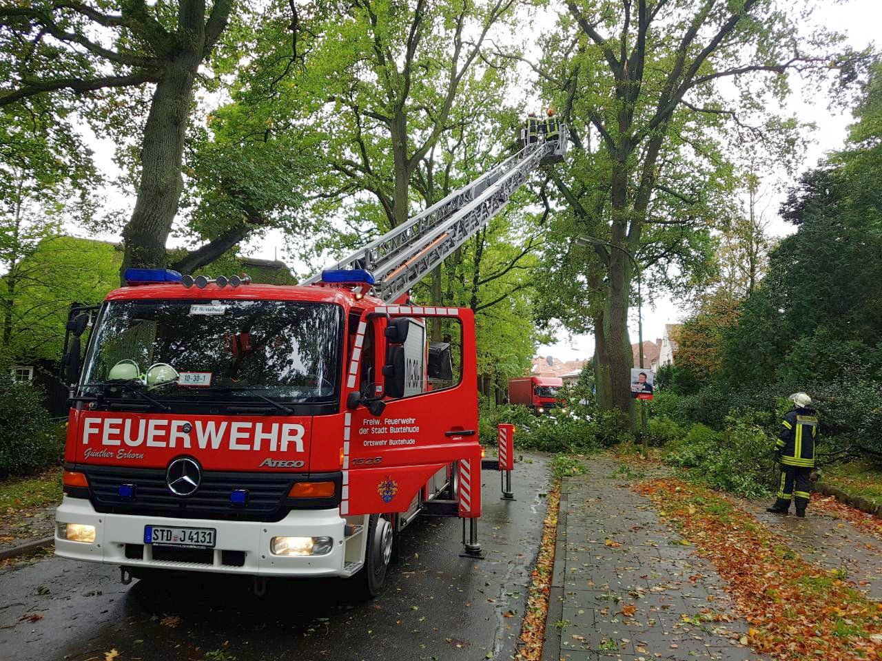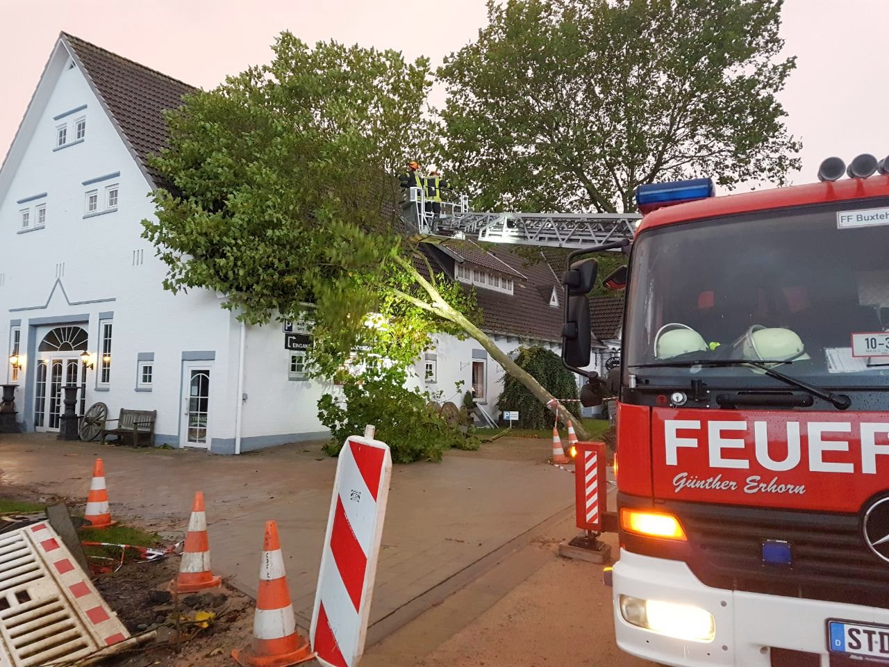 Allein knapp 70 Einsätze mussten davon im Buxtehuder Stadtgebiet abgearbeitet werden. Darunter unzählige abgebrochene oder umgestürzte Bäume, beschädigte Dächer, umgerissene Bauzäune und eine abgeknickte Ampelanlage. Alle Buxtehuder Ortsfeuerwehren waren zum Teil bis in die späten Abendstunden mit der Abarbeitung der Schäden beschäftigt. Die Drehleiter vom Zug I war pausenlos im Einsatz, so dass an einigen Einsatzstellen auf die Unterstützung durch die Drehleiter aus Harsefeld zurückgegriffen werden musste. Die Bahnerdungsgruppe aus Horneburg/Dollern musste ebenfalls bei umgestürzten Bäumen im Schienenbereich unterstützen.