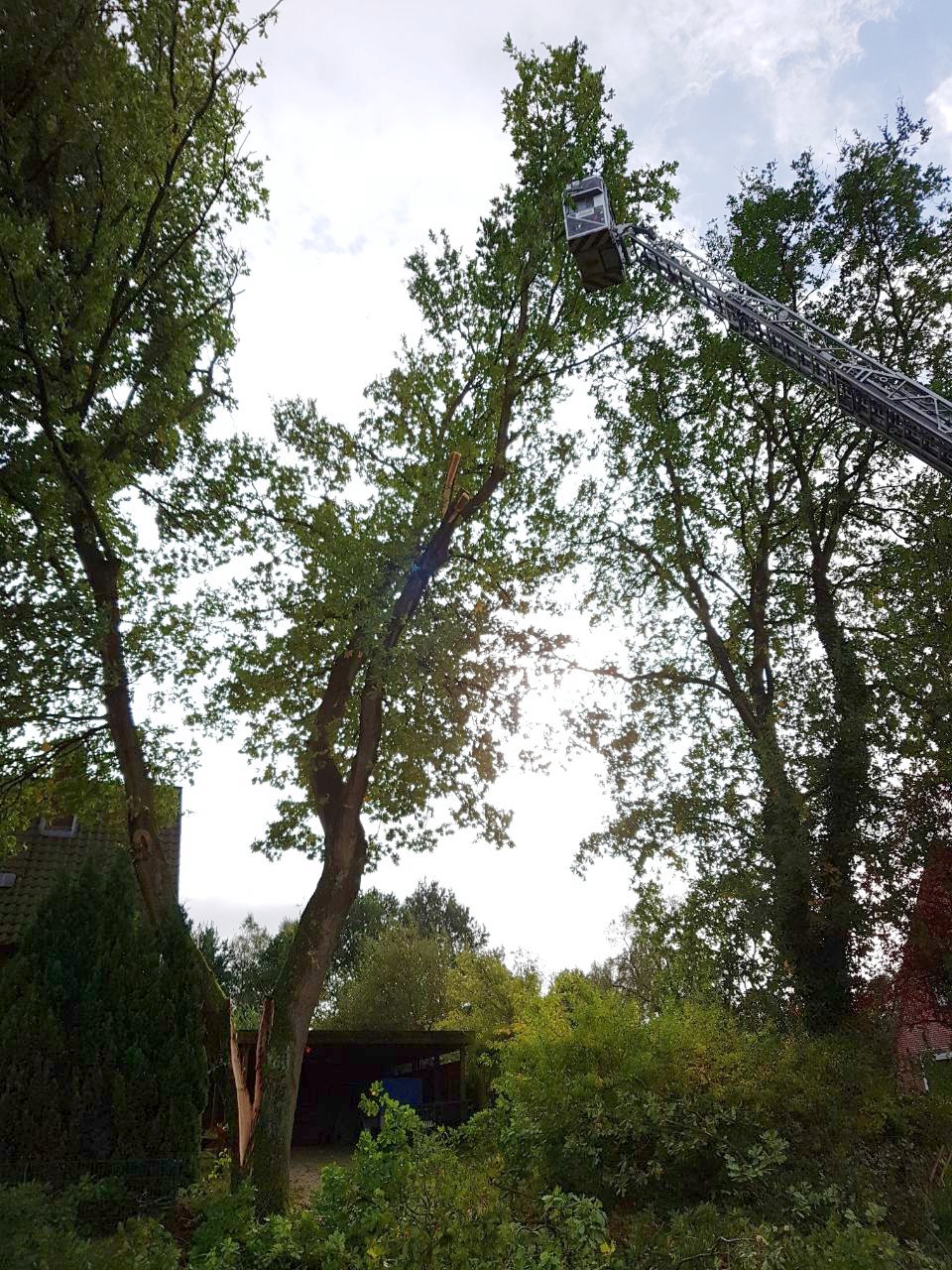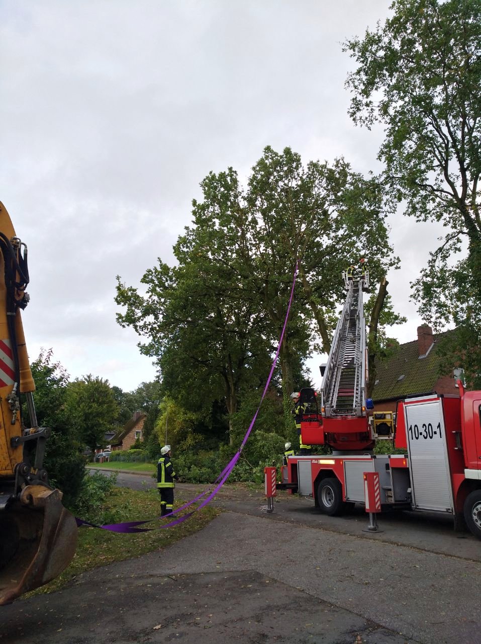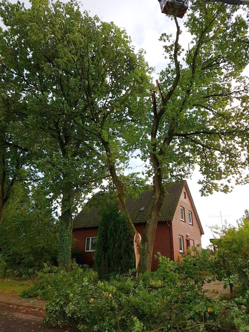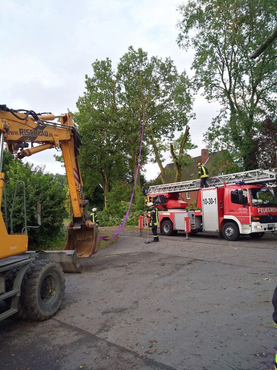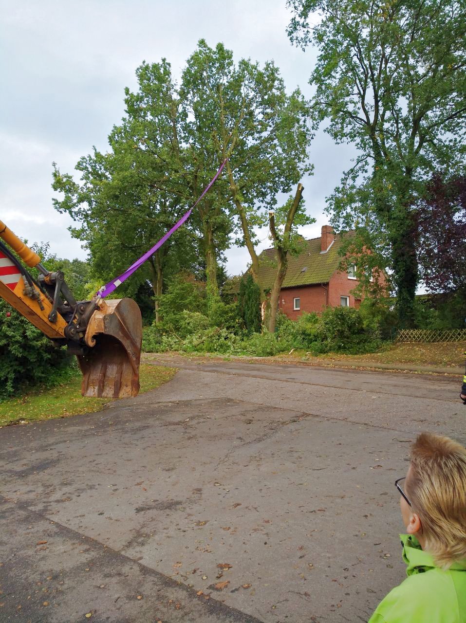 Im Eilendorfer Weg war ein Baum bis zur Wurzel gespalten und drohte auf ein Wohnhaus zu stürzen. Ein Bagger eines Buxtehuder Tiefbauunternehmens unterstützte dort beim Wegziehen des betroffenen Baumes.