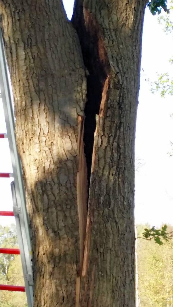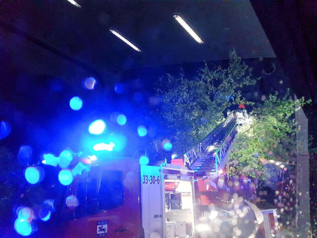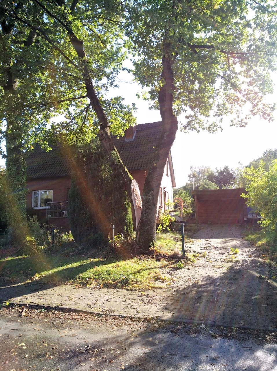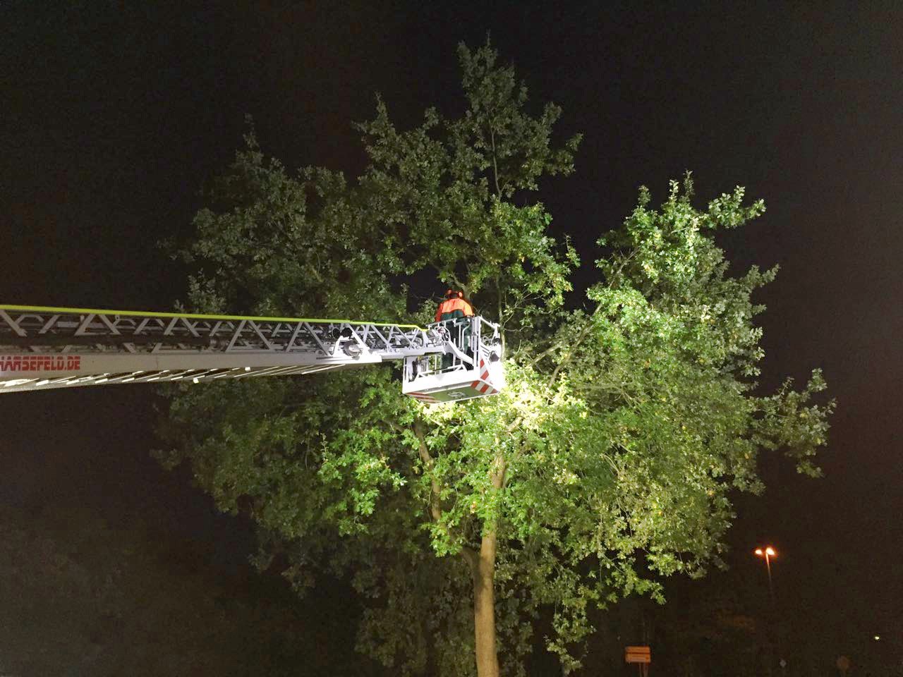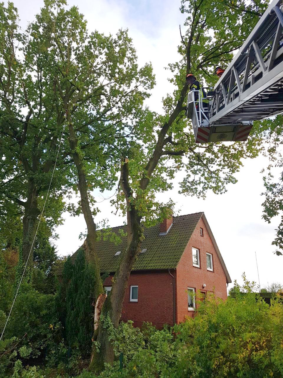Im Eilendorfer Weg war ein Baum bis zur Wurzel gespalten und drohte auf ein Wohnhaus zu stürzen. Ein Bagger eines Buxtehuder Tiefbauunternehmens unterstützte dort beim Wegziehen des betroffenen Baumes.