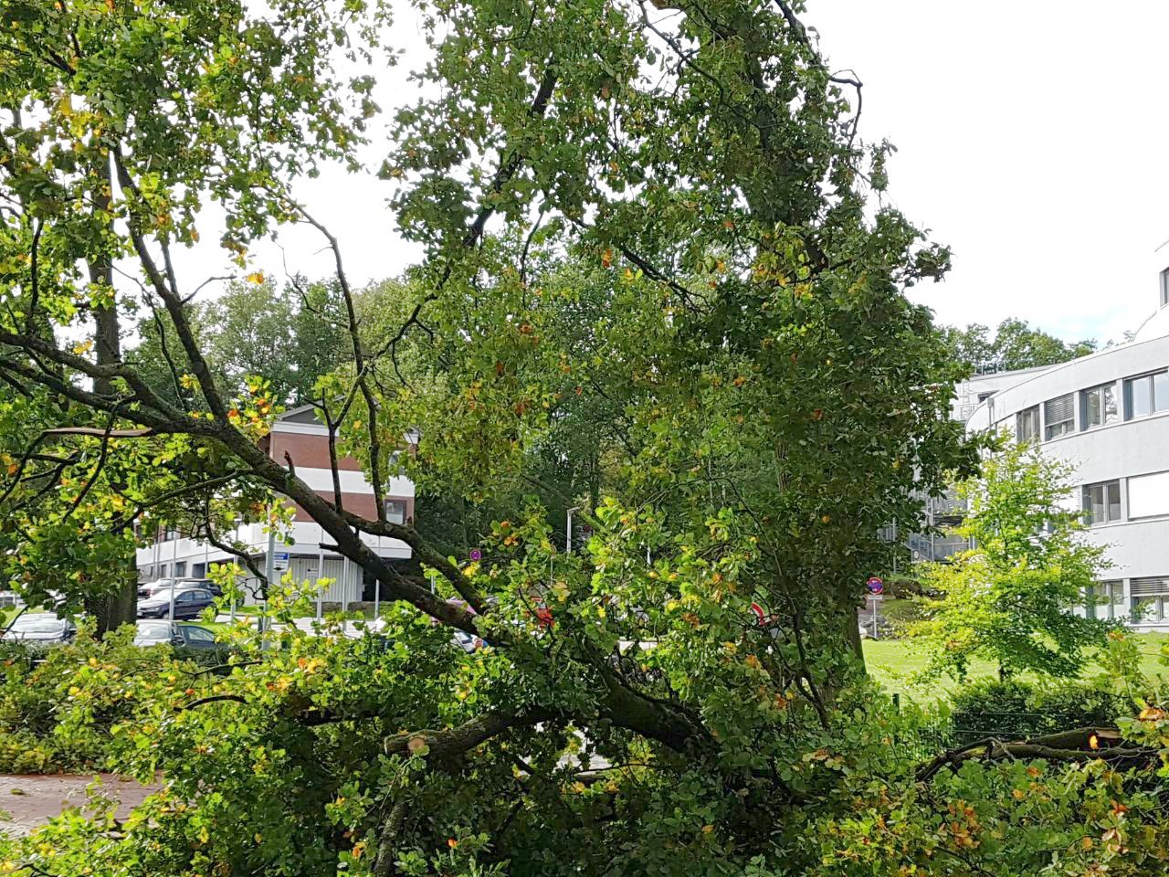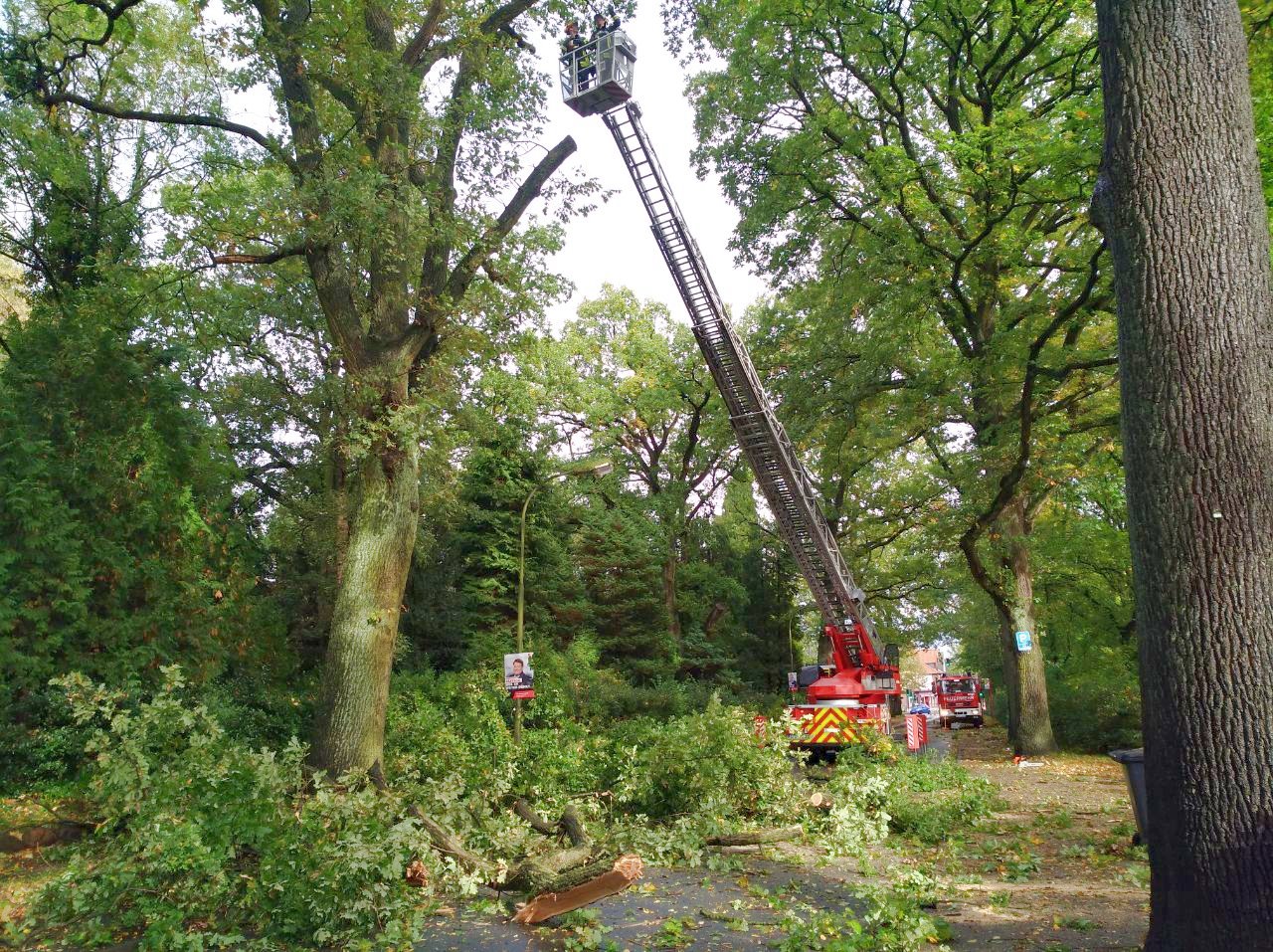 Am Krankenhaus hatten gleich mehrere Bäume den Belastungen nicht mehr Stand gehalten. Die Ortsfeuerwehr Ottensen und die Drehleiter vom Zug I übernahmen hier die Abarbeitung.
