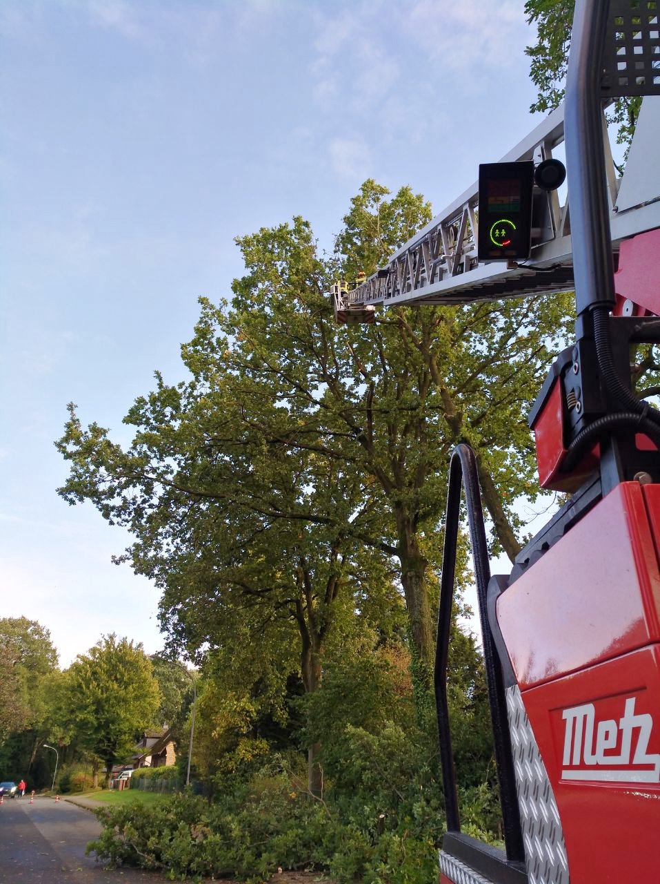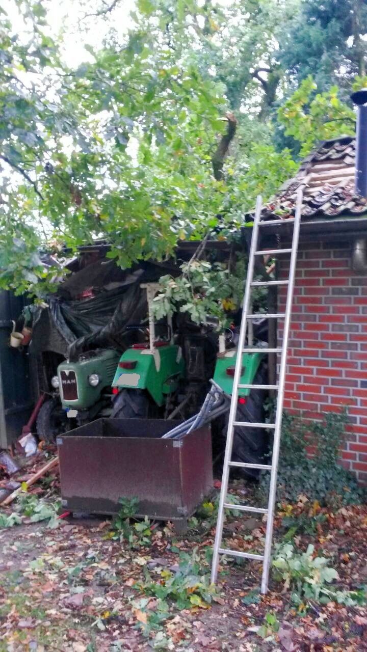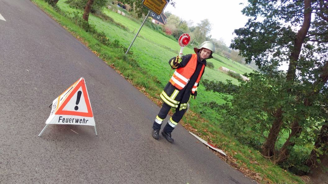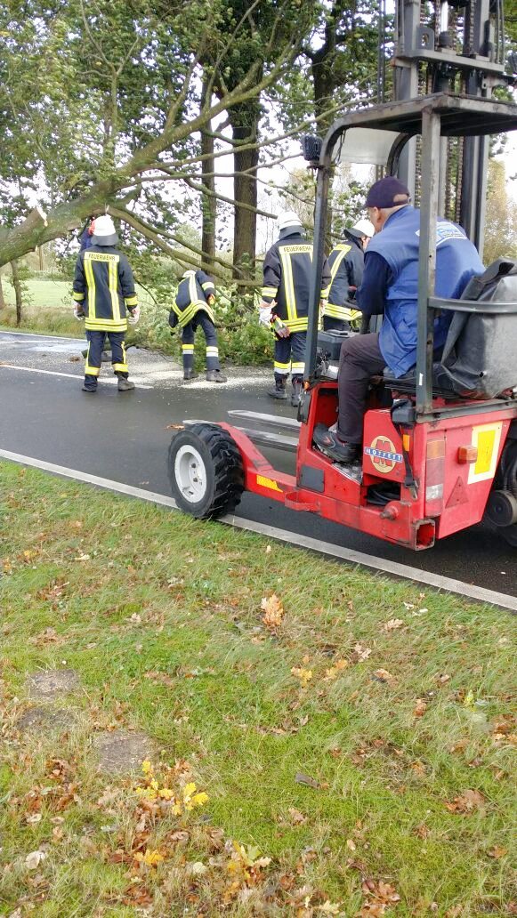 Auf der Jorker Chaussee lag ein großer Baum quer über beide Fahrstreifen. Ein im Stau wartender LKW-Fahrer unterstützte die Dammhausener Einsatzkräfte mit seinem Mitnahmestapler beim Wegräumen des Baumes. Ein weiterer Baum auf der anderen Straßenseite drohte umzustürzen. Mit einem Frontlader konnte der Baum aus der Gefahrenzone gezogen werden.