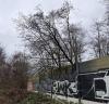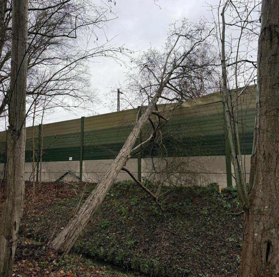 Hinter der Bebauung im Brillenburgskamp kippte am Neujahrsmittag ein etwa 15 m hoher Baum um und wurde nur noch von der Schallschutzmauer zum Industrie-Bahngleis gehalten.
