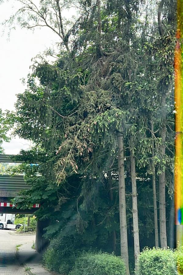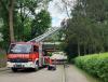 Starke Windböen ließen am Samstagnachmittag im Eichenweg die Spitze einer Tanne abknicken. Da sich die schadhafte Stelle in etwa 15m Höhe befand ließ der Buxtehuder Ortsbrandmeister von der Einsatzstelle neben den Einsatzkräften vom Zug II der Ortsfeuerwehr Buxtehude auch die Drehleiter vom Zug I alarmieren.