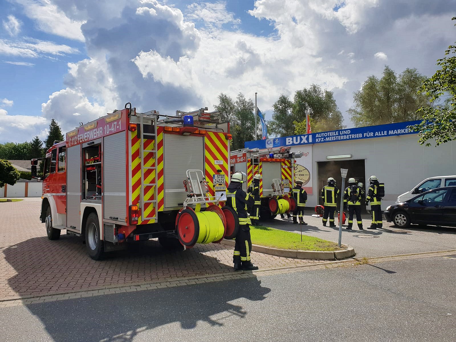 An der Einsatzstelle in der Konrad-Adenauer-Allee hatte in der Werkstatthalle des betroffenen Gebäudes ein PKW auf einer Hebebühne zu brennen begonnen. Ein Mitarbeiter, auch Mitglied in der Ortsfeuerwehr Daensen, hatte umgehend zum Feuerlöscher gegriffen und die Flammen im Innenraum abgelöscht. Durch den verbrannten Kunststoff hatten sich in der Halle binnen kürzester Zeit dicke Rauchschwaden gebildet.