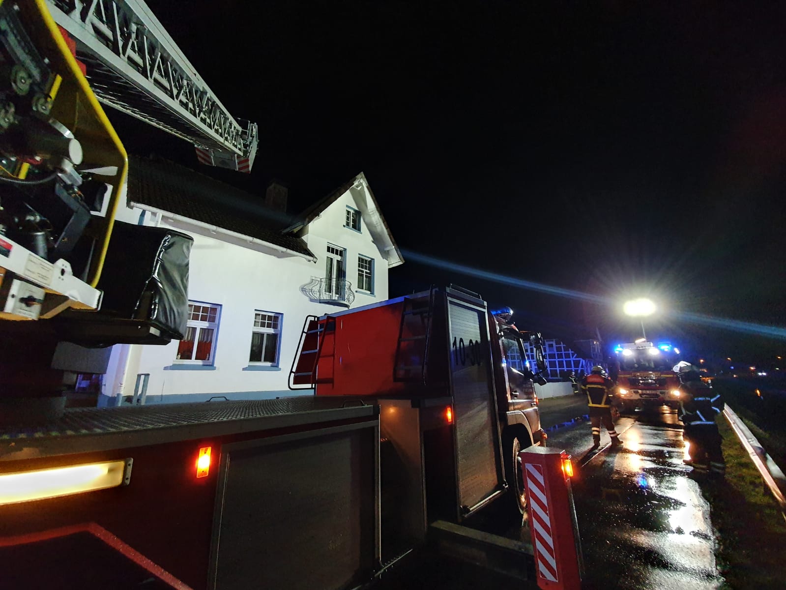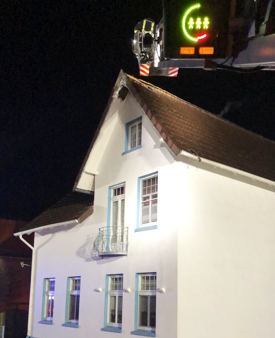 Aus dem Korb des Hubrettungsfahrzeugs wurden Reservedachpfannen provisorisch wieder in die etwa einen Quadratmeter große Öffnung gelegt.