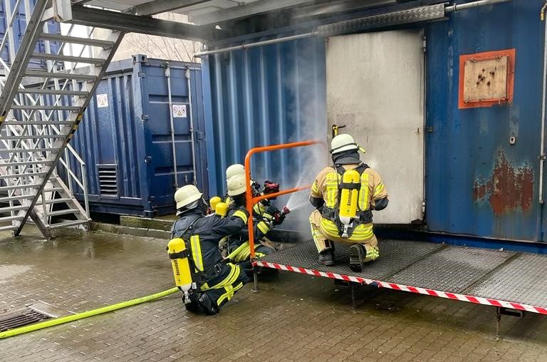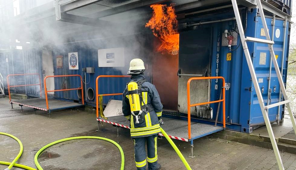 Nach einer kleinen Stärkung am Morgen, der jährlichen Atemschutzeinweisung, einer Einweisung in die Atemschutztechnik vor Ort und dem Anlegen der PSA (Persönliche Schutzausrüstung), ging es mit der ersten Übung los. Dargestellt wurde ein sog. Flashover im Inneren eines Containers. Eindrucksvoll verfolgten die Teilnehmer die Flammen, welche sich über deren Köpfen ausbreiteten. Hier wurde einmal mehr deutlich wie wichtig eine moderne und korrekt sitzende PSA doch ist, denn bei Temperaturen von etwa 500°C an der Decke, kam auf der Haut der Teilnehmer nicht viel an.