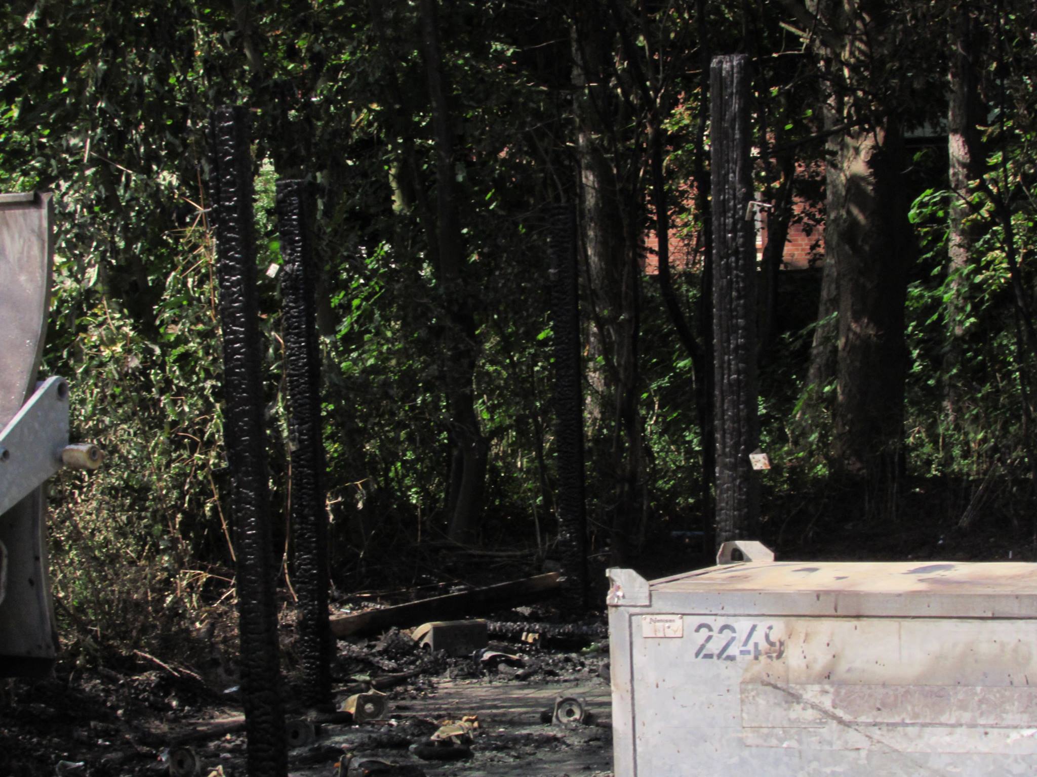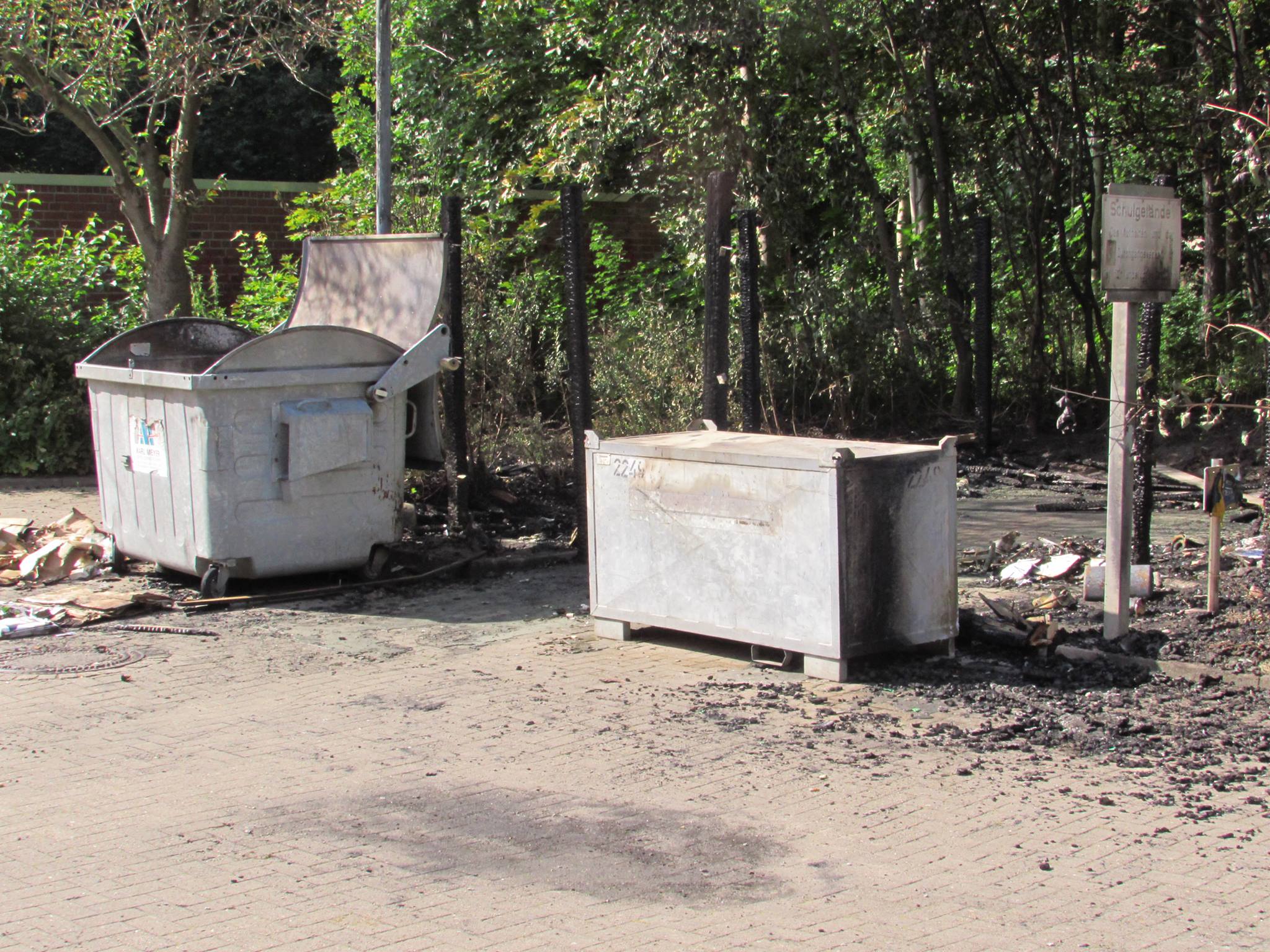 Gegen vier Uhr wurden die Einsatzkräfte zum Schulzentrum Nord alarmiert. Dort stand der komplette Abfallsammelplatz nebst umliegender Bäume und Sträucher in Flammen. Auf der etwa 5x5 Meter großen Fläche brannten sechs Kunststoffcontainer und weitere zwei Metallcontainer vollständig ab. Eine Straßenlaterne und die Holzwandumrandung des Platzes standen ebenfalls komplett in Flammen. Mehrere umliegend stehende Bäume wurden zum Teil stark beschädigt.