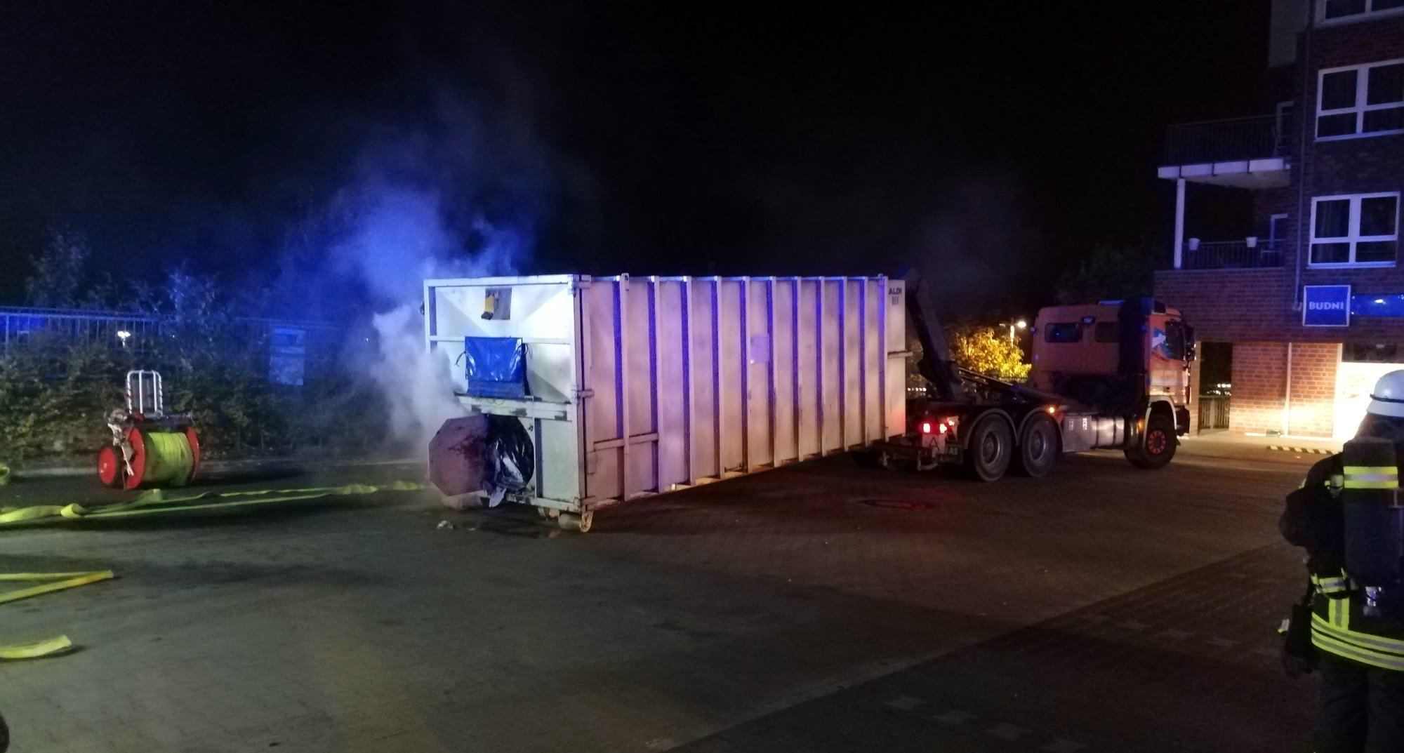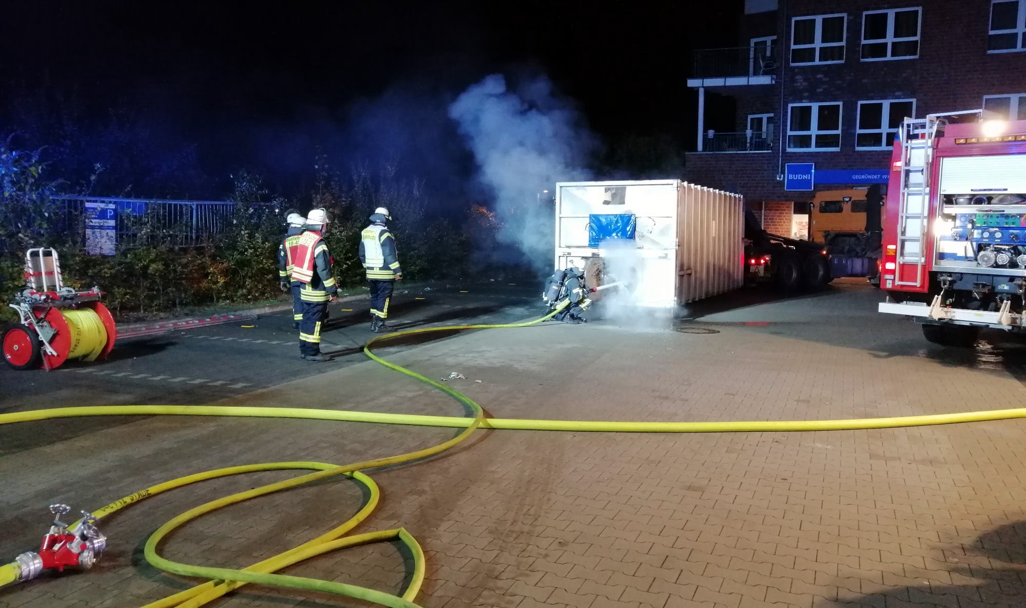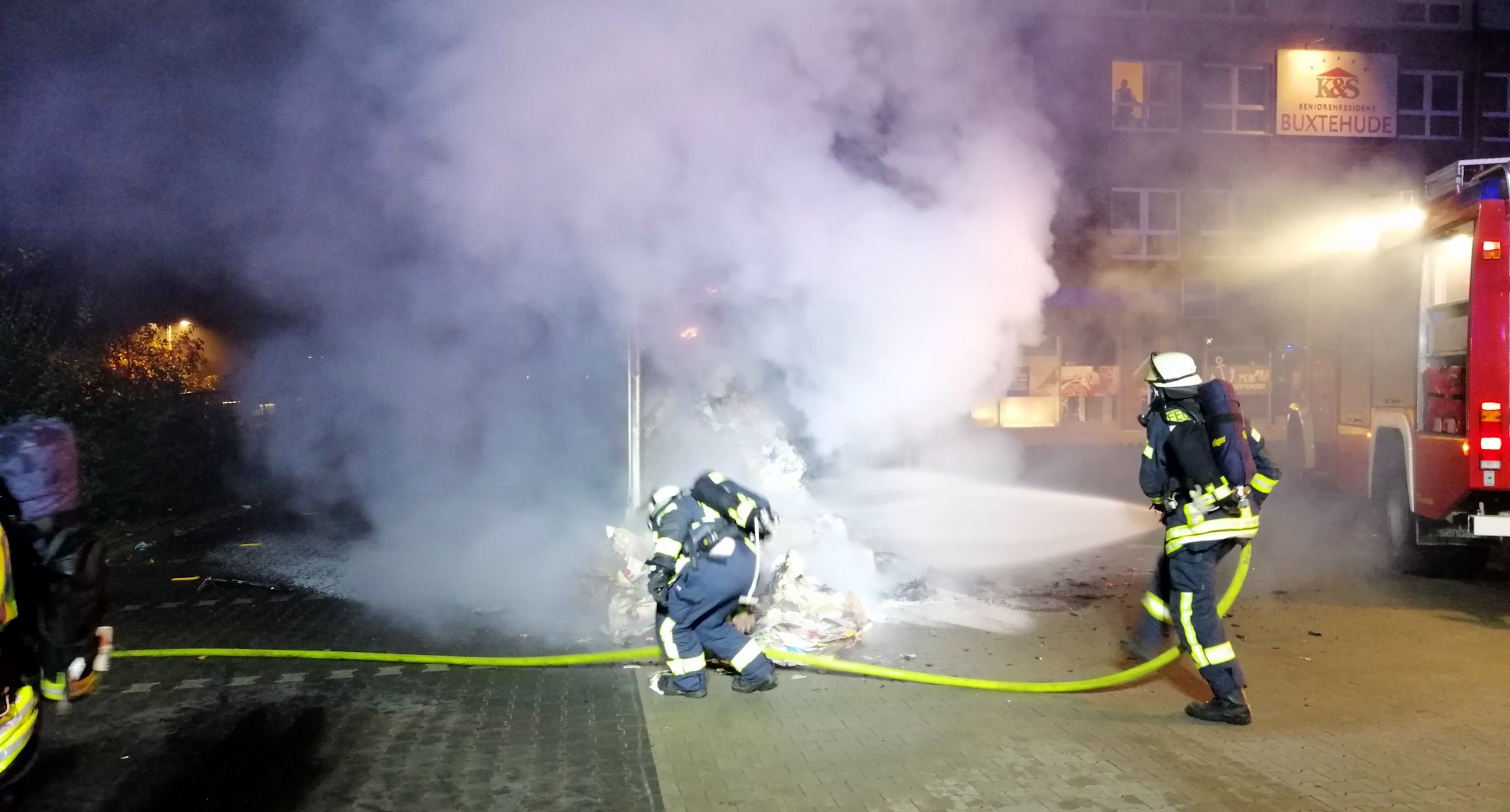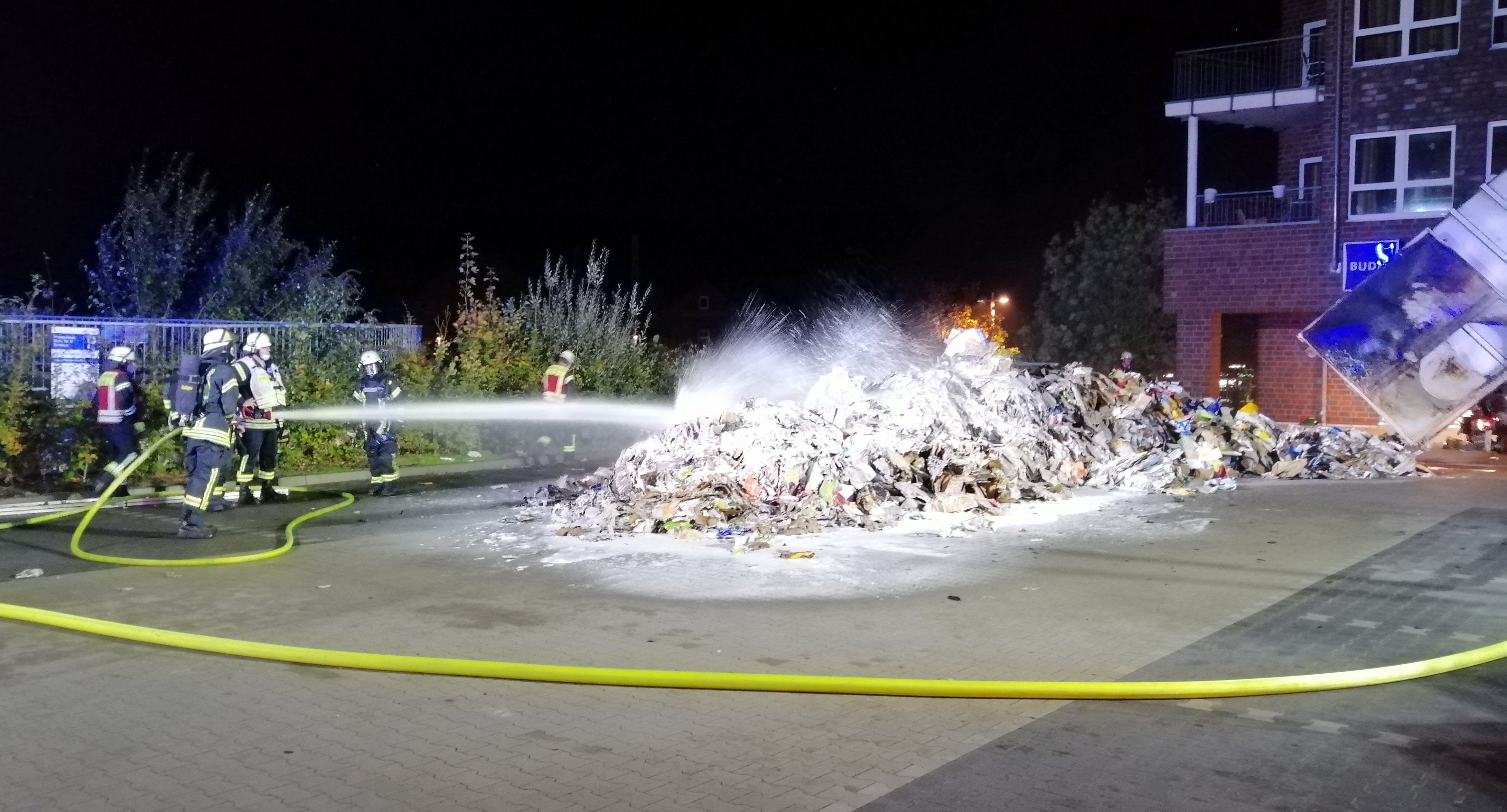 Zu einem Brandeinsatz wurde der Zug II der Ortsfeuerwehr Buxtehude am Dienstagabend in die Stader Straße alarmiert. Am Gebäude eines dortigen Discounters hatten sich Kartonagen in der Papierpresse und einem angeflanschten Abrollbehälter entzündet. Für die zuerst eintreffenden Kräfte war das Feuer zunächst nicht zu erreichen. Die starke Verqualmung des brennenden Papiers hatte sich jedoch bereits bis in die Verkaufsräume ausgebreitet. Umgehend wurden der Zug I zur Absicherung nachgefordert und zwei Elektrolüfter im Markt in Stellung gebracht, die das weitere Eindringen von Rauch verhindern sollten. Ein erster Löschangriff an der Pressanlage wurde vorgenommen. Nach einer kurzen Sondierung der Lage wurde ein Wechselladerfahrzeug von einem Privatunternehmen angefordert. Nach dessen Eintreffen war es möglich den im Inneren brennenden Container vom Gebäude wegzuziehen und auf dem Parkplatz zu entleeren.