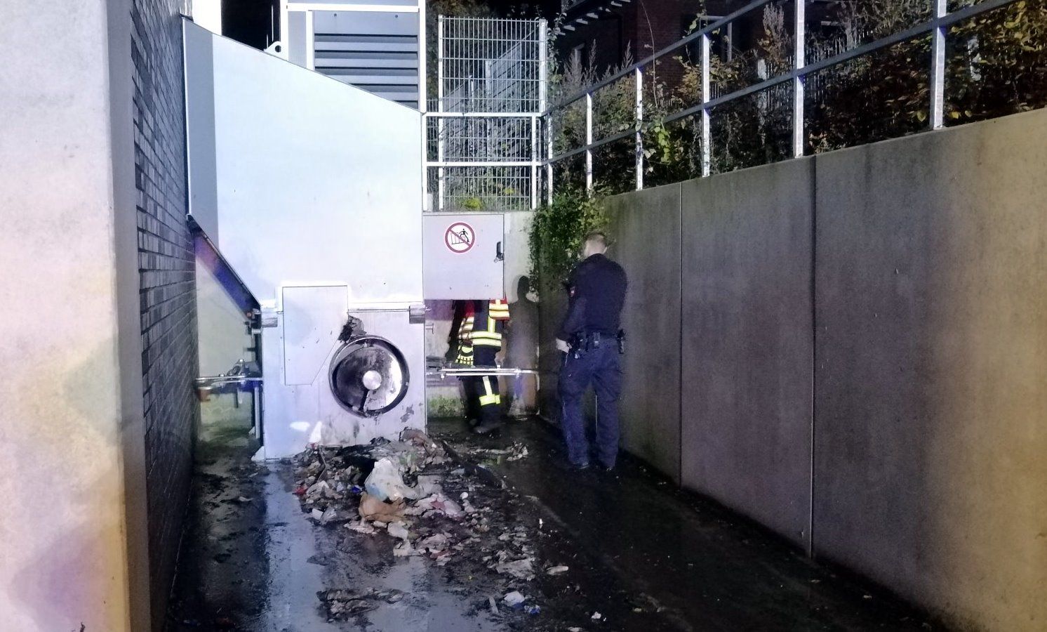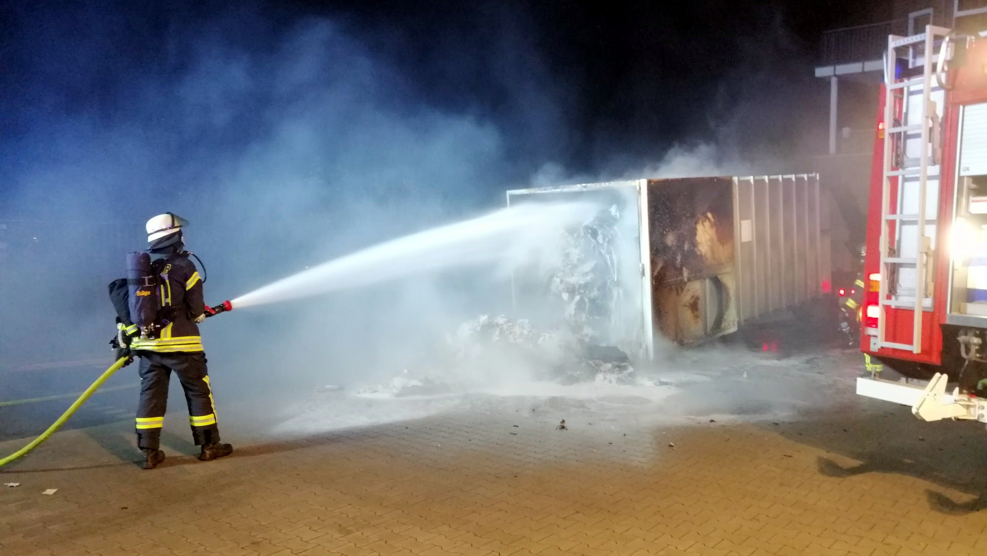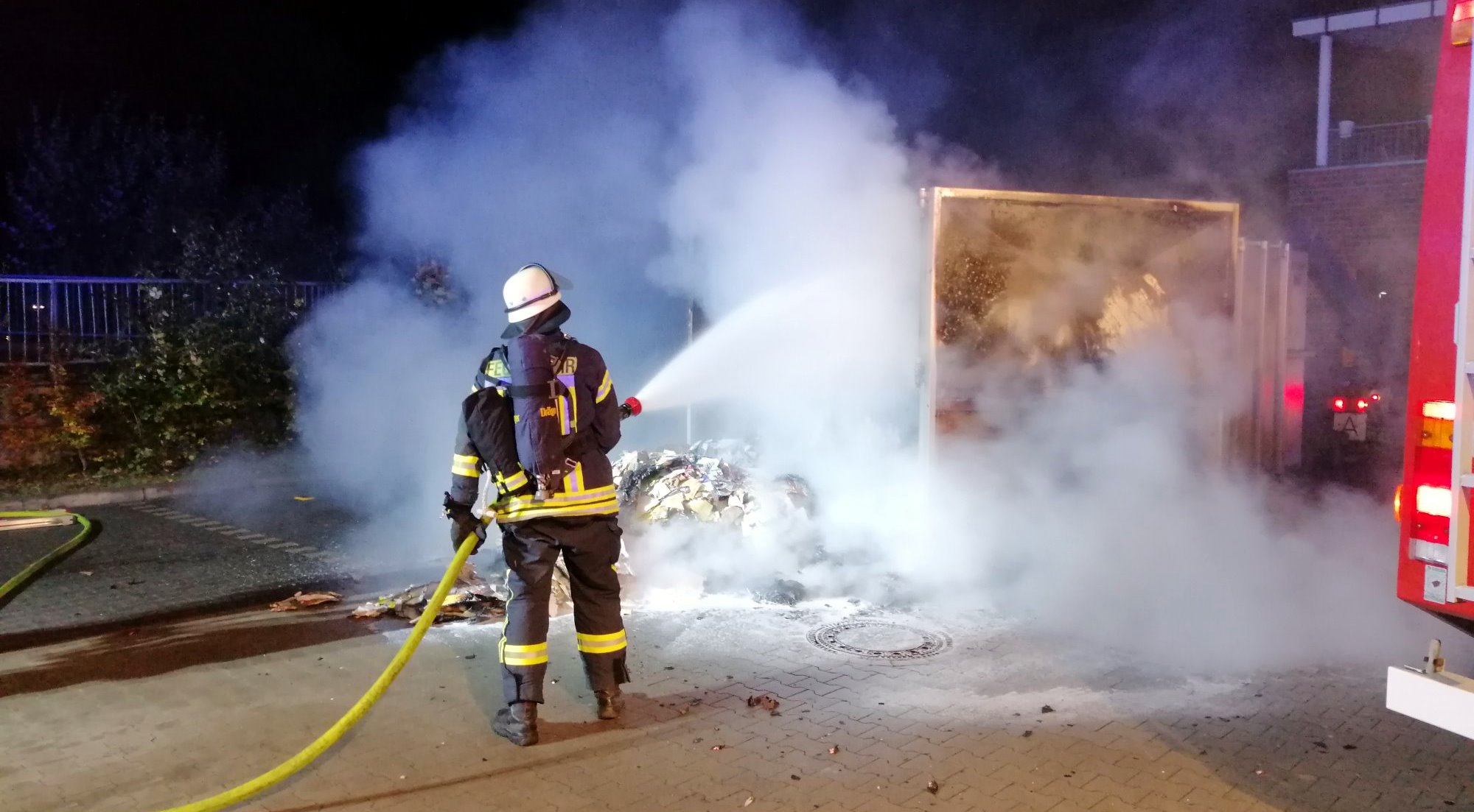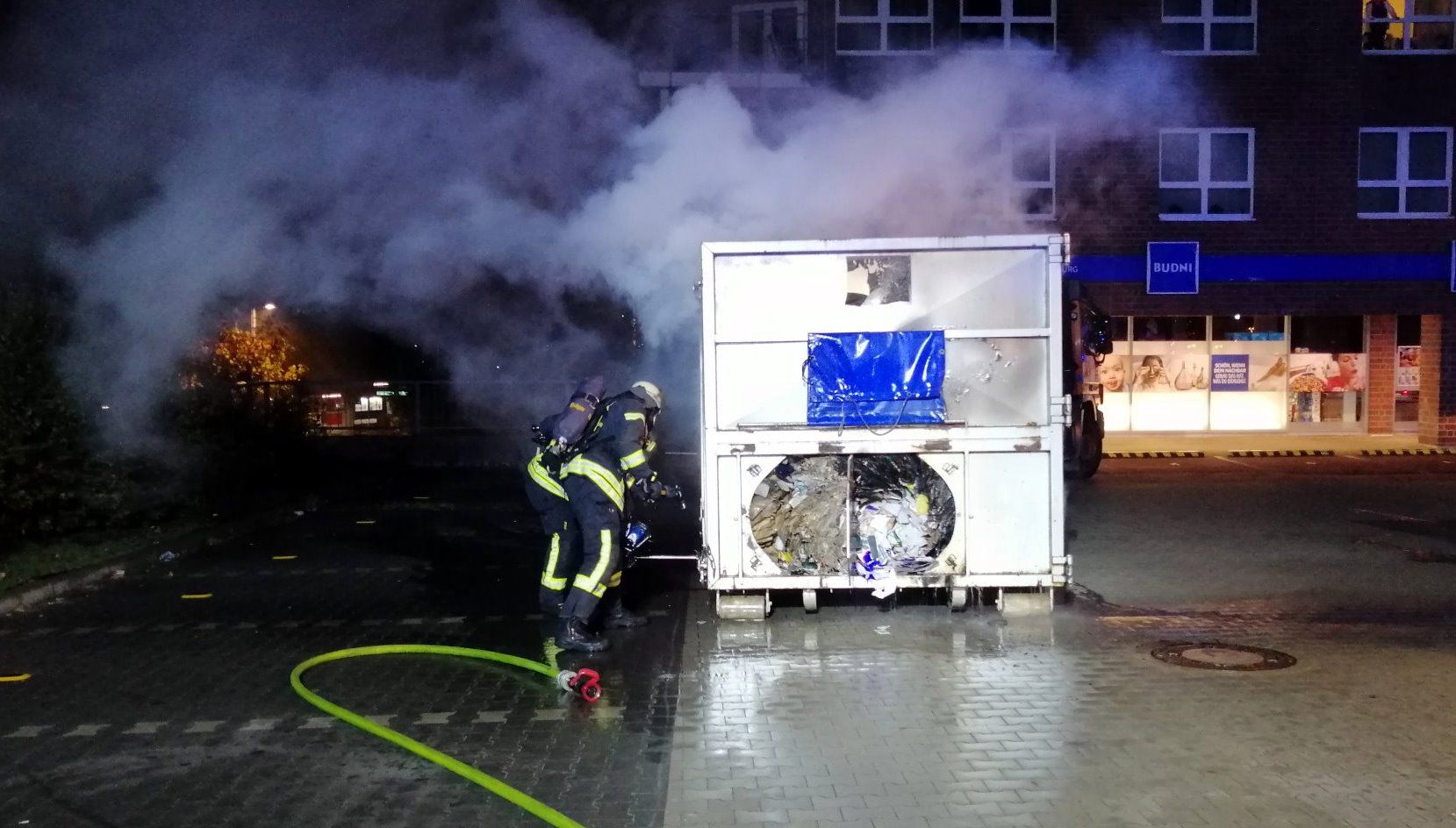 Zu einem Brandeinsatz wurde der Zug II der Ortsfeuerwehr Buxtehude am Dienstagabend in die Stader Straße alarmiert. Am Gebäude eines dortigen Discounters hatten sich Kartonagen in der Papierpresse und einem angeflanschten Abrollbehälter entzündet. Für die zuerst eintreffenden Kräfte war das Feuer zunächst nicht zu erreichen. Die starke Verqualmung des brennenden Papiers hatte sich jedoch bereits bis in die Verkaufsräume ausgebreitet. Umgehend wurden der Zug I zur Absicherung nachgefordert und zwei Elektrolüfter im Markt in Stellung gebracht, die das weitere Eindringen von Rauch verhindern sollten. Ein erster Löschangriff an der Pressanlage wurde vorgenommen. Nach einer kurzen Sondierung der Lage wurde ein Wechselladerfahrzeug von einem Privatunternehmen angefordert. Nach dessen Eintreffen war es möglich den im Inneren brennenden Container vom Gebäude wegzuziehen und auf dem Parkplatz zu entleeren.