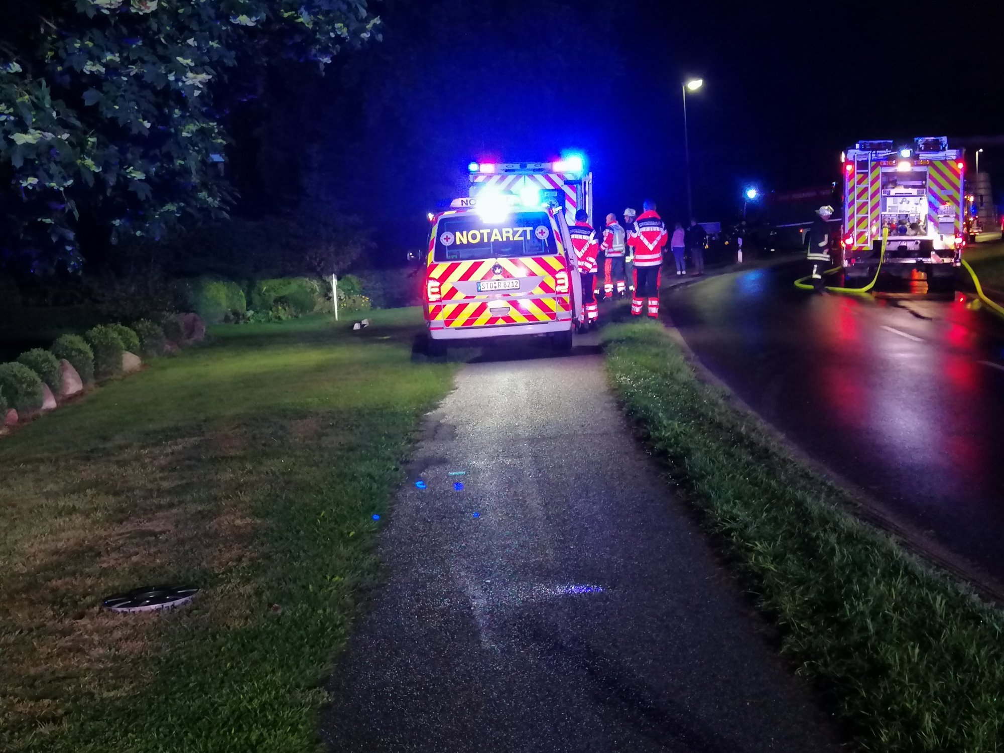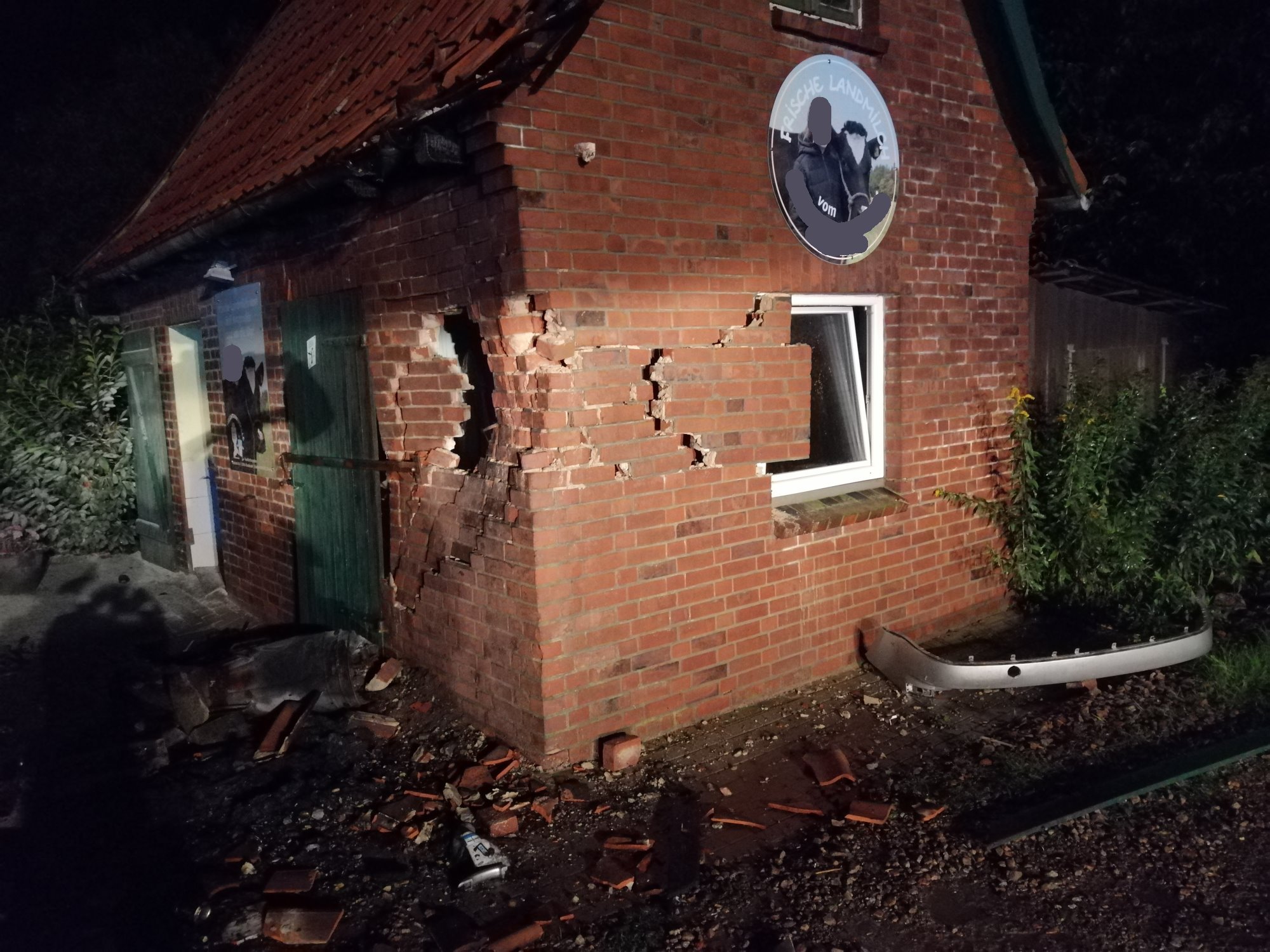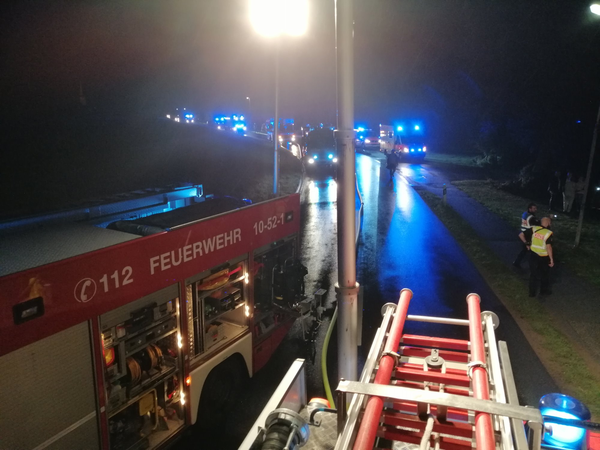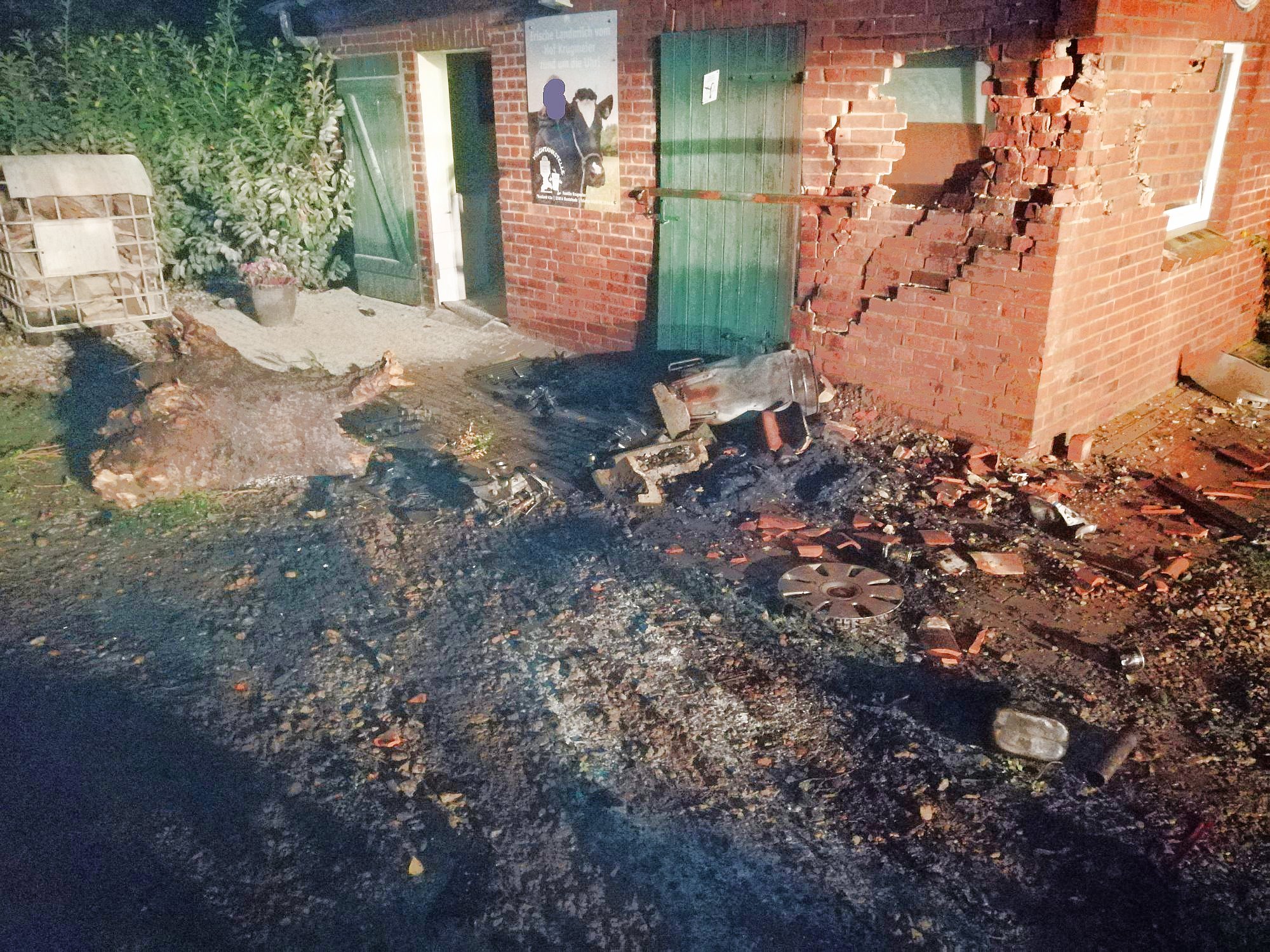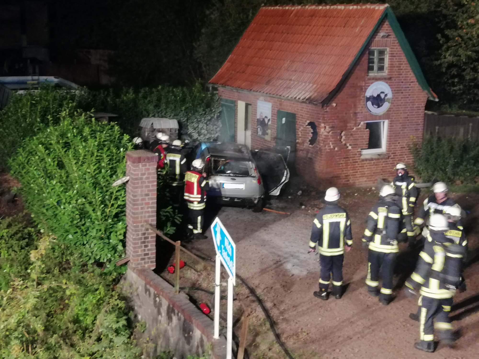 Ein sehr schwerer Verkehrsunfall ereignete sich am späten Montagabend auf der Straße "Neuland" (K39). Der Fahrer eines PKW kam dabei in Richtung Estebrügge in einer leichten Rechtskurve nach links von der Fahrbahn ab, streifte einen Begrenzungspfahl und fuhr auf dem dortigen Grünstreifen weiter geradeaus. Ein mit Felssteinen ausgelegtes Steinbeet an einer Hofeinfahrt wurde zur Sprungschanze. Der Wagen flog über eine fast 25m breite Rasenfläche, riss eine große Baumwurzel aus einer Hecke und schlug frontal in einem massiv gemauerten Gebäude ein. Dabei überschlug sich das Fahrzeug und blieb auf der Seite an dem Klinkerbau liegen. Es fing sofort Feuer.