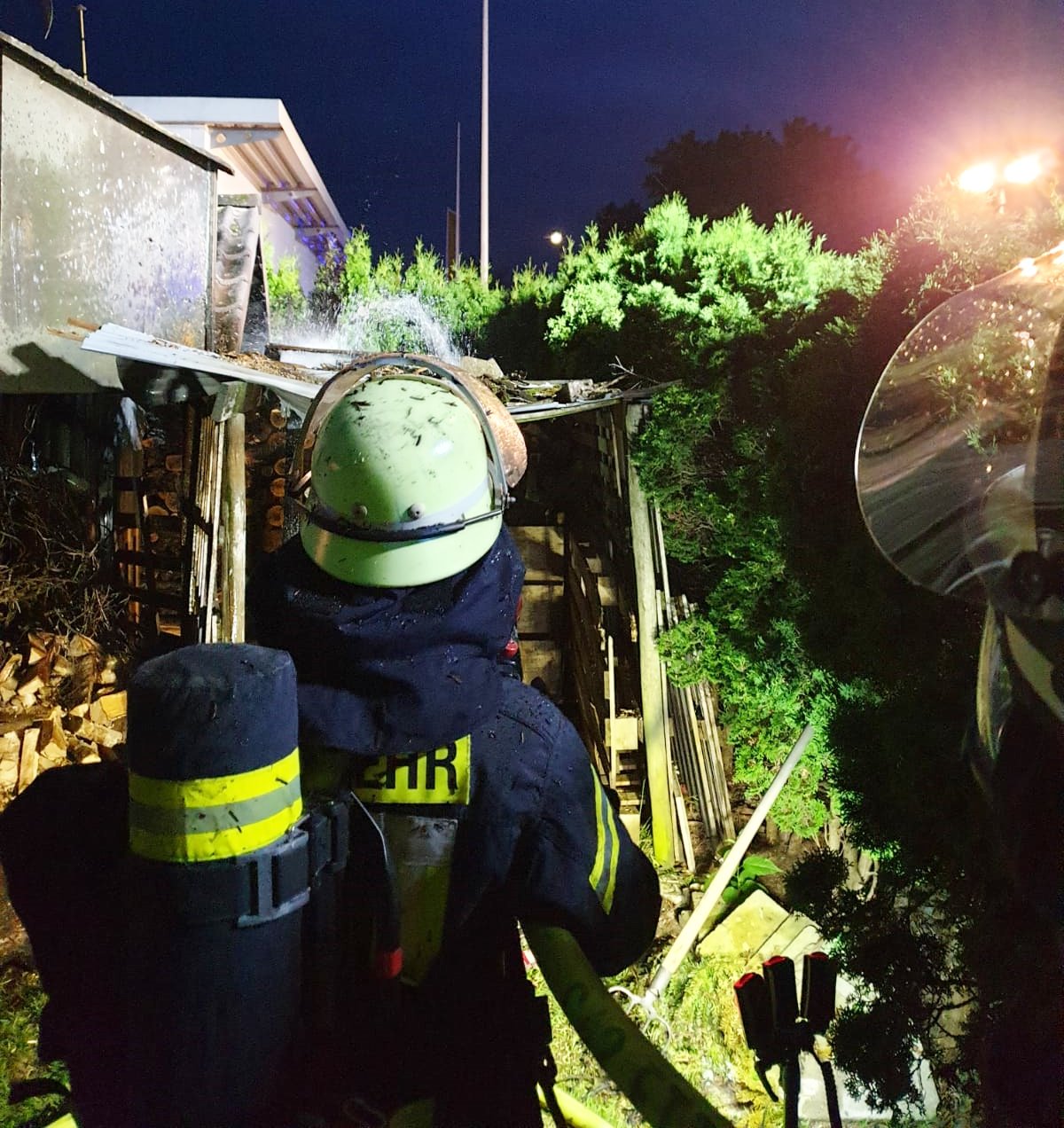 Beim Eintreffen der Feuerwehr stand der Besitzer mit einem Gartenschlauch "bewaffnet" auf dem Wellblechdach der Kombination aus Geräteschuppen, Baumhaus und Holzlager und hielt die Flammen in Schach.