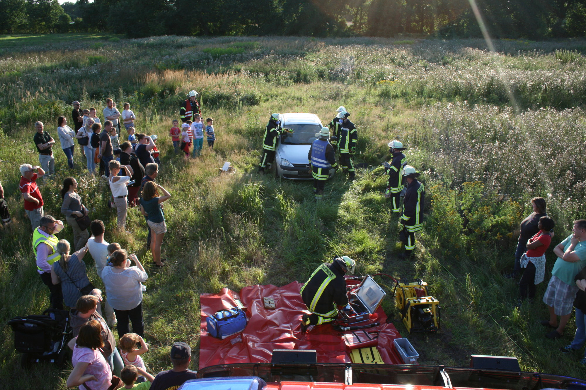 Die Wehren übten unter anderem die Herstellung der Wasserversorgung und die Personenrettung mit Hilfe der Steckleiter. Mit schwerem Gerät wurde der Pkw zerlegt. Mit der Übung wollte die Feuerwehr nicht nur an den Stadtbrand von 1911 erinnern, sondern auch für das Ehrenamt werben und das Leistungsspektrum der Wehren deutlich machen. Gegen 20 Uhr rückten die acht Wehren wieder ein.