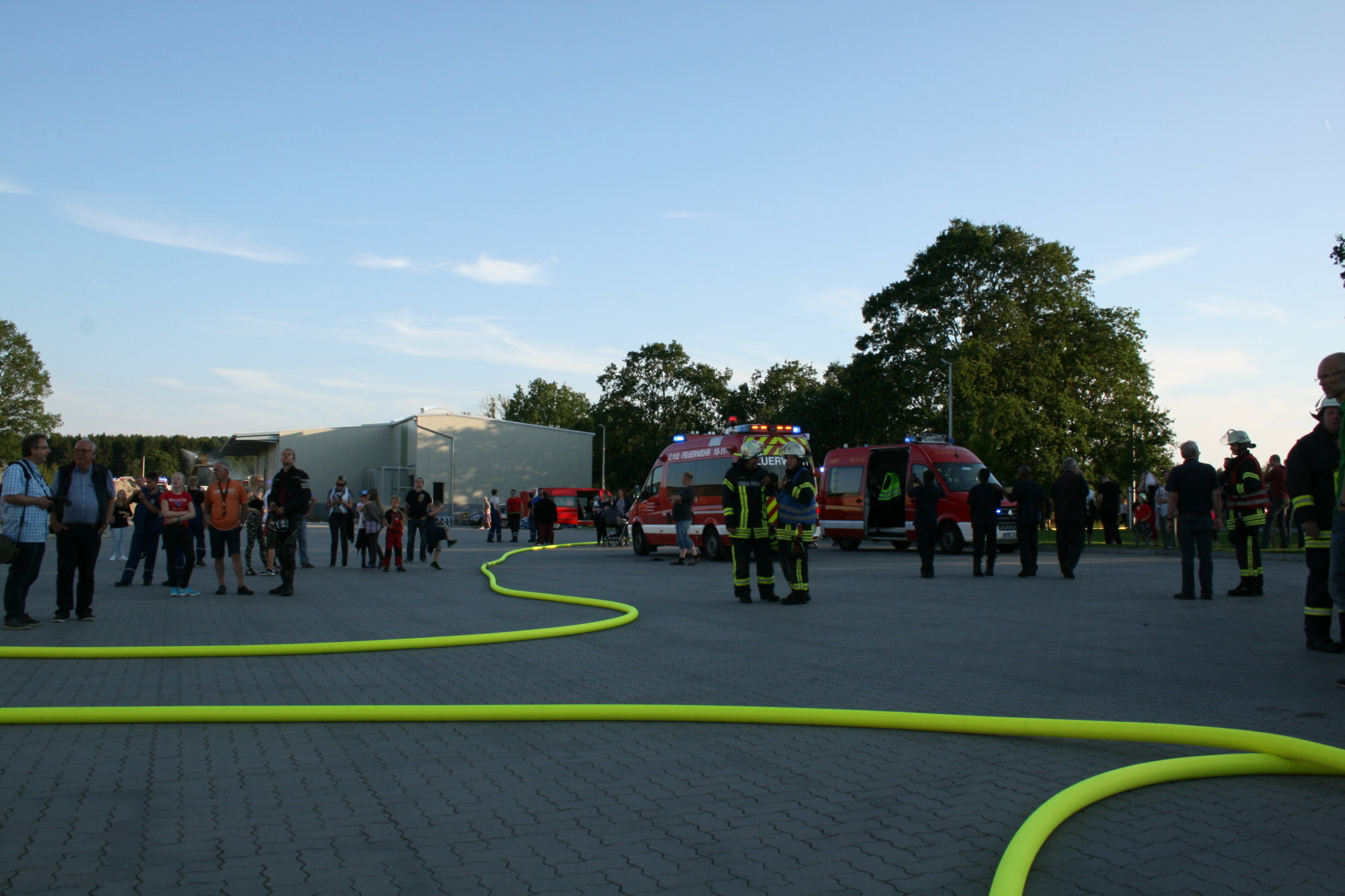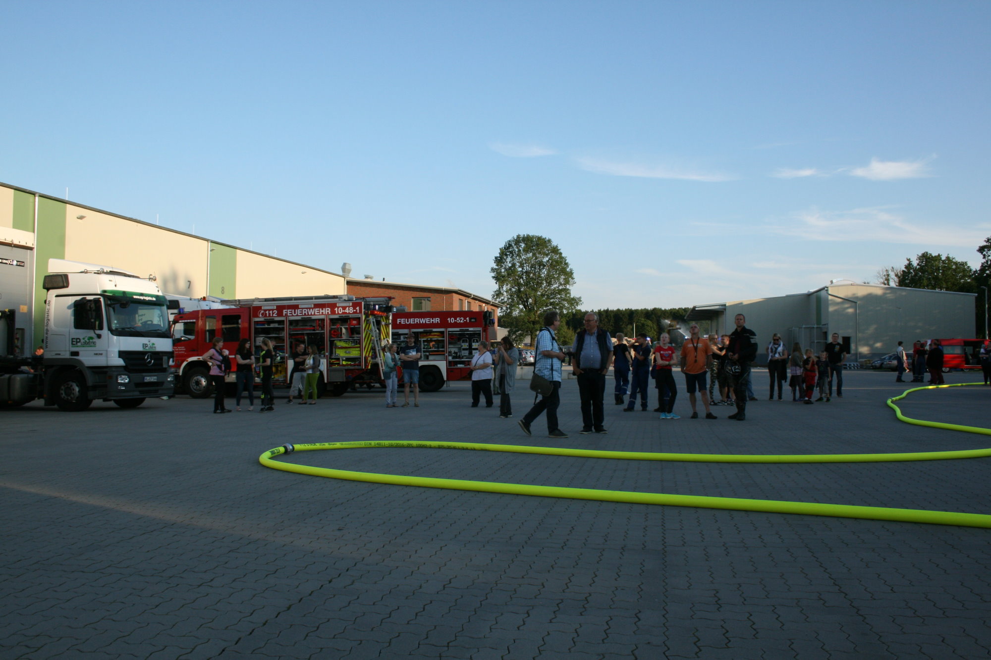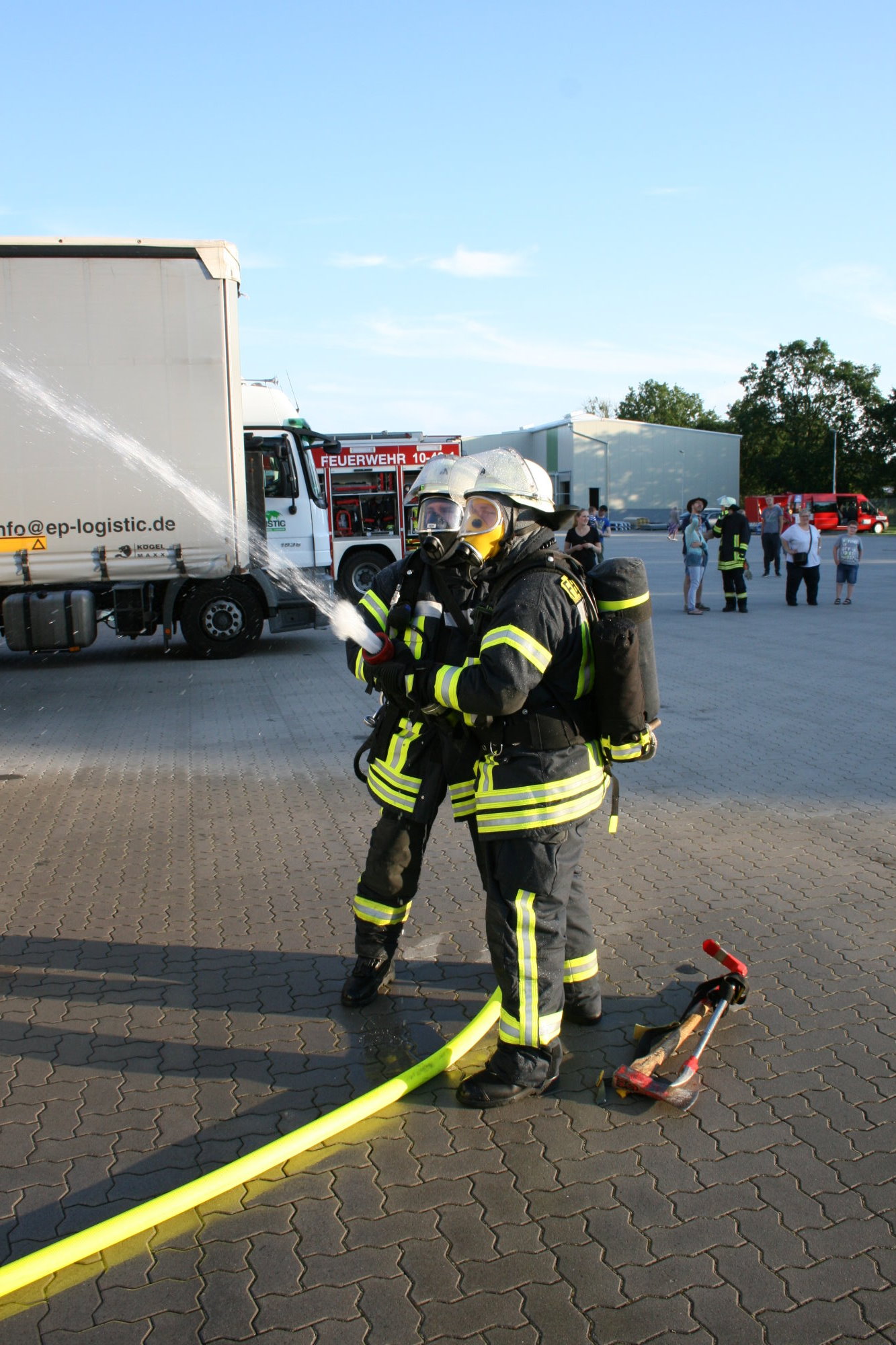 Das Szenario: In den Hallen von EP Logistic ist ein Feuer ausgebrochen. Mehrere Personen werden in den Gebäuden vermisst. Eine Person ist unter einem Lkw eingeklemmt. Vor dem Tor hat sich zeitgleich ein Verkehrsunfall ereignet, eine Person ist in dem Wrack gefangen und schwer verletzt. An drei Orten stellten die Einsatzkräfte ihr Können unter Beweis, die vielen interessierten Schaulustigen konnten Fragen stellen. Der stellvertretende Stadtbrandmeister Hans-Jürgen Neumann aus Ovelgönne erklärte am Mikro das Geschehen.