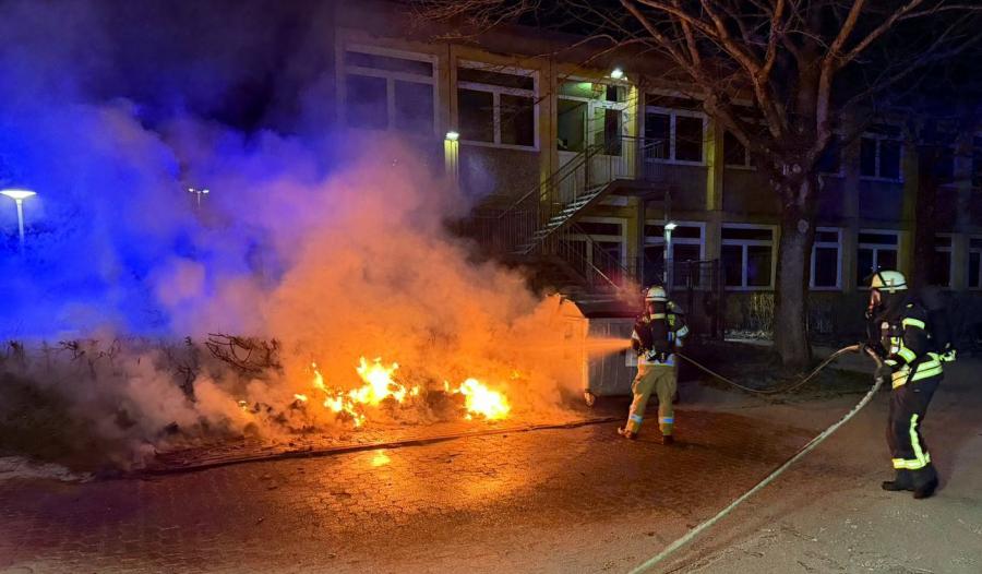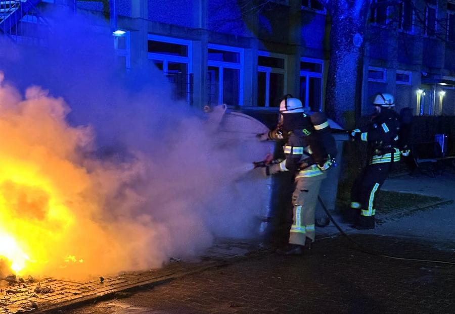 Wieder einmal standen am frühen Sonntagmorgen am Schulzentrum Süd Müllbehälter in Flammen. Dieses Mal betraf es eine komplette Reihe der rollbaren Container an der Berliner Straße. Da die Flammen weithin sichtbar waren, kam es noch zu einem weiteren Anruf, in dem eine Anwohnerin aus der Dresdener Straße hellen Feuerschein meldete. Diese Meldung konnte wenig später aufgeklärt werden.