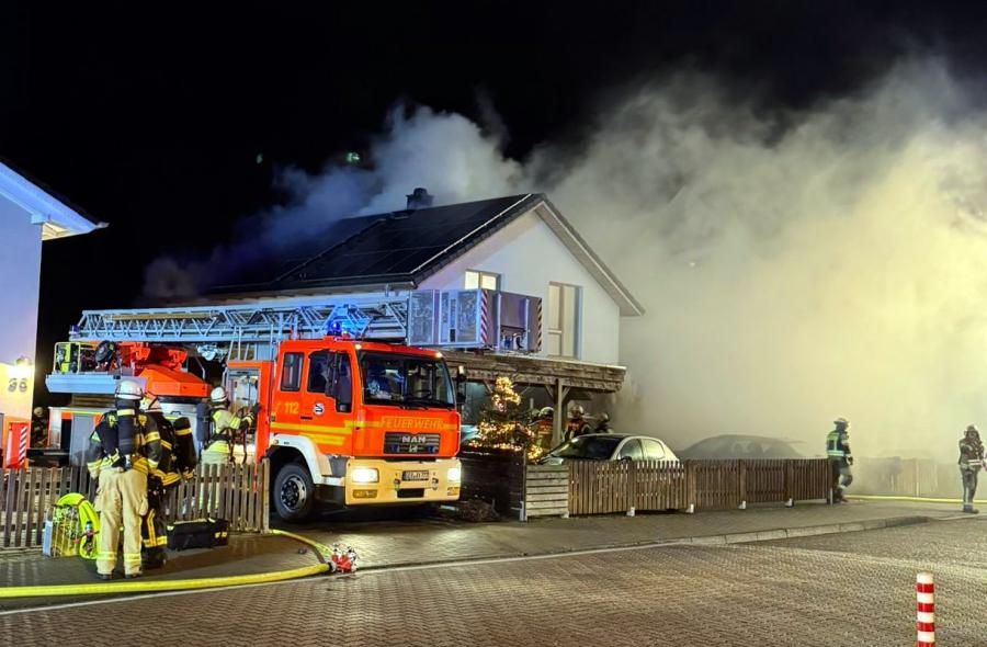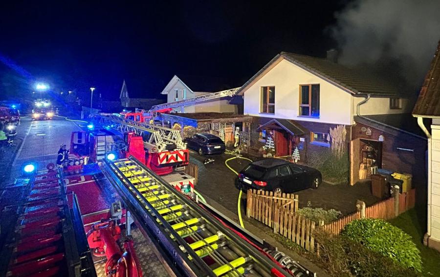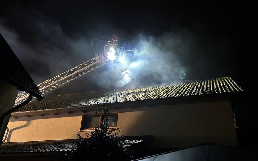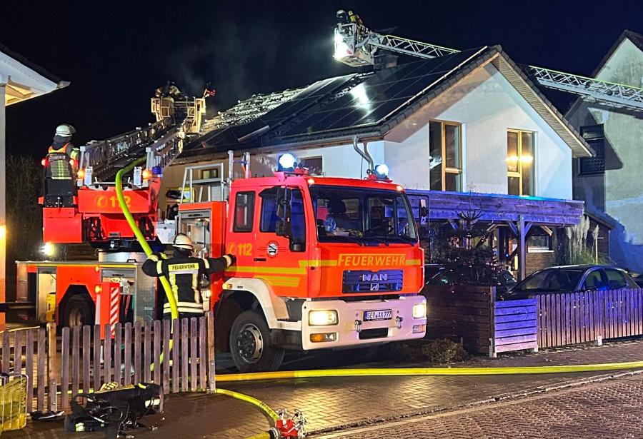Beim Eintreffen der Einsatzkräfte berichteten mehrere Zeugen davon, dass ein Feuerwerksgegenstand, vermutlich ein Seenotsignal, unter die auf dem Schrägdach montierte Solaranlage geflogen sei und diesen in Brand gesteckt habe. Zu erkennen war ein Feuer im Bereich der Traufe, welches sich bereits in die Holz- oder Kokosfaser der Einblasdämmung des hoch ökologischen gebauten Dachstuhls ausgebreitet hatte. Bereits von außen waren erste Glutnester zu erkennen, so dass schnell entschieden wurde, auf “Feuer 3” zu erhöhen. Die Ortsfeuerwehren Immenbeck und Ottensen rückten im Zuge der Nachalarmierung aus. Eine zweite Drehleiter kam wenig später aus Harsefeld dazu.
