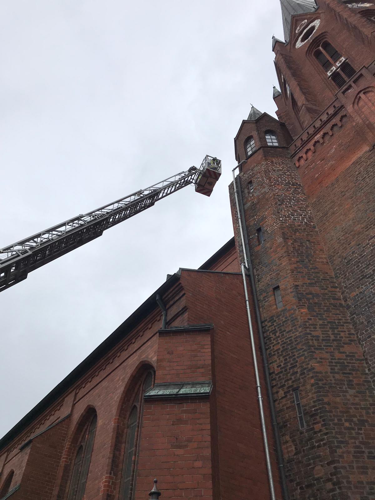 Vor Ort wurde den Kräften eine heruntergefallene Dachpfanne gezeigt. Vom Korb der Drehleiter erkundeten die Einsatzkräfte die Dächer in der unmittelbaren Umgebung. Zunächst am Dach der Kirche. Dort konnte keine Feststellung gemacht werden. Auf der gegenüberliegenden Seite, am Dach des ehemaligen Feuerwehrhauses fehlte in der obersten Reihe eine Dachpfanne. Die Kräfte klärten mit dem Hausmeister, ob zufälligerweise noch eine Reservepfanne vorhanden sei. Da dies nicht der Fall war, wurde aus Holz ein Provisorium am Dach gebaut, dass dem böigen Wind keine weitere Angriffsfläche bot. Mit Folie konnte das Loch im Dach verschlossen werden.