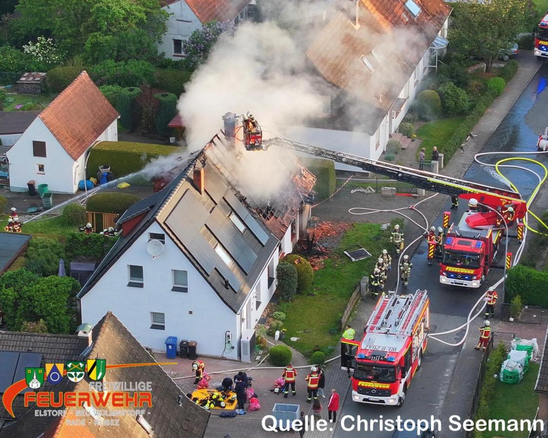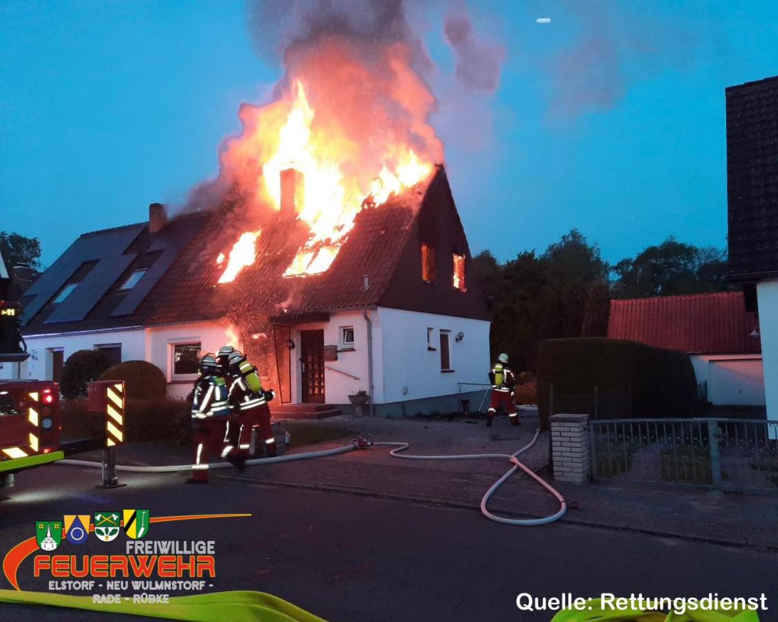 In den frühen Morgenstunden des 3. Mai kam es in der Hindenburger Straße in Neu Wulmstorf zu einem ausgedehnten Brand in einer Doppelhaushälfte. Bereits die ersten Anrufer meldeten der Rettungsleitstelle, dass das gesamte Dachgeschoss in Vollbrand stehe. Zu diesem Zeitpunkt war unklar, ob sich noch Personen im Gebäude befanden. Daher wurden neben der Ortsfeuerwehr Neu Wulmstorf auch zwei Rettungswagen und zwei Notärzte alarmiert.