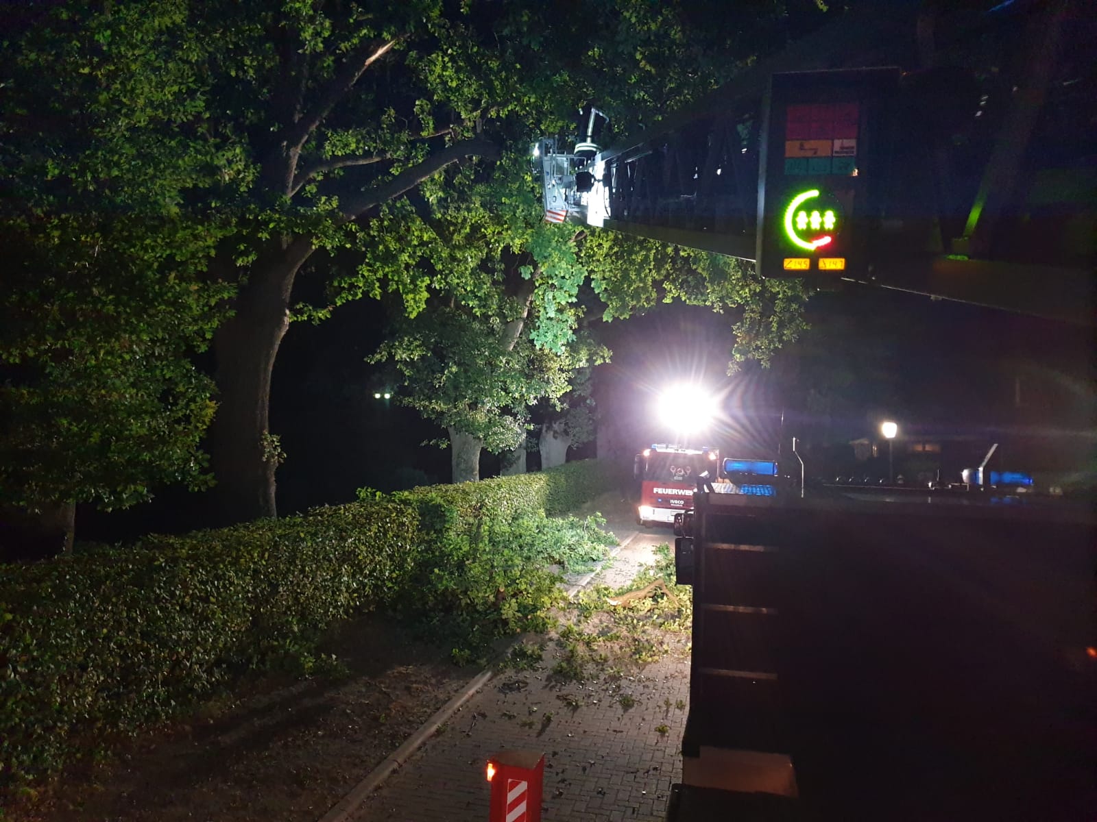 Die Buxtehuder Einsatzkräfte brachten an der Einsatzstelle das Hubrettungsgerät in Stellung. Da die gebrochenen Äste in der Krone nicht mehr festsaßen, brauchte keine Säge eingesetzt werden. Die betroffenen Äste konnten von Hand aus dem Baum gezogen werden.
