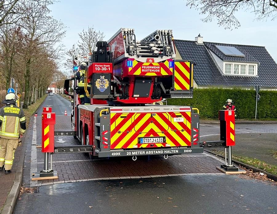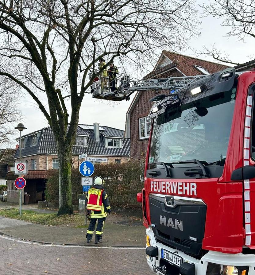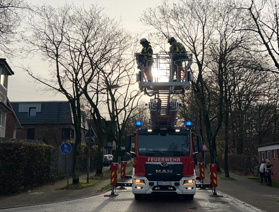Zur Abarbeitung der Einsatzstelle wurden beide Züge der Ortsfeuerwehr Buxtehude hinzu beordert. Aus dem Korb der Drehleiter wurden die Gefahrenstellen beseitigt.