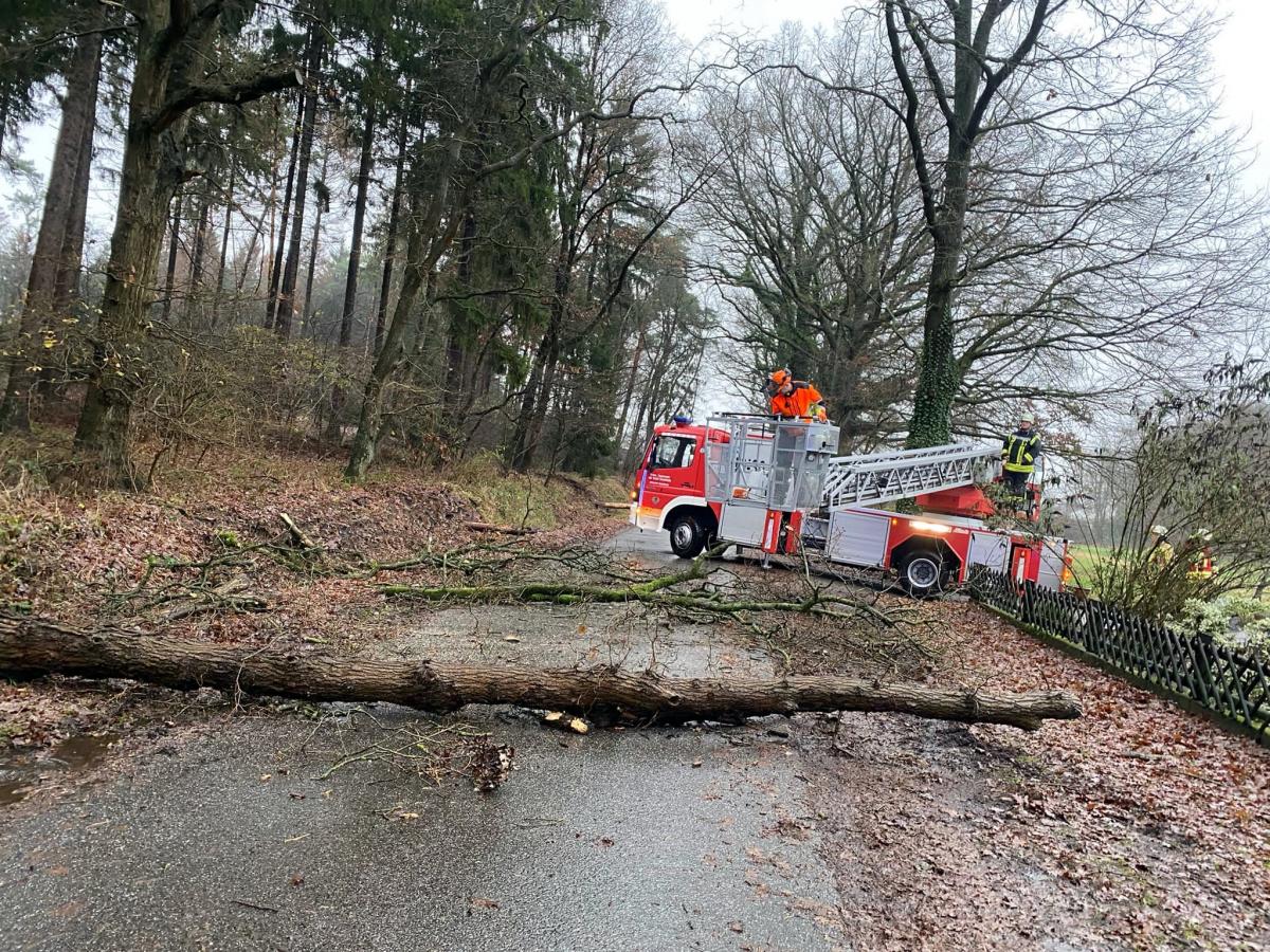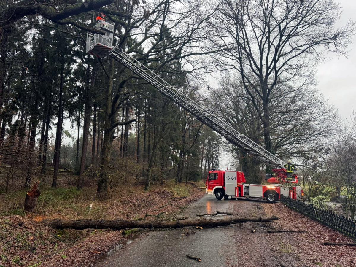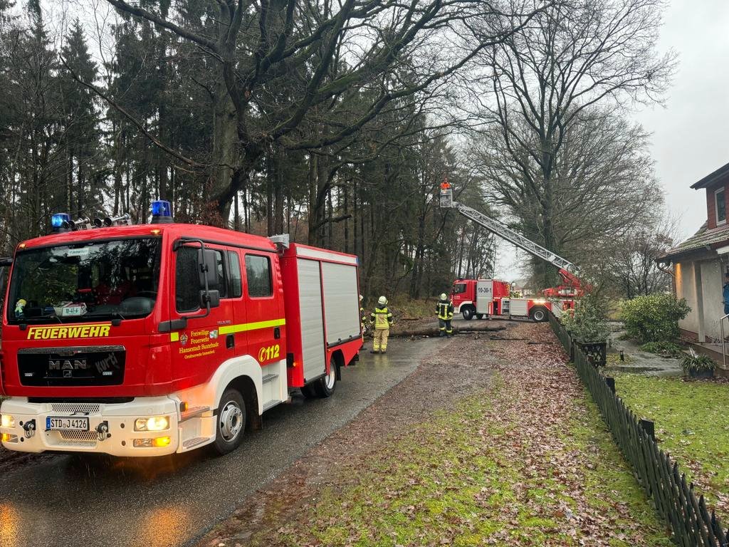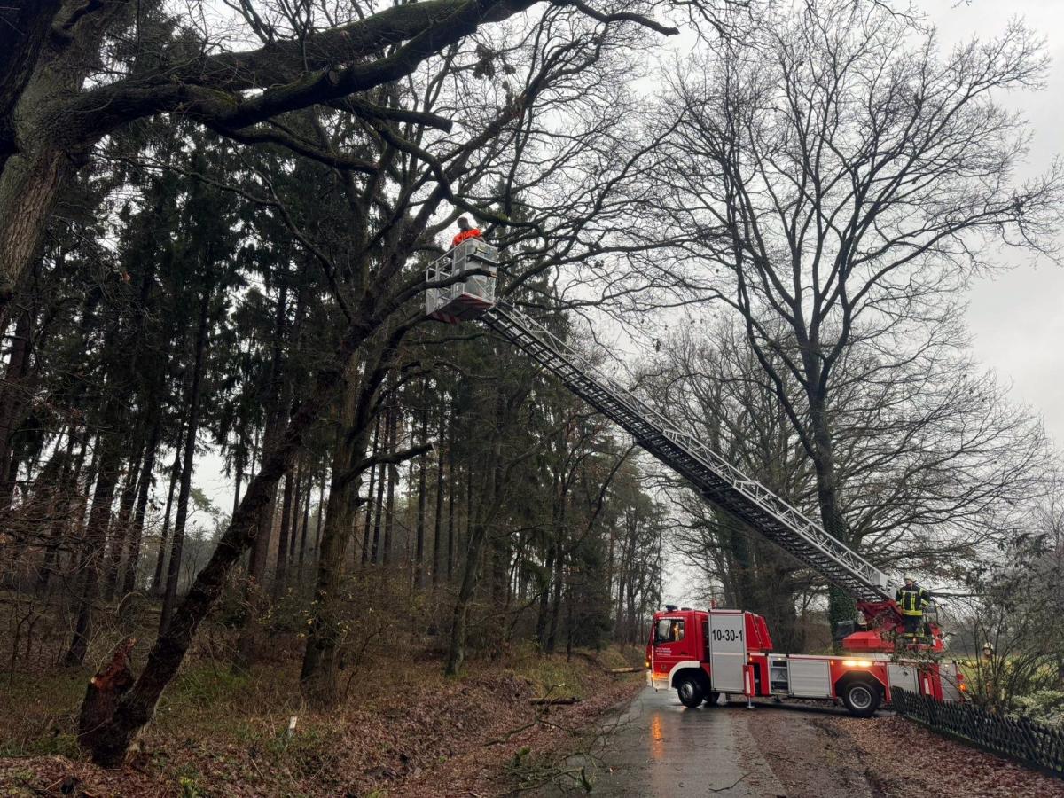 Auf dem Rückweg von einem Werkstatttermin fiel zwei Einsatzkräften der Ortsfeuerwehr Immenbeck am Donnerstagmorgen in der Straße “An den Fuhren” ein Baum auf, welcher bereits abgebrochen auf dem Boden stand und nur noch in den Ästen eines weiteren Baumes hing. Da der morsche Stamm jederzeit umstürzen konnte, wurde die Drehleiter der Ortsfeuerwehr Buxtehude (Zug I) zur Unterstützung gerufen. Währenddessen wurde die Straße gesperrt und somit die Einsatzstelle gesichert. Mit Hilfe einer Kettensäge wurde dann aus dem Korb der Drehleiter der Stamm Stück für Stück abgetragen und anschließend die Straße gereinigt.