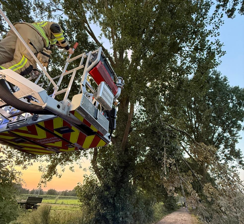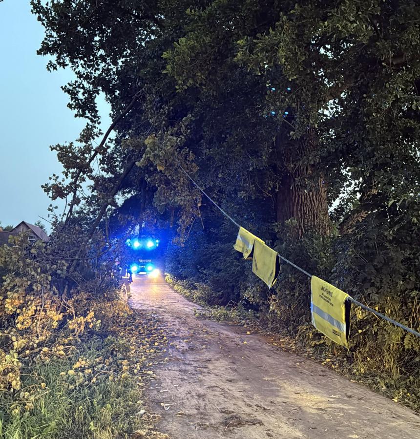 Die alarmierten Feuerwehrkräfte aus Dammhausen und vom Zug I der Ortsfeuerwehr Buxtehude setzten die Drehleiter ein, um an dem angebrochenen Ast eine Endlosschlinge zu befestigen. Mit der Seilwinde vom Rüstwagen wurde dann langsam Spannung auf den Ast gegeben. Bei 2,5 to Zug brach der Ast schließlich vollständig ab und fiel zu Boden. Dort wurden die Arbeiten mittels Motorkettensäge fortgesetzt, der Ast zerkleinert und beiseitegelegt.