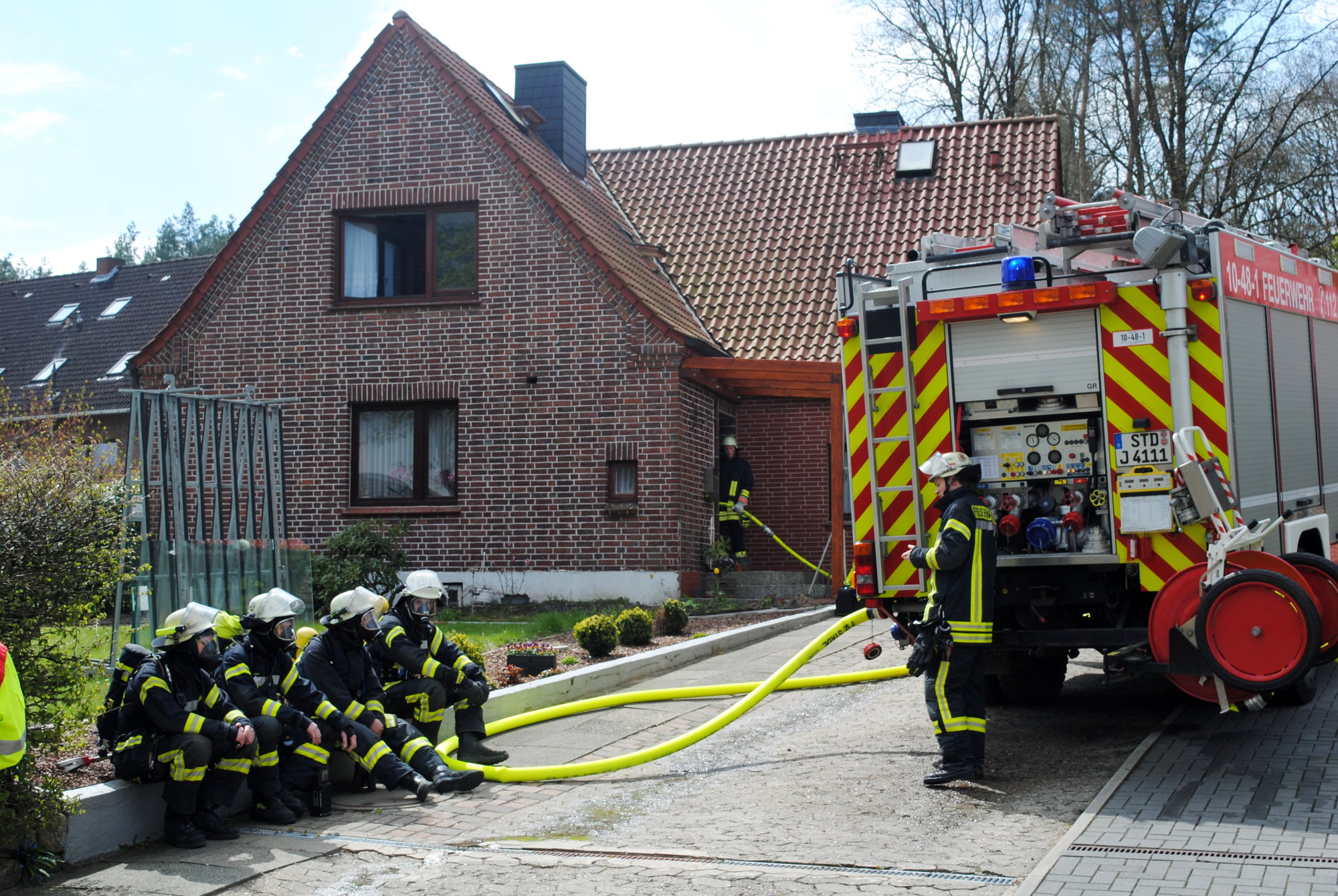 Zunächst wurden die Kräfte aus Immenbeck, Ovelgönne/Ketzendorf und vom Zug I zu einem Wohnungsbrand im Alten Postweg alarmiert. Anwohner hatten einen lauten Knall aus dem Schlafzimmer des Einfamilienhauses gehört.