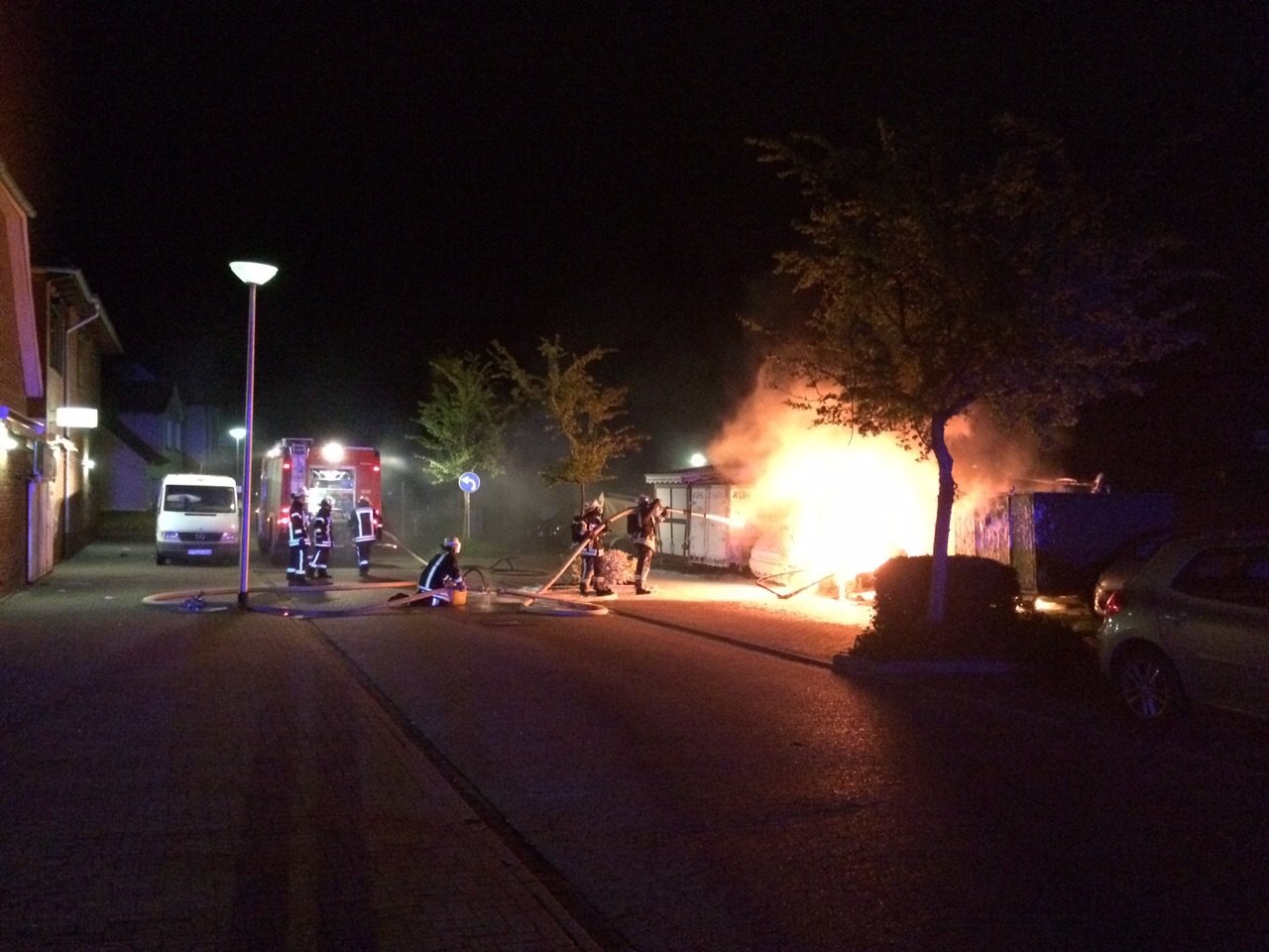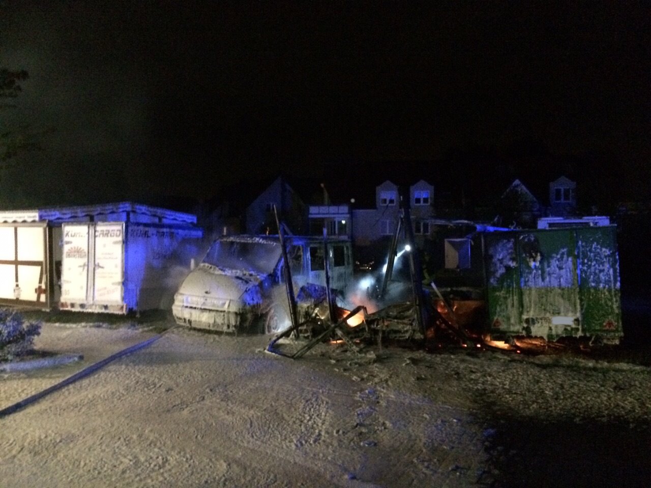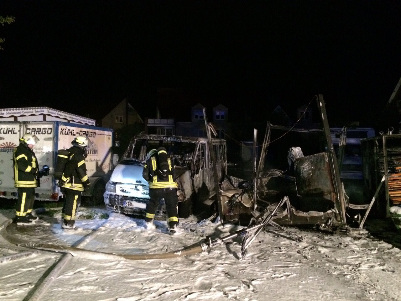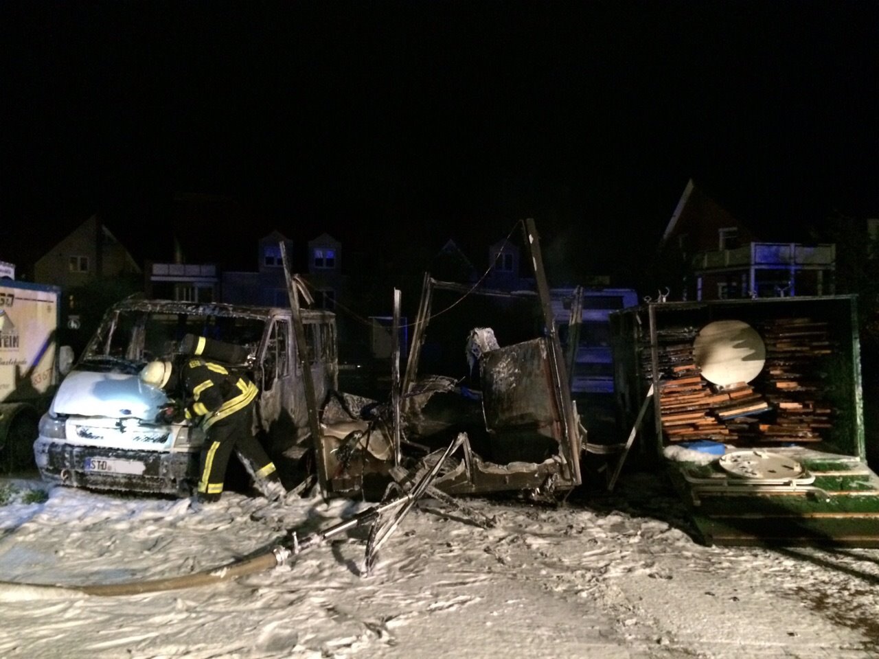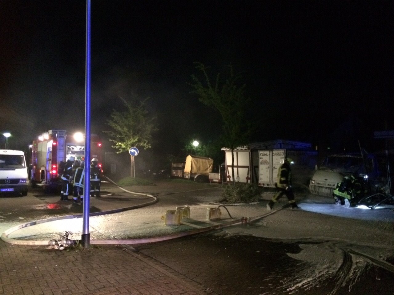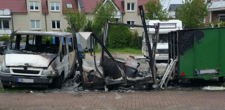 Auf einem Parkplatz in unmittelbarer Nähe zum Schafmarktplatz standen beim Eintreffen der Einsatzkräfte vom Zug II der Ortsfeuerwehr Buxtehude ein Verkaufsanhänger und ein daneben geparkter Mannschaftsbus eines Buxtehuder Sportvereins in Vollbrand. Zwei links und rechts davon stehende Anhänger wurden durch überschlagende Flammen zum Teil schwer beschädigt.