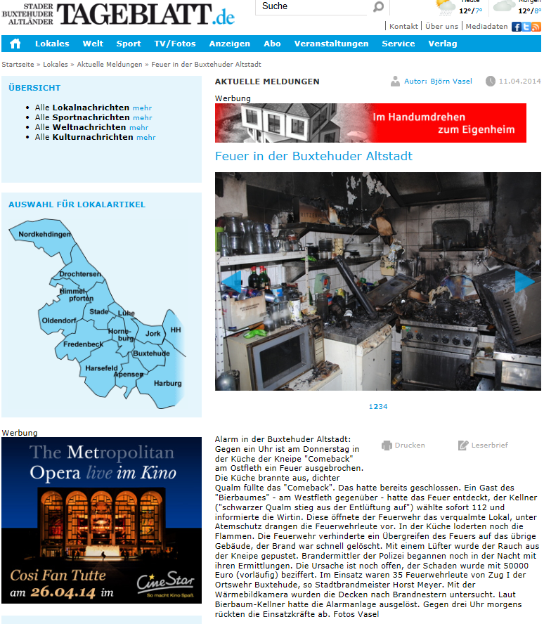 Zu einem Feuer in der Buxtehuder Altstadt wurde in der Nacht zu Donnerstag der Zug I der Ortsfeuerwehr Buxtehude alarmiert. Besucher der Gaststätte "Bierbaum" am Westfleth hatten eine starke Rauchentwicklung aus einer Kneipe am Ostfleth erkannt und umgehend Feuerwehr und Wirtin der betroffenen Lokalität verständigt. Diese öffnete schließlich den anrückenden Einsatzkräften die Ladentür der bereits geschlossenen Kneipe.
