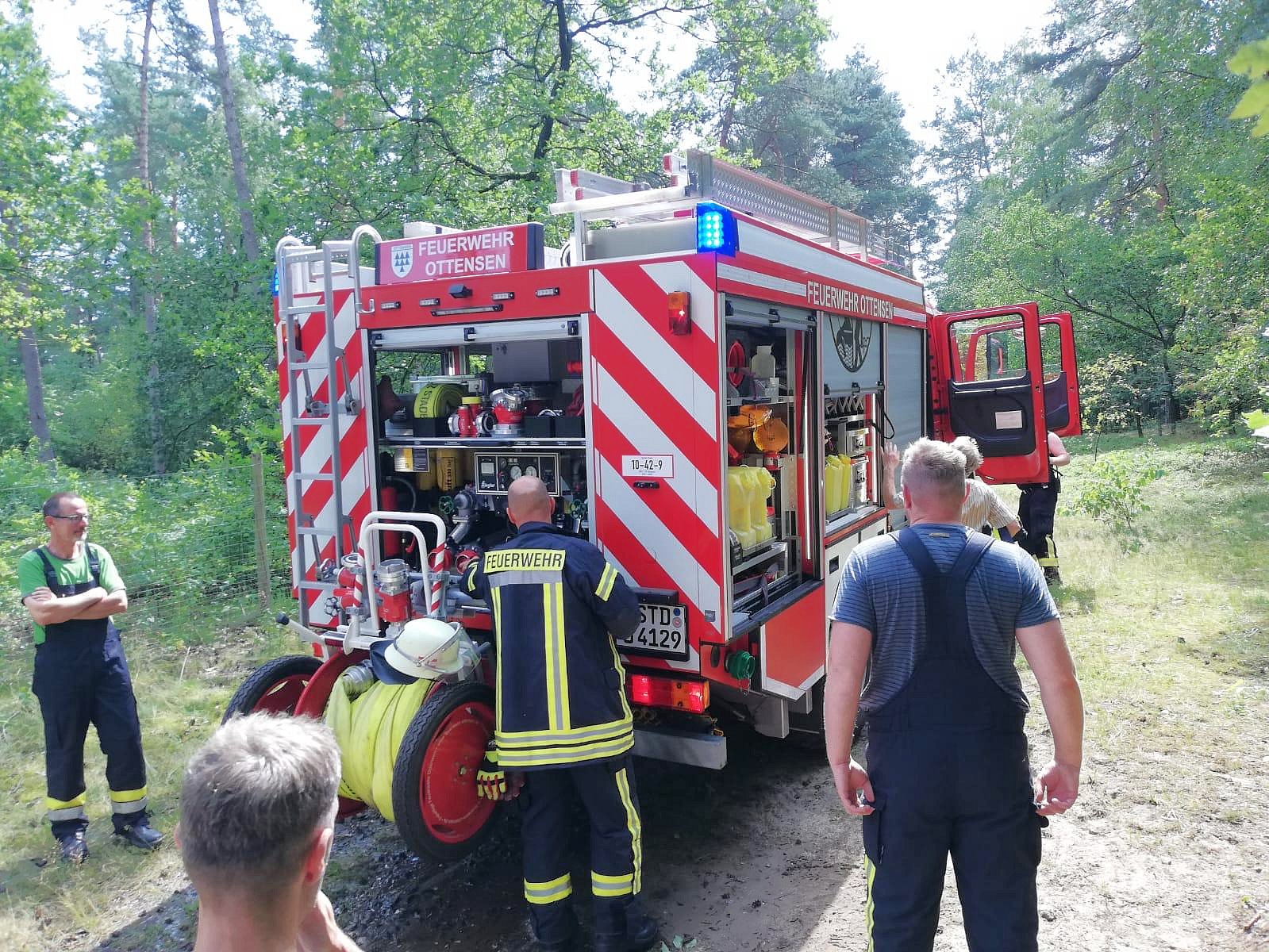 Vor Ort wurde von den eingesetzten Kräften des Ottensener Löschfahrzeuges ein Angriff mit Löschrucksäcken und Kleinlöschgerät vorgenommen. Die Kräfte vom Zug II waren währenddessen am Waldrand in Bereitstellung gegangen und schicken drei Kräfte mit Wärmebildkamera vor, zur Kontrolle der Brandstelle.
