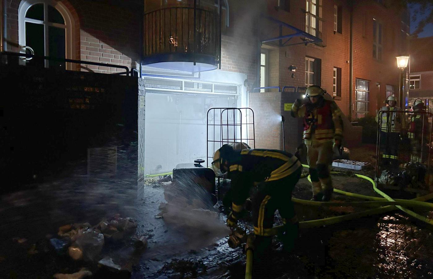 Ein Brand in einer Tiefgarage am Nordviver sorgte am frühen Freitagabend für einen Vollalarm beider Züge der Ortsfeuerwehr Buxtehude. Laut Einsatzmeldung sollte ein Feuer im Müllraum ausgebrochen sein. Die angenommene Lage bestätigte sich vor Ort. Dichter Rauch drang aus der Tiefgarage ins Freie. Die Einsatzkräfte gingen mit einem Atemschutztrupp in den Kellerbereich vor und fanden das Feuer im beschriebenen Müllraum. Unter Nullsicht wurde das Feuer mit einem C-Rohr bekämpft. Das abgelöschte Brandgut wurde für weitere Löschmaßnahmen ins Freie gebracht.