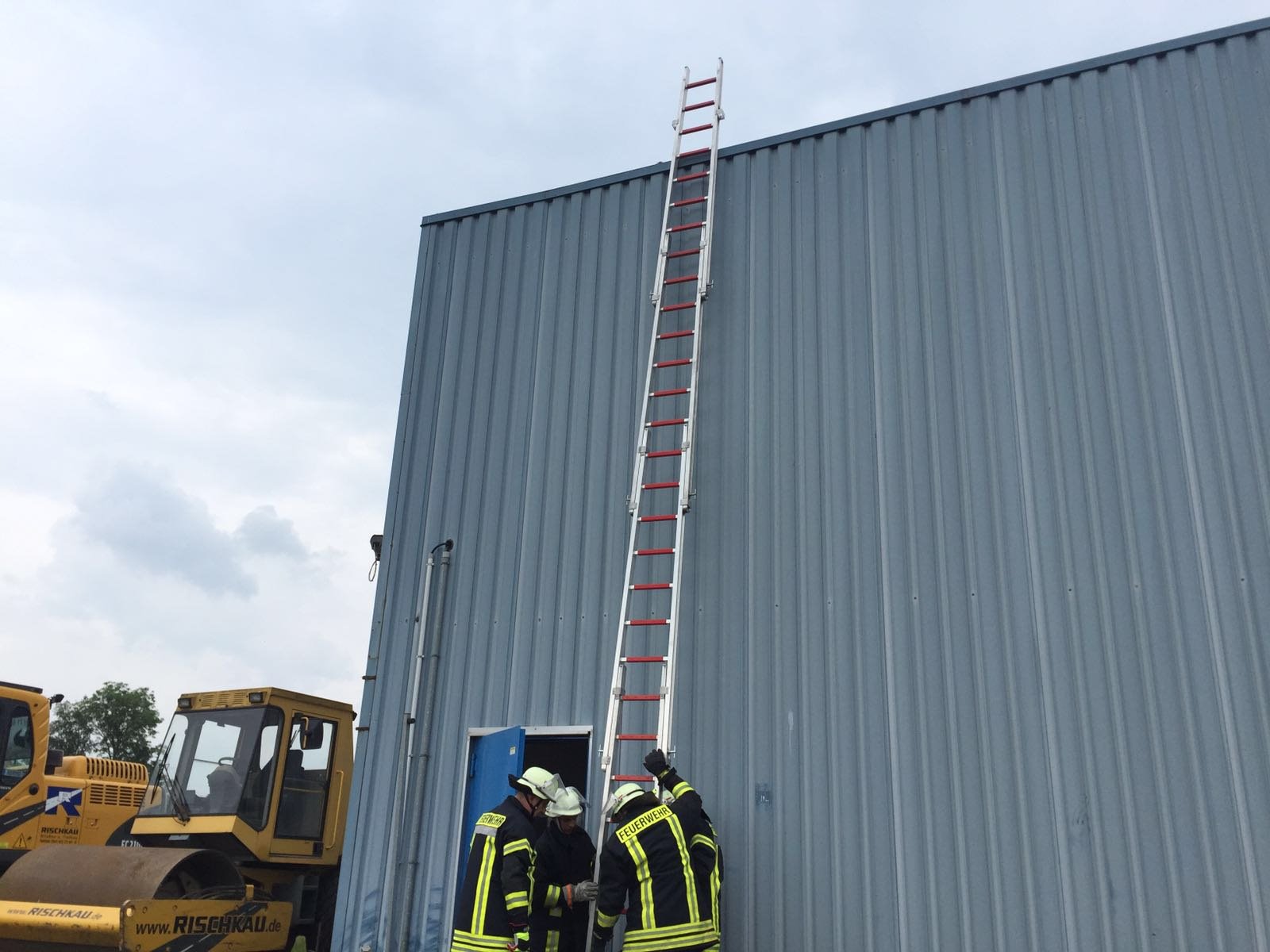 Während die Feuerwehren ausrückten, wurde der gesamte Betrieb durch die verantwortlichen Mitarbeiter evakuiert. Die Übung sollte gleichzeitig das Krisenkonzept des Betriebes auf die Probe stellen. Mehrere Personen wurden schließlich vermisst, die durch die Einsatzkräfte gesucht und gerettet werden mussten. Hiervon waren zwei auf dem Dach der Hallen gefunden worden, die per Dreh- und Steckleiter gerettet wurden. Mehrere Atemschutztrupps drangen zur weiteren Personensuche in die "brennende" und verqualmte Halle vor, fanden zwei aufgrund einer Rauchgasinhalation hustende Verletzte vor, und "löschten" anschließend das "Feuer". Über einen Hydranten und eine Zisterne wurde die Wasserversorgung sichergestellt.