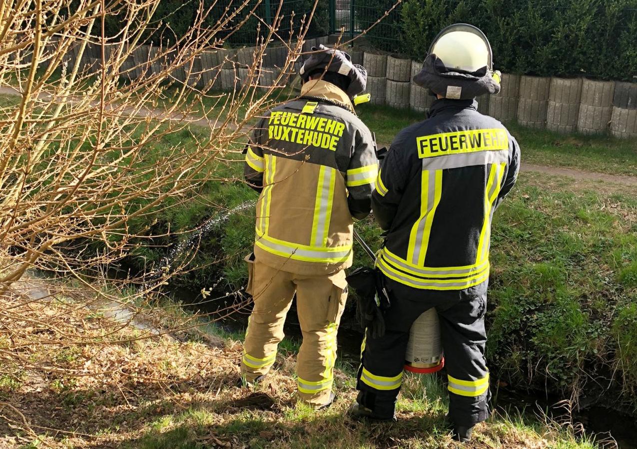 Ein gemeldeter Flächenbrand in der Andersenstraße sorgte am Samstagnachmittag für einen Einsatz des Zuges I der Ortsfeuerwehr Buxtehude. Hinter einem Mehrfamilienhaus stand an einem Wanderweg und Graben eine etwa drei Quadratmeter große Fläche in Flammen.
