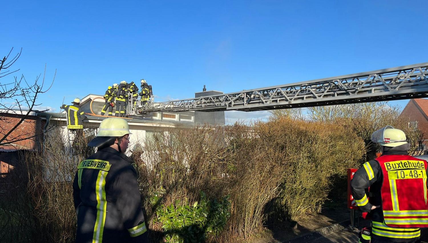 Viel Glück hatten am Samstagnachmittag die Bewohner eines Flachdach Bungalows im Mühlenkampsweg. Rauch stieg aus dem Gebäude auf, als die ersten Einsatzkräfte der alarmierten Ortsfeuerwehren Neukloster, Hedendorf und Buxtehude (Zug I) an der Einsatzstelle eintrafen. Zur Unterstützung der Einsatzleitung traf wenig später auch der Einsatzleitwagen vom Zug II ein.