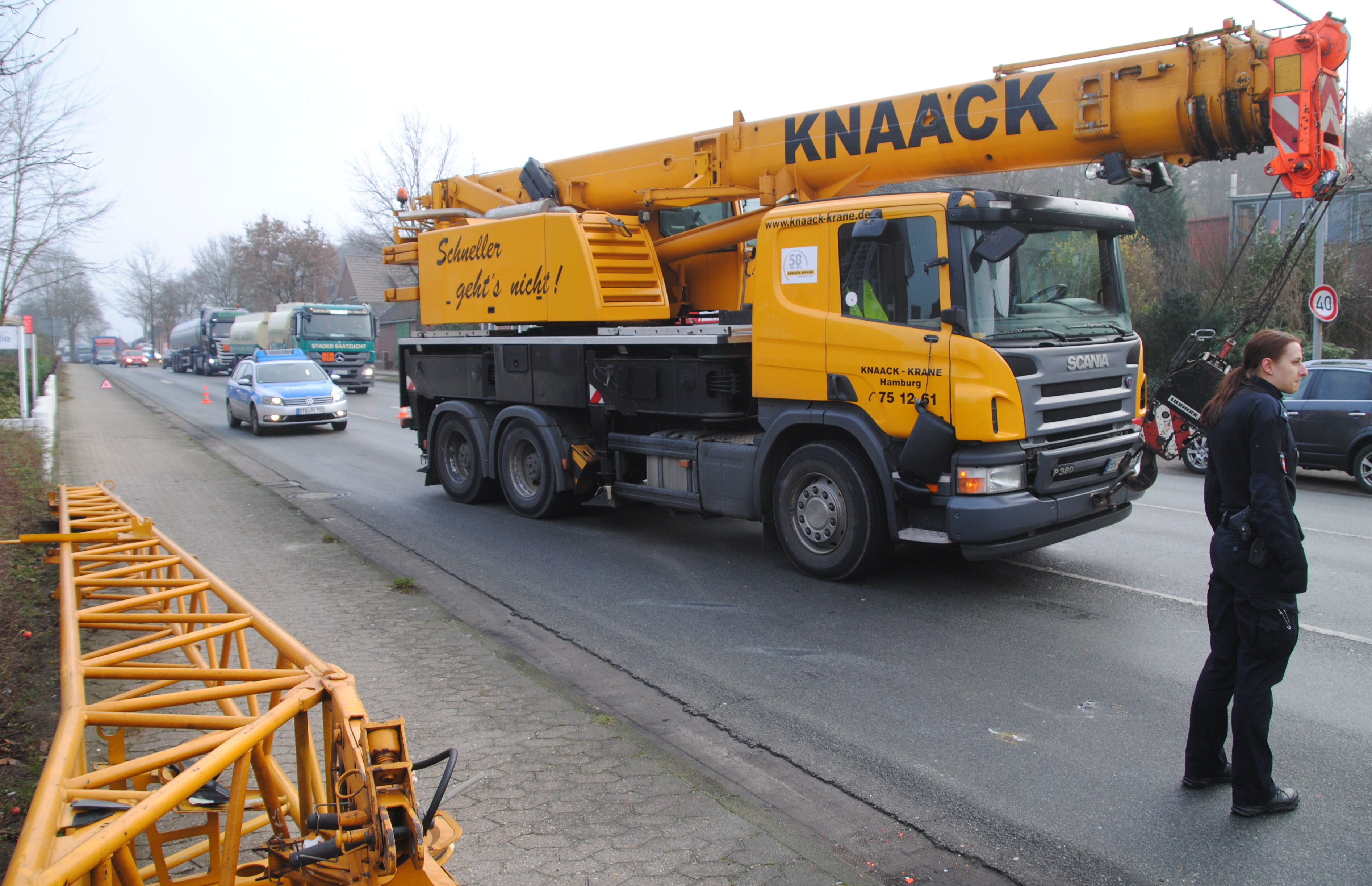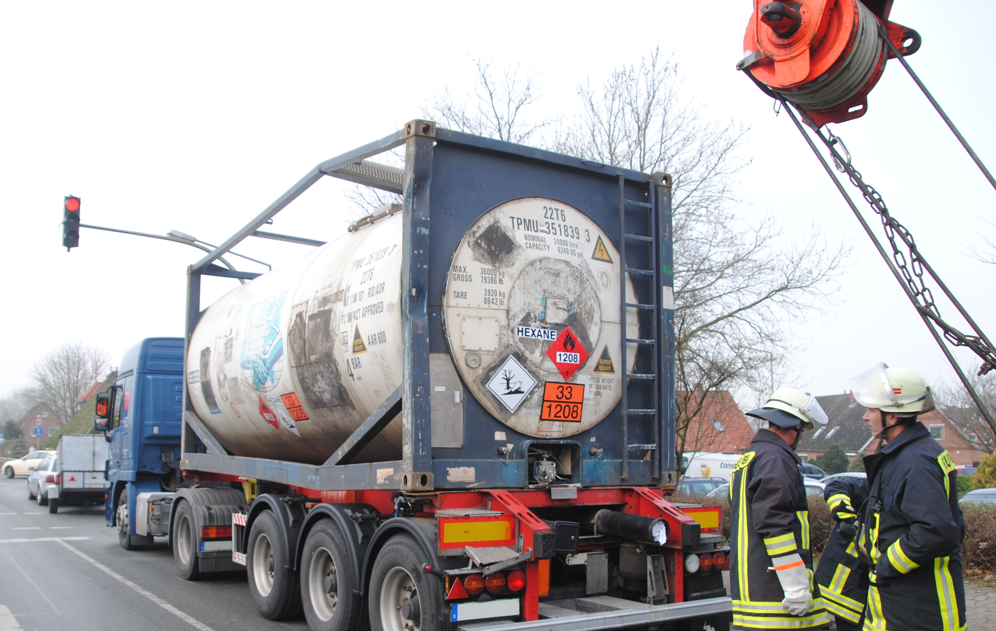 Verkehrsbedingt musste ein Sattelschlepper an der Kreuzung Harsefelder Straße abbremsen. Der nachfolgende Telekran kam nicht mehr rechtzeitig zum Stehen und fuhr auf den mit dem explosiven Gefahrstoff Hexane beladenen Auflieger des Sattelzuges auf.